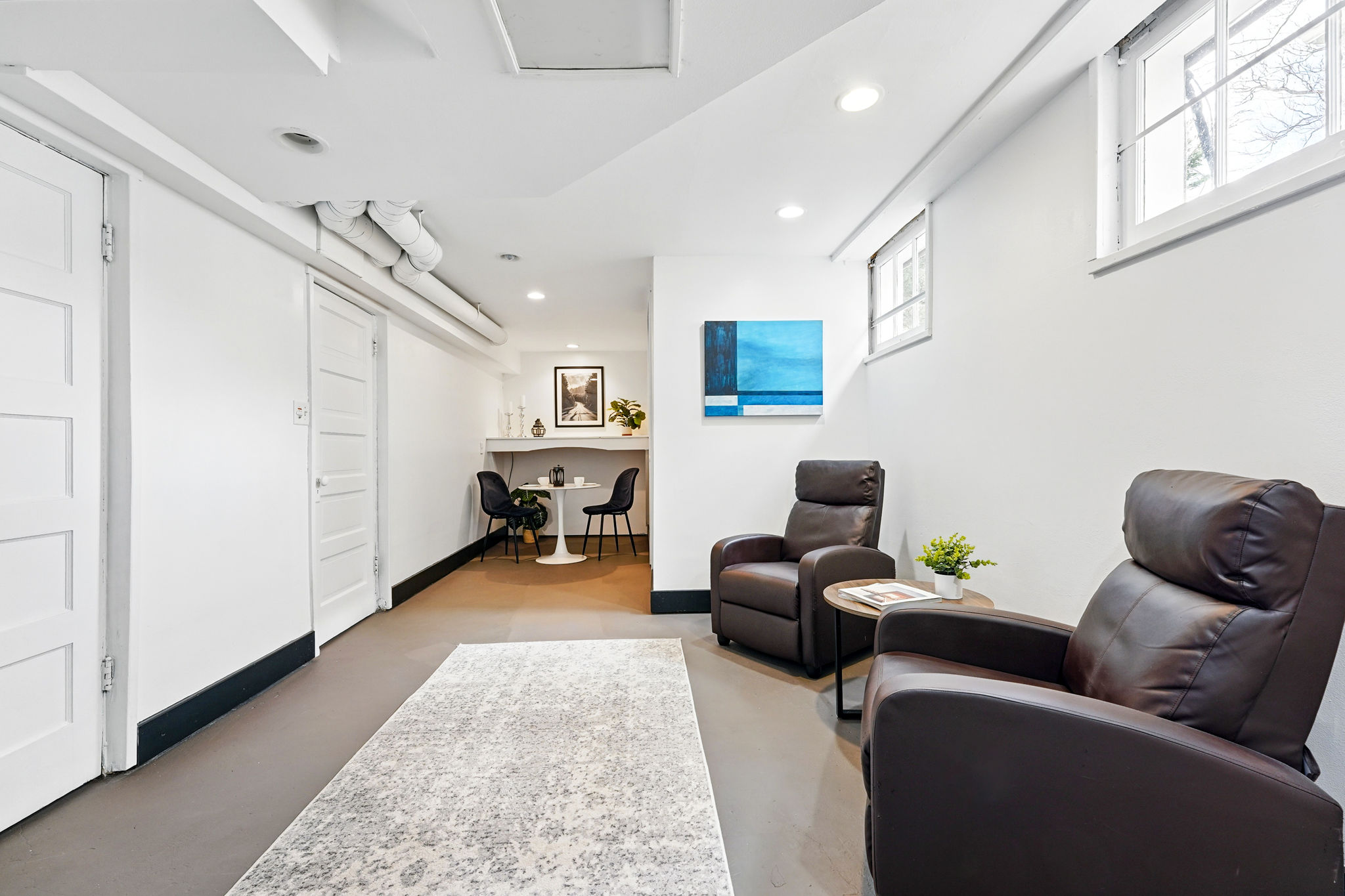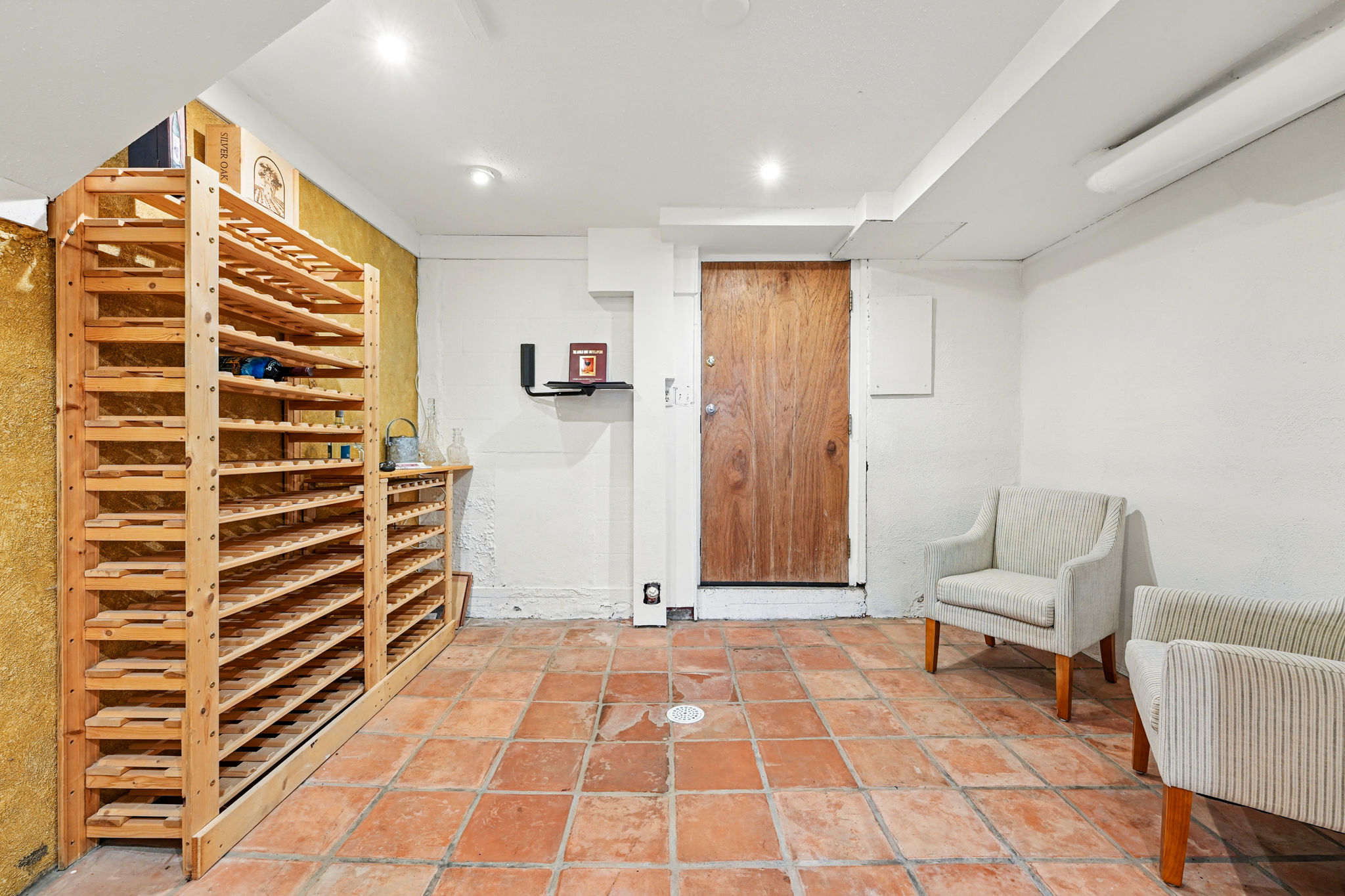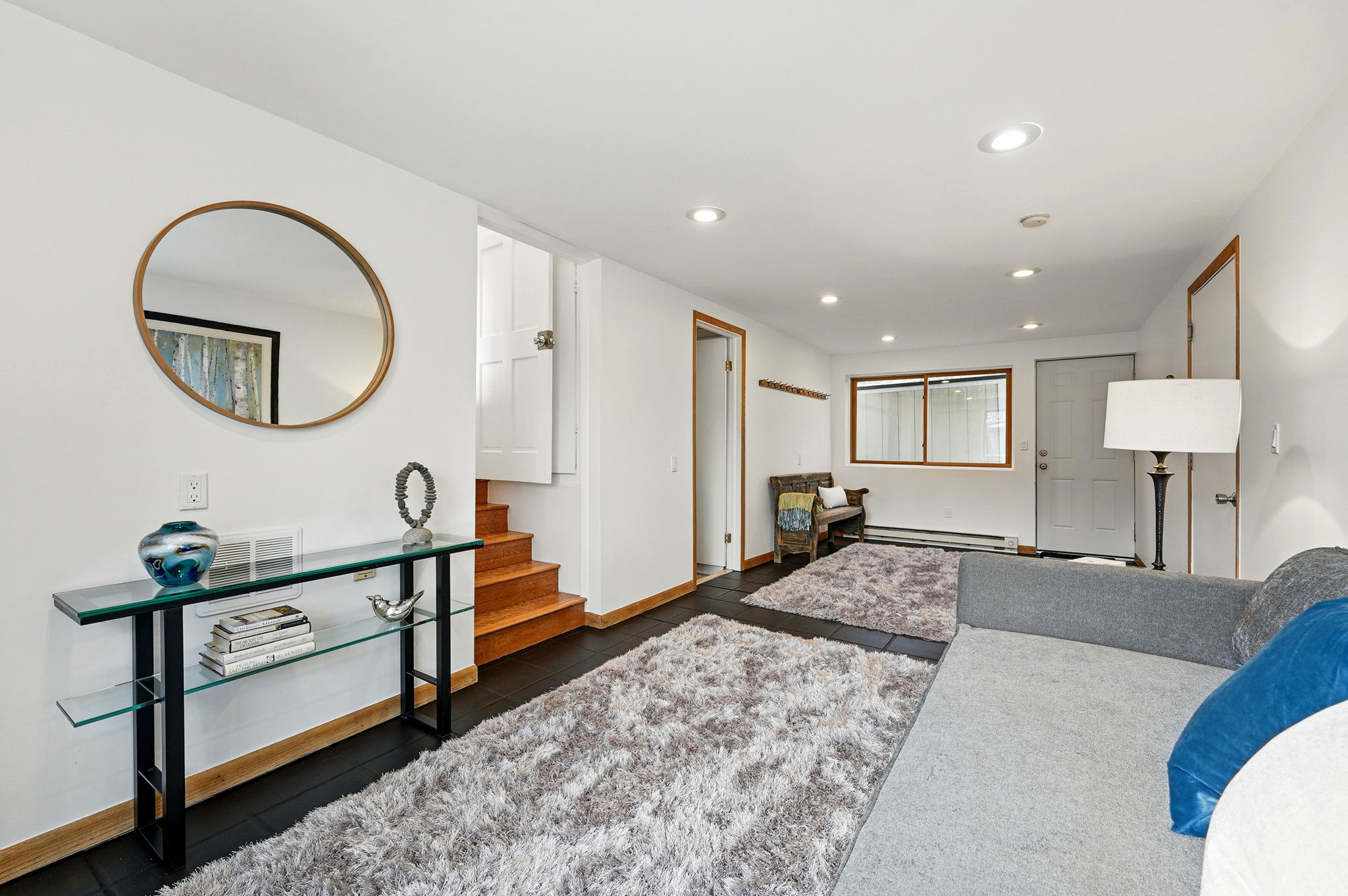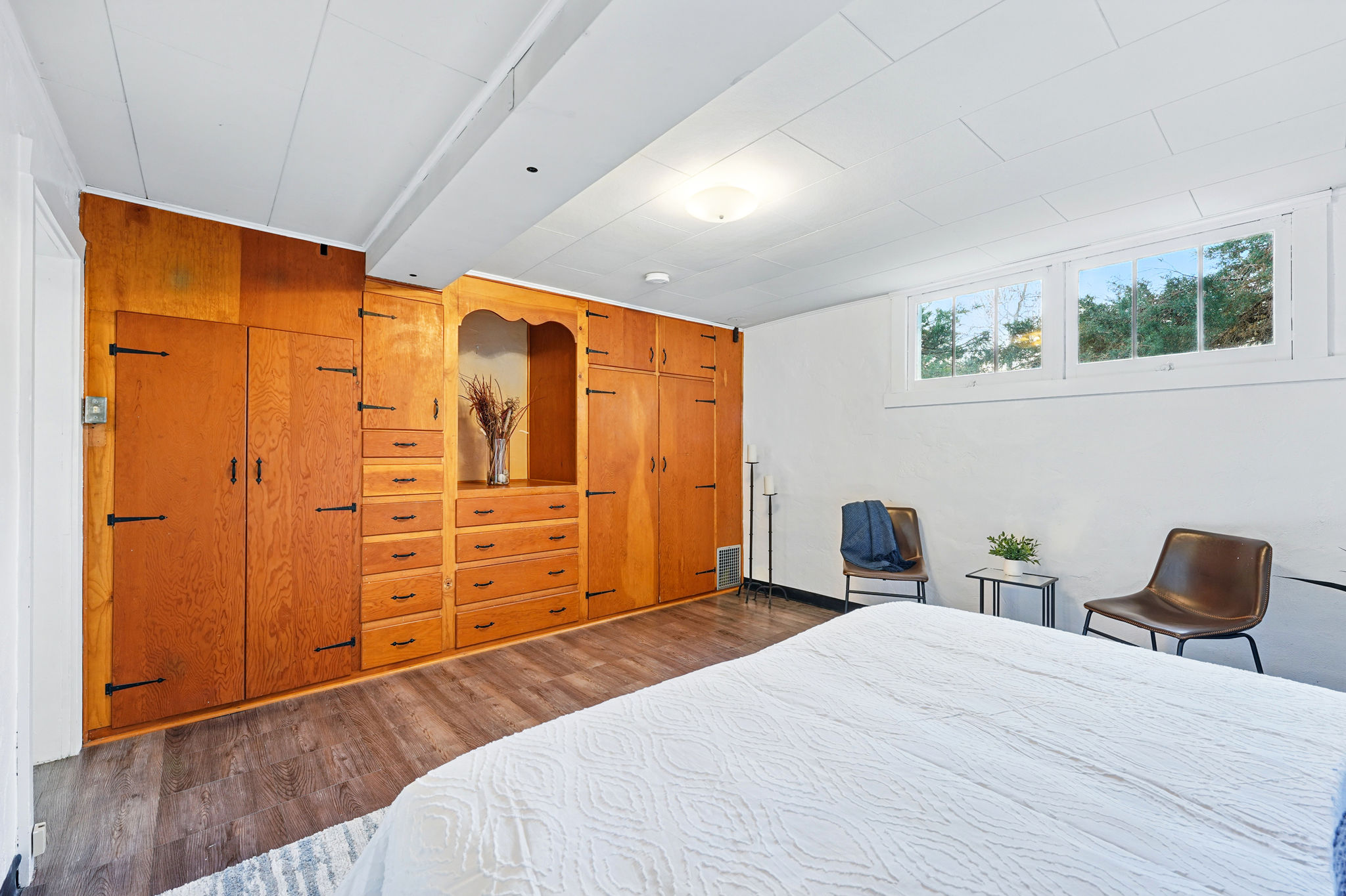 The sellers used the basement for years as an apartment for overflow guests and family. It has a (non-conforming) bedroom with built-in storage, rustic 3/4 bath, exterior entrance, and laundry. Additional rooms could be used for wine, gear, or gym.