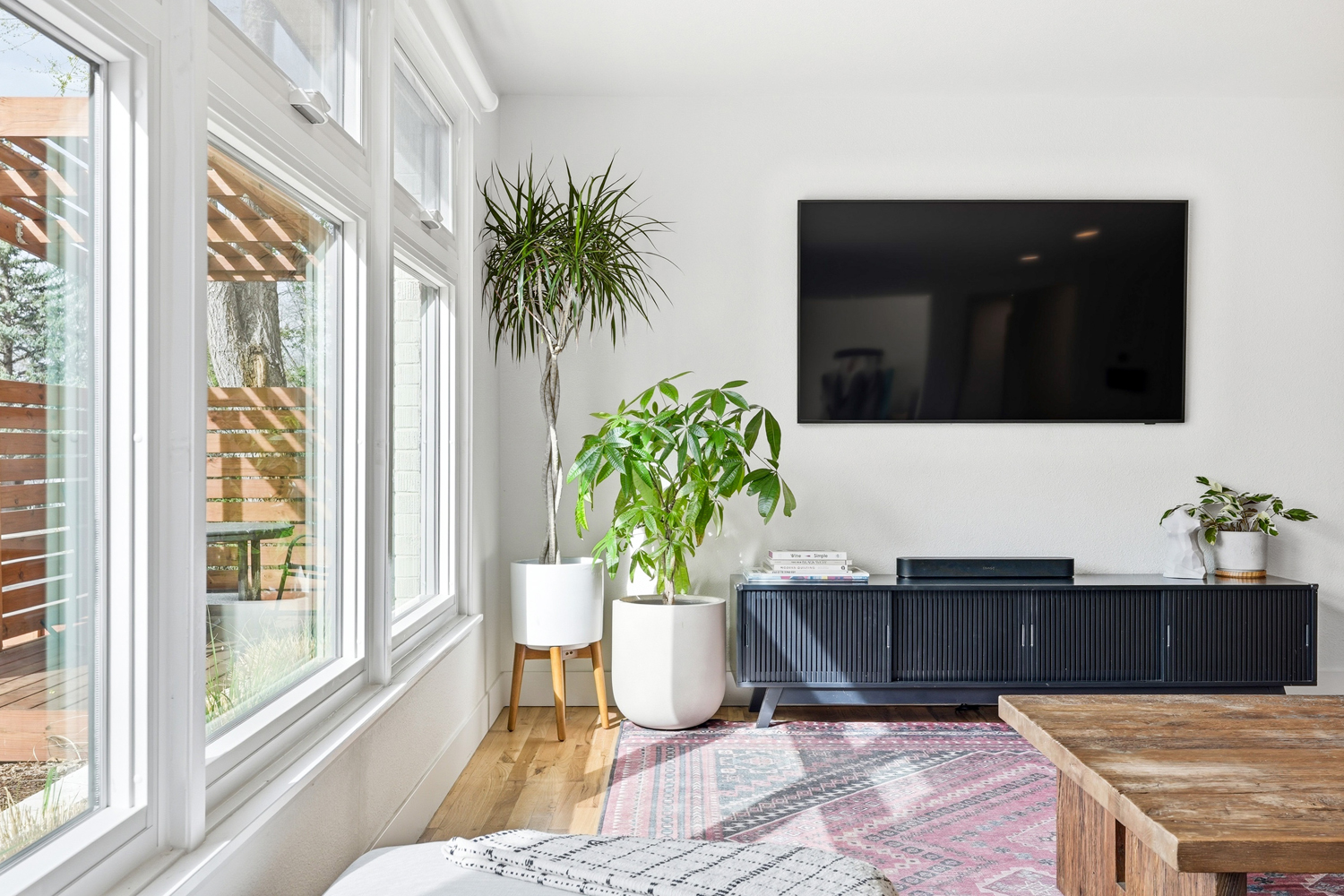 Front yard shaded deck and pergola adding privacy to primary suite and private outdoor area