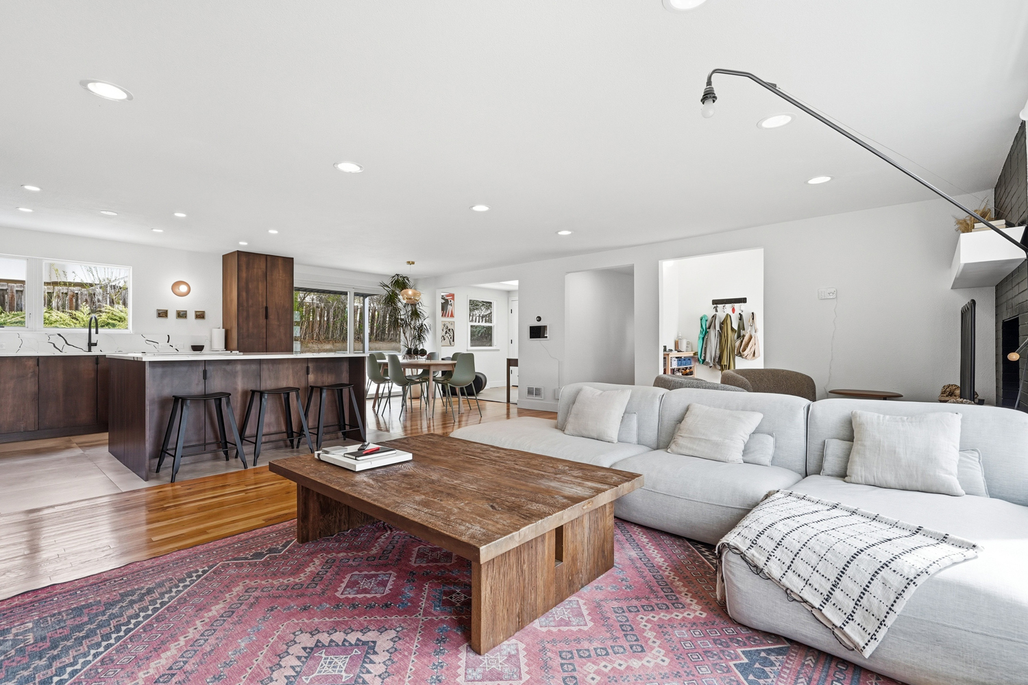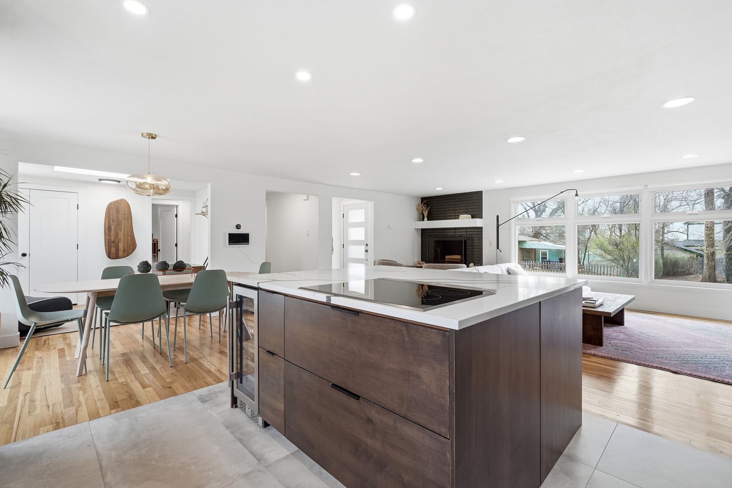 Open-concept layout connecting to living and dining areas