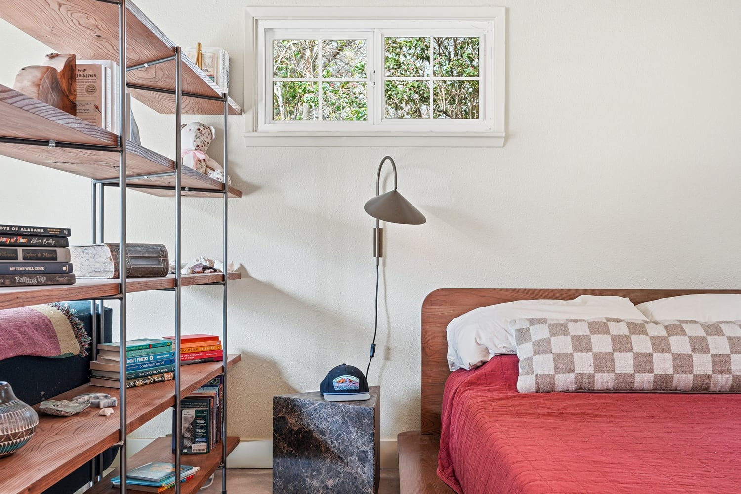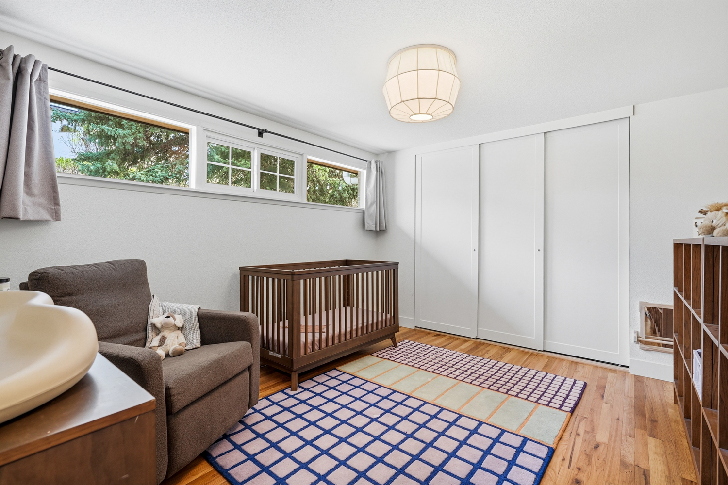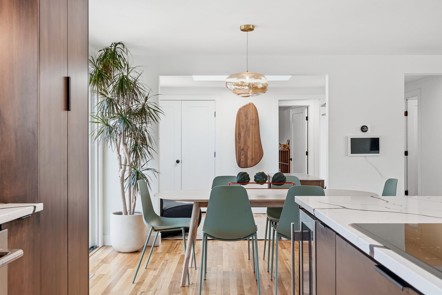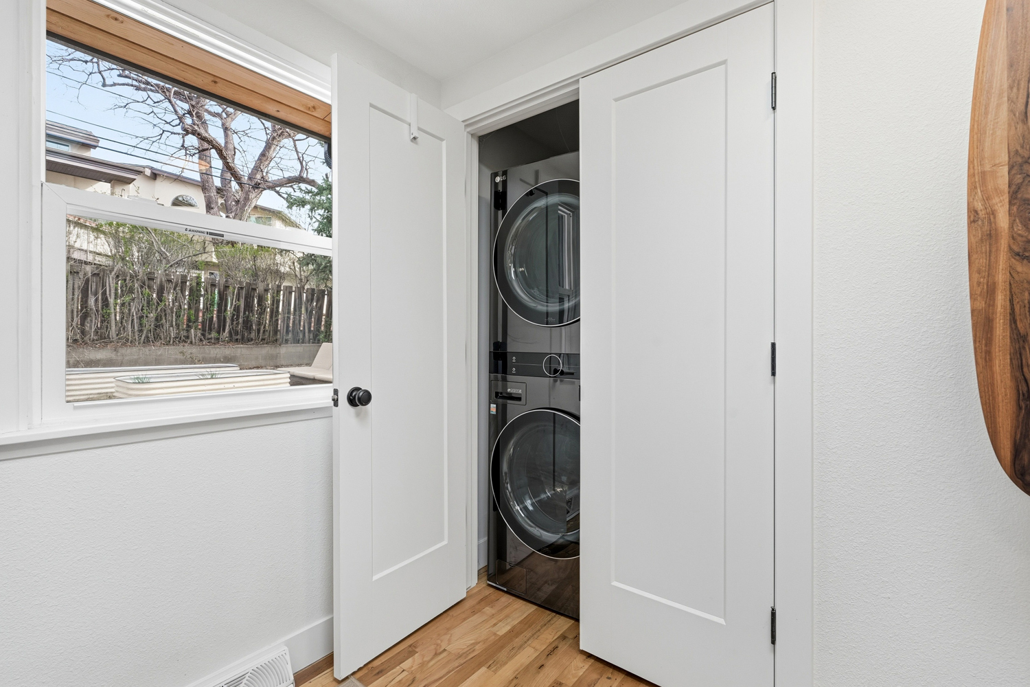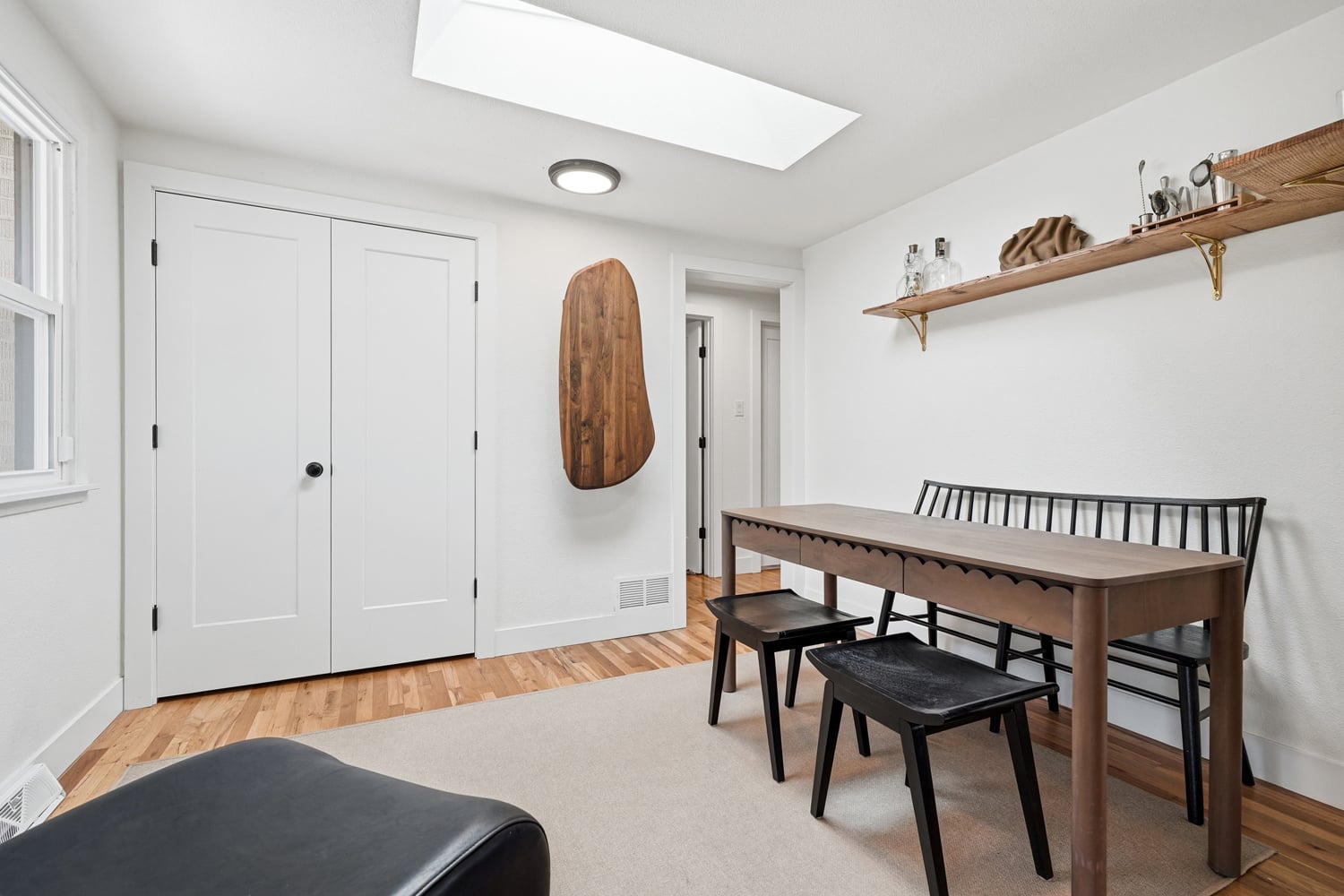 Creative storage solutions have been implemented throughout the home. A pull-out pantry is installed in the kitchen.