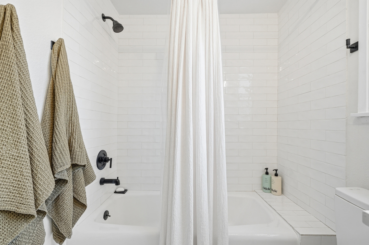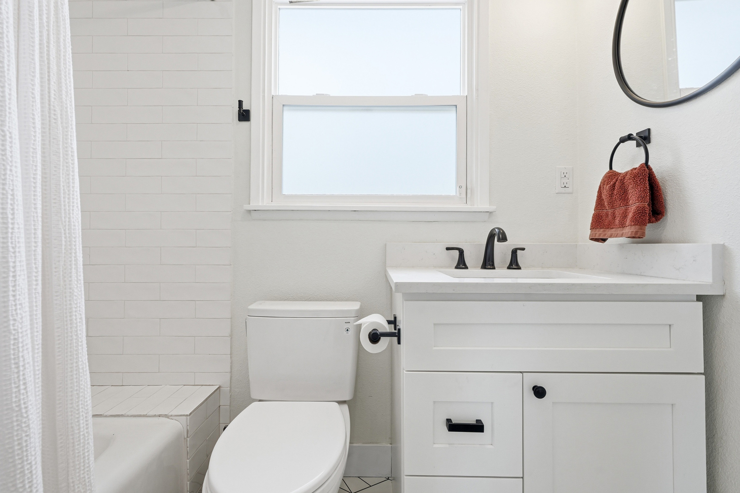 Updated en suite bathroom with designer tile and fixtures