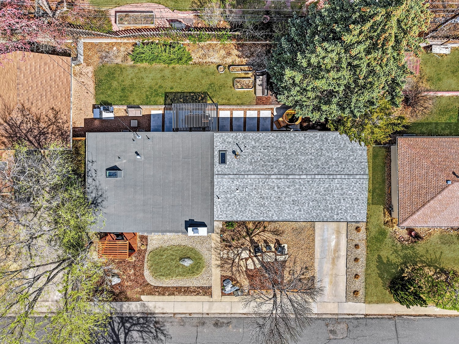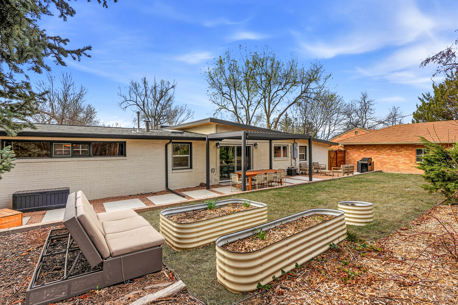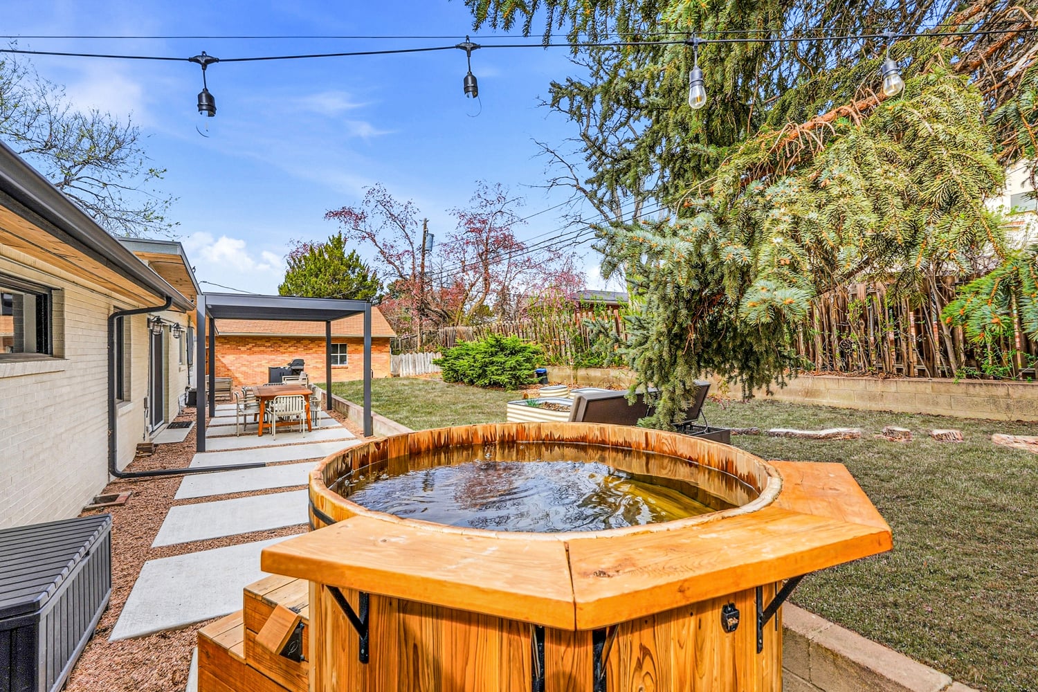 Outside, the property unfolds into a curated oasis. Professionally designed xeriscaping and extensive hardscaping are punctuated by raised garden beds and perennial fruits like raspberries, blackberries, and an apricot tree—all supported by drip irrigation. Mature trees create privacy and shade, while a louvered, waterproof pergola extends outdoor living in the backyard. A cedar soaking tub with heat pump supports both hot soaking and cold plunges for a true at-home wellness experience. New concrete flatwork and an oversized garage complete the offering, all just moments from parks, paths, and the energy of Old Town Longmont.