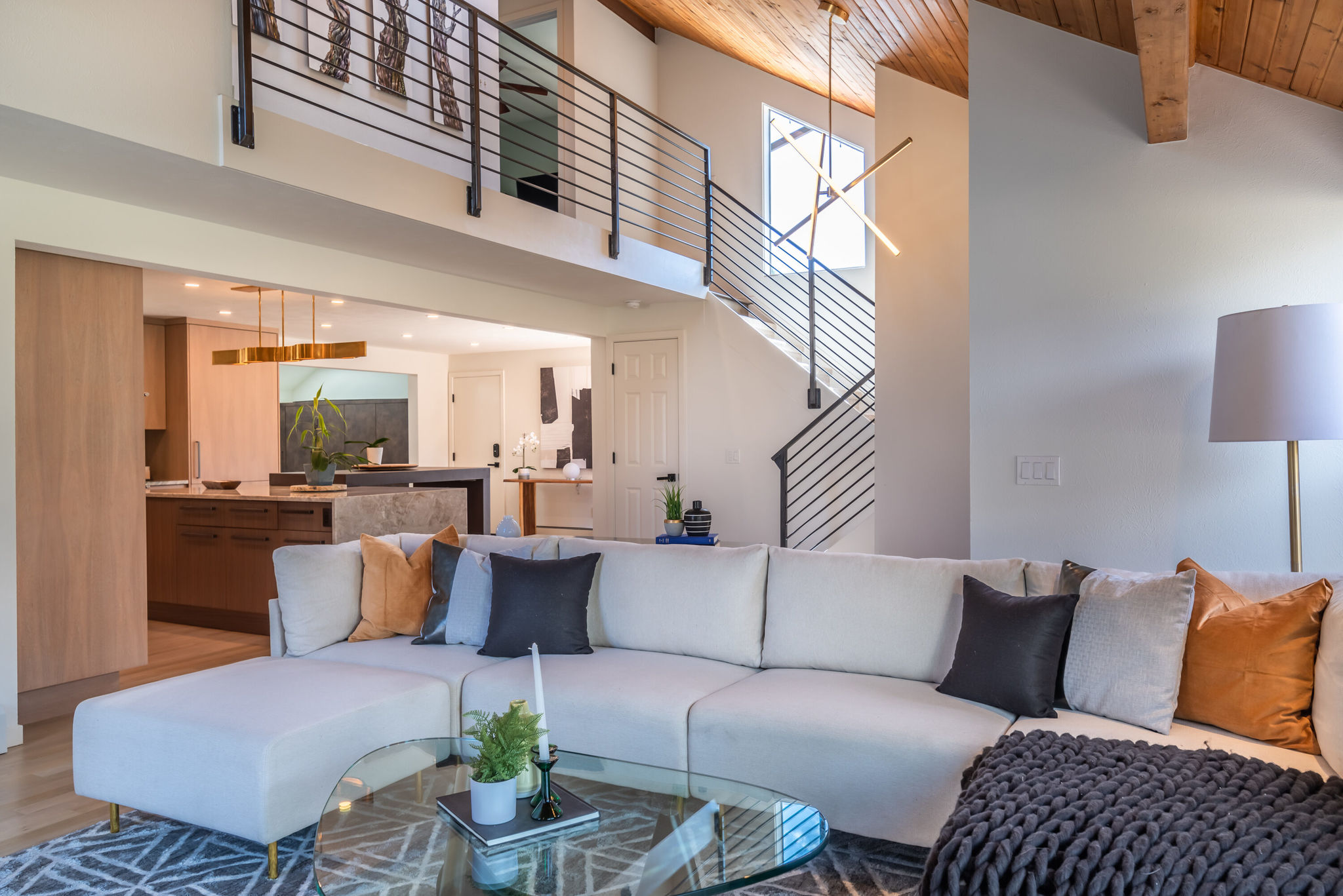 Newly renovated stairs include wood-and-laminate flooring. A glass wall creates a stunning open concept on the top-level landing.