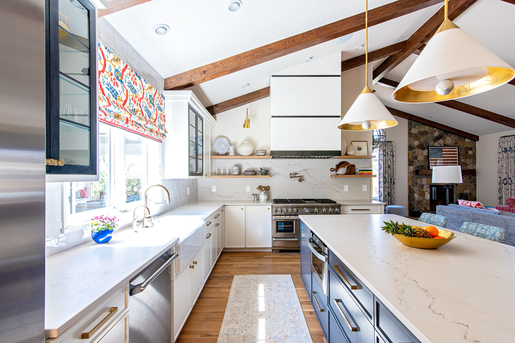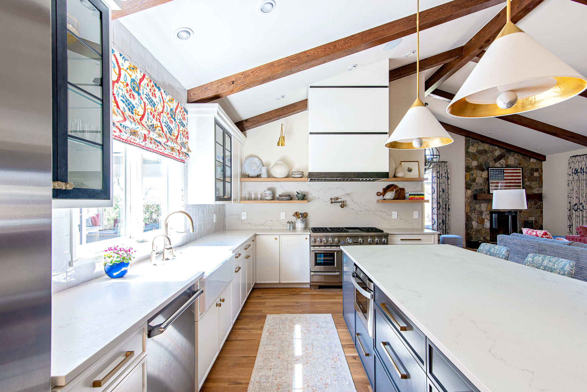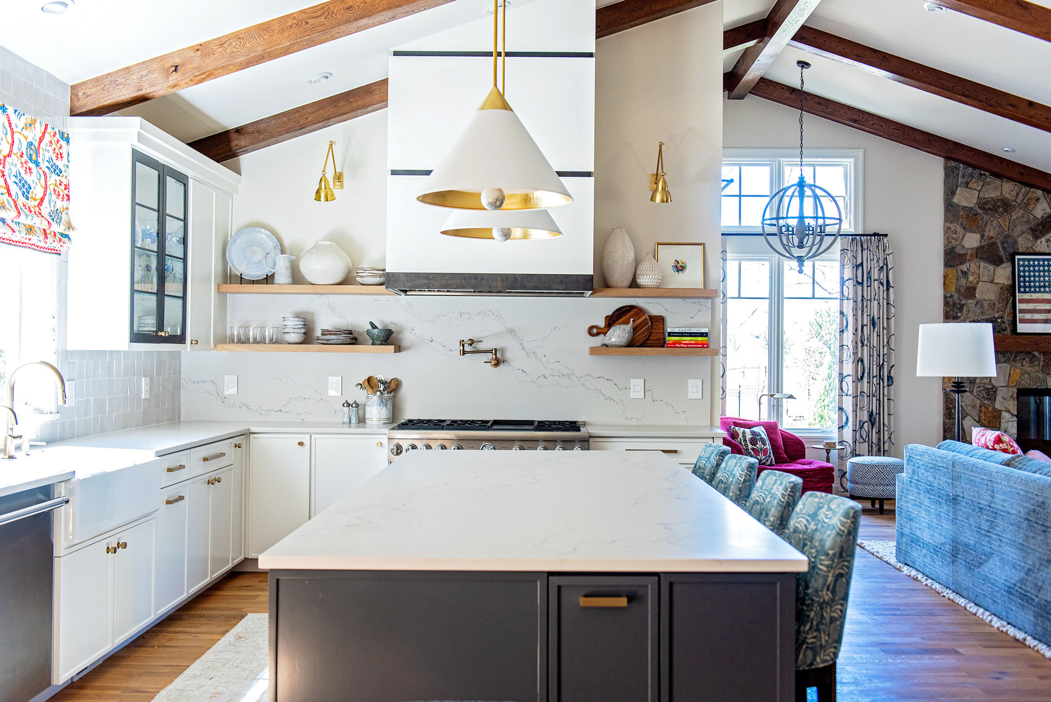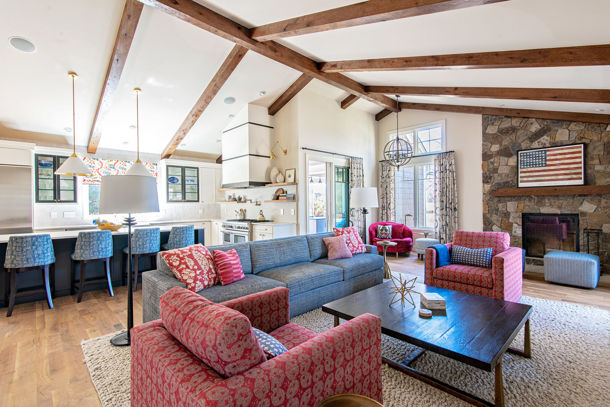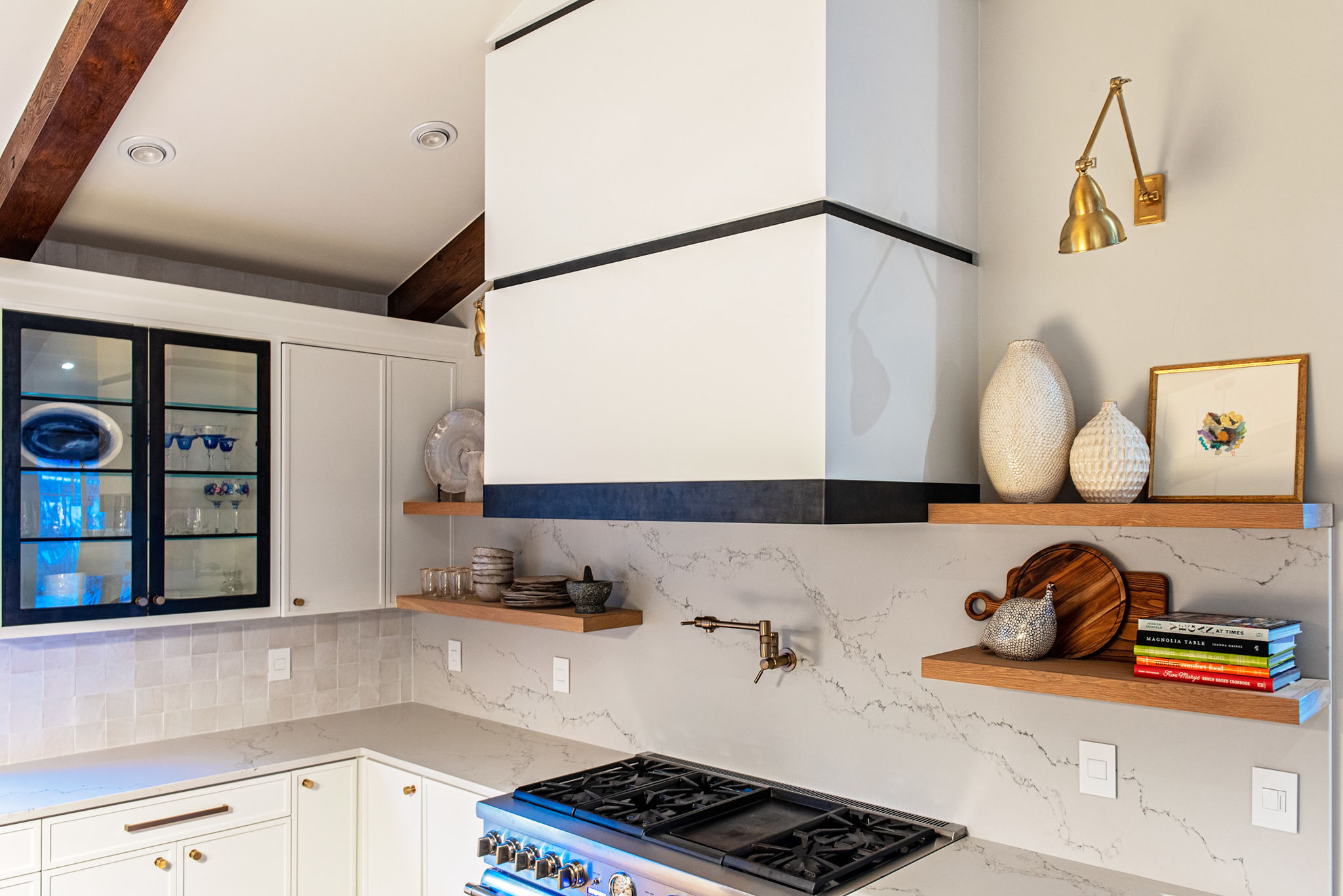 The striking kitchen & living room are the center of the home, creating a superb space for entertaining. The custom-designed kitchen boasts solid wood cabinets, honed quartz countertops, a handcrafted stove hood, six-burner stove, and farmhouse sink.