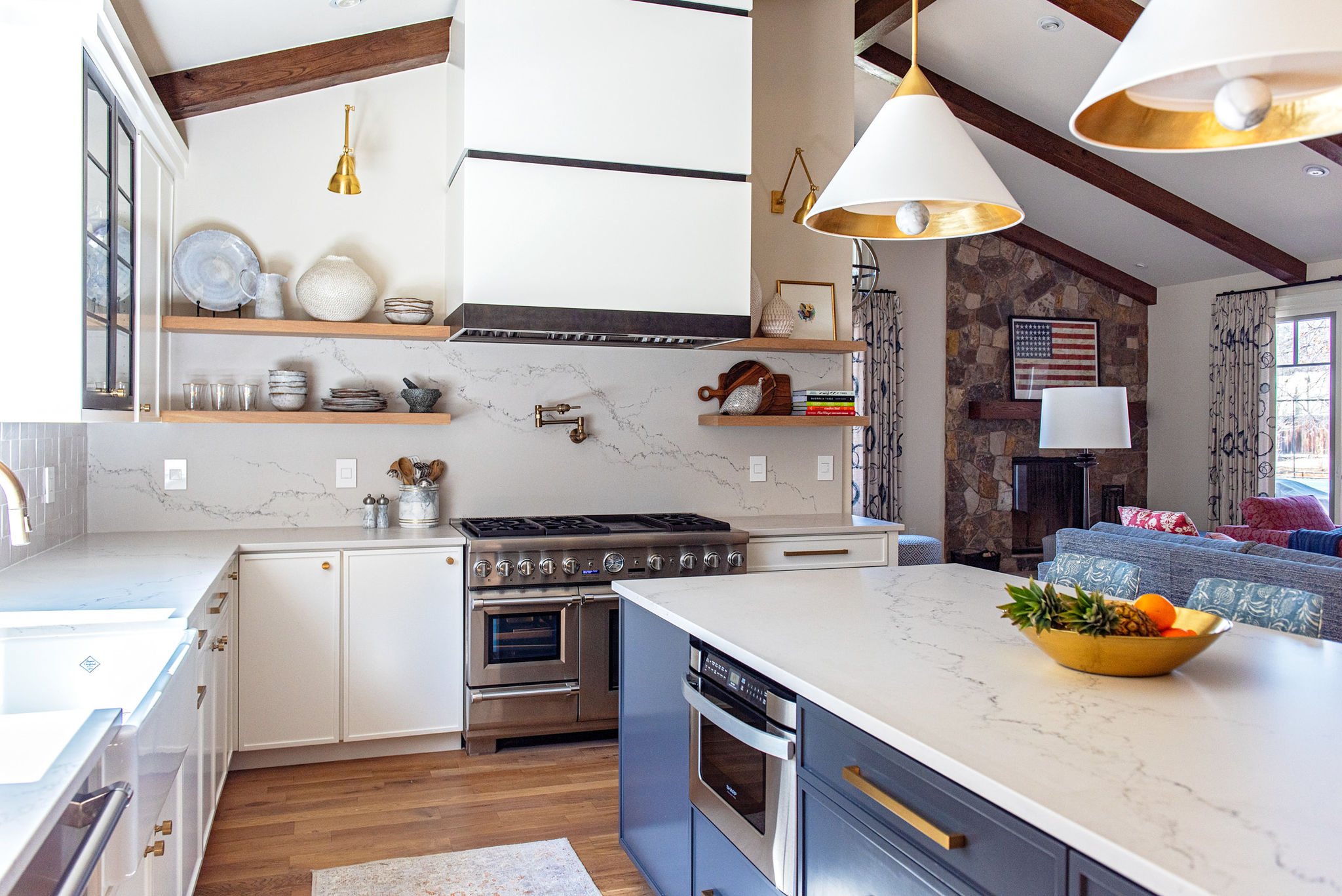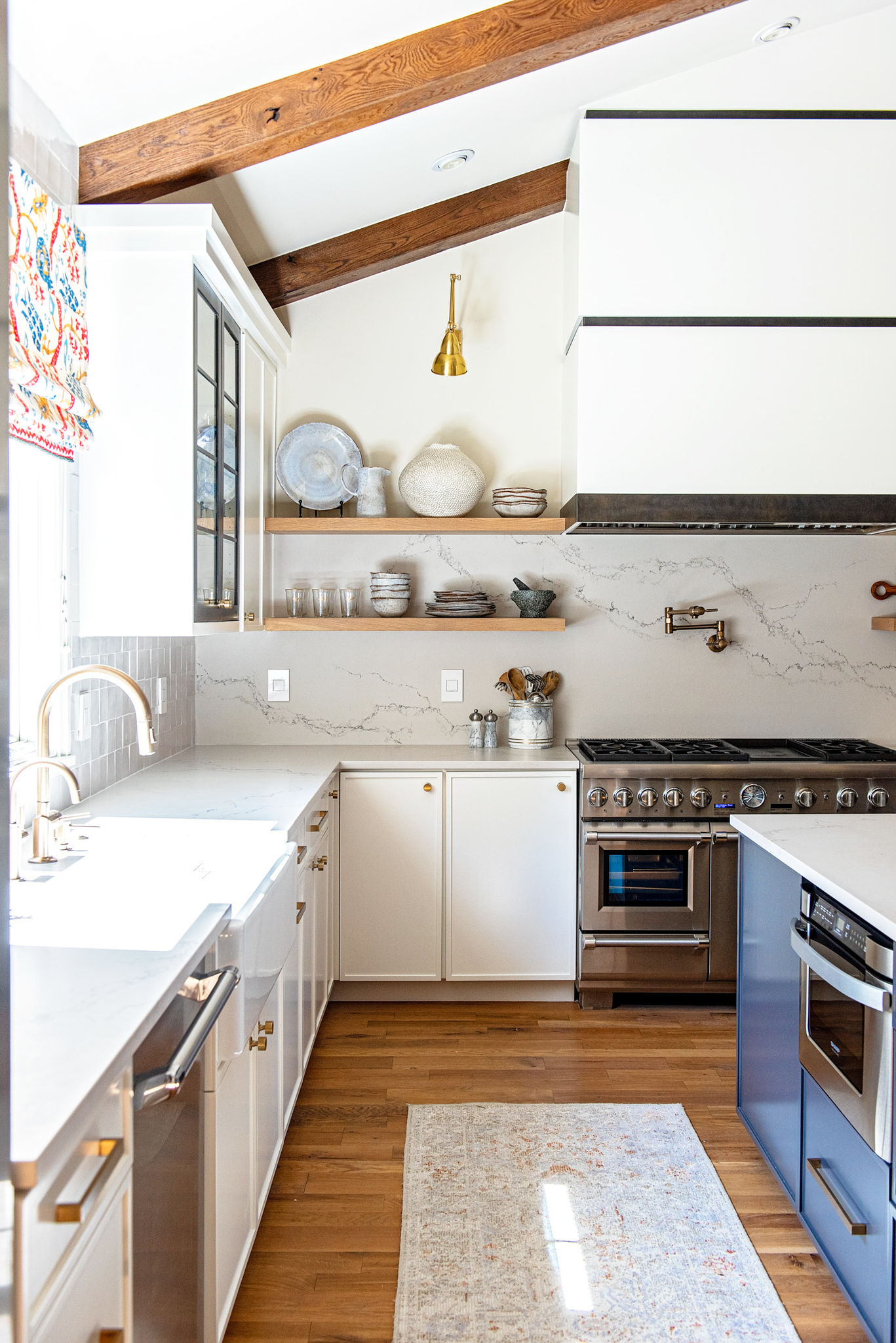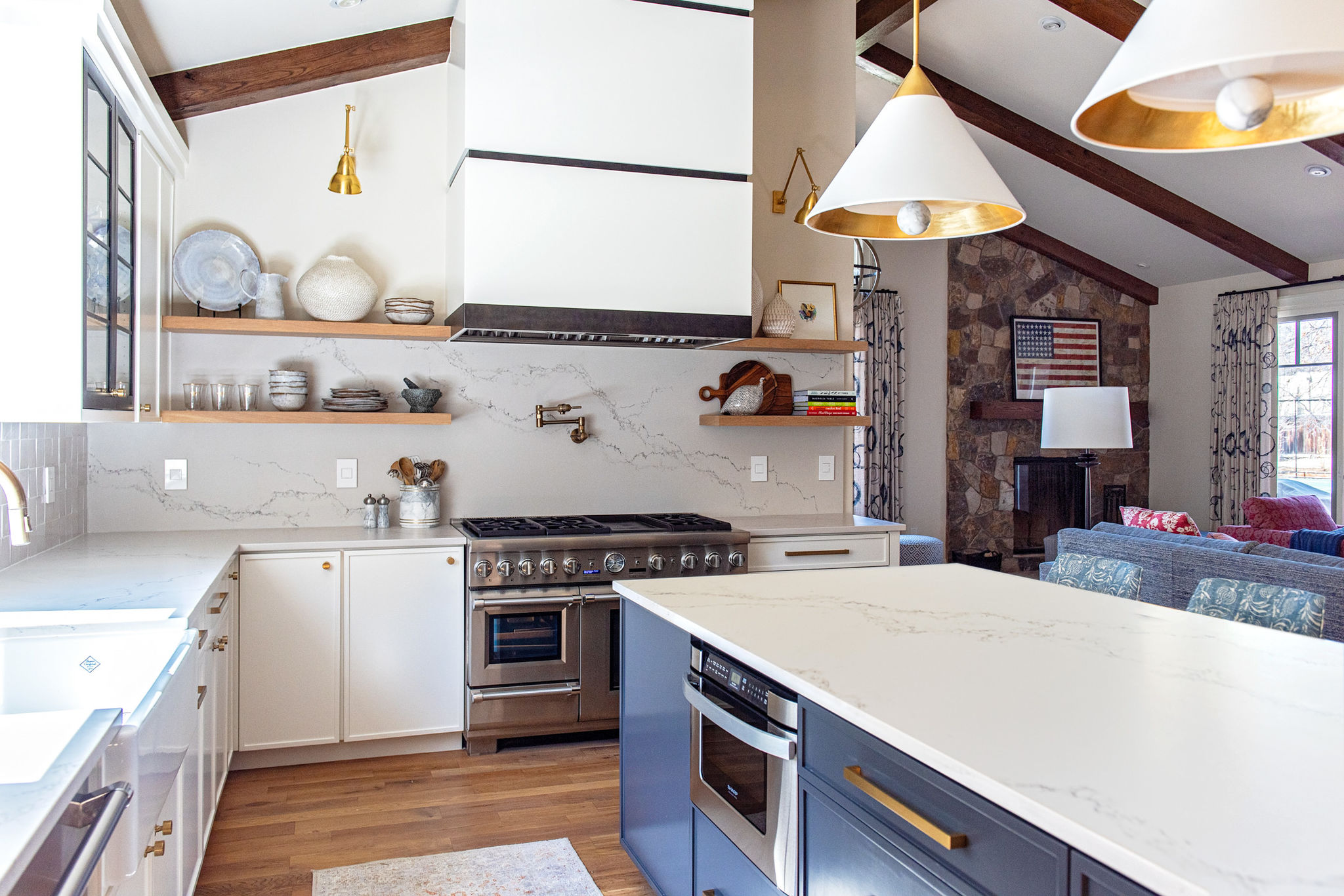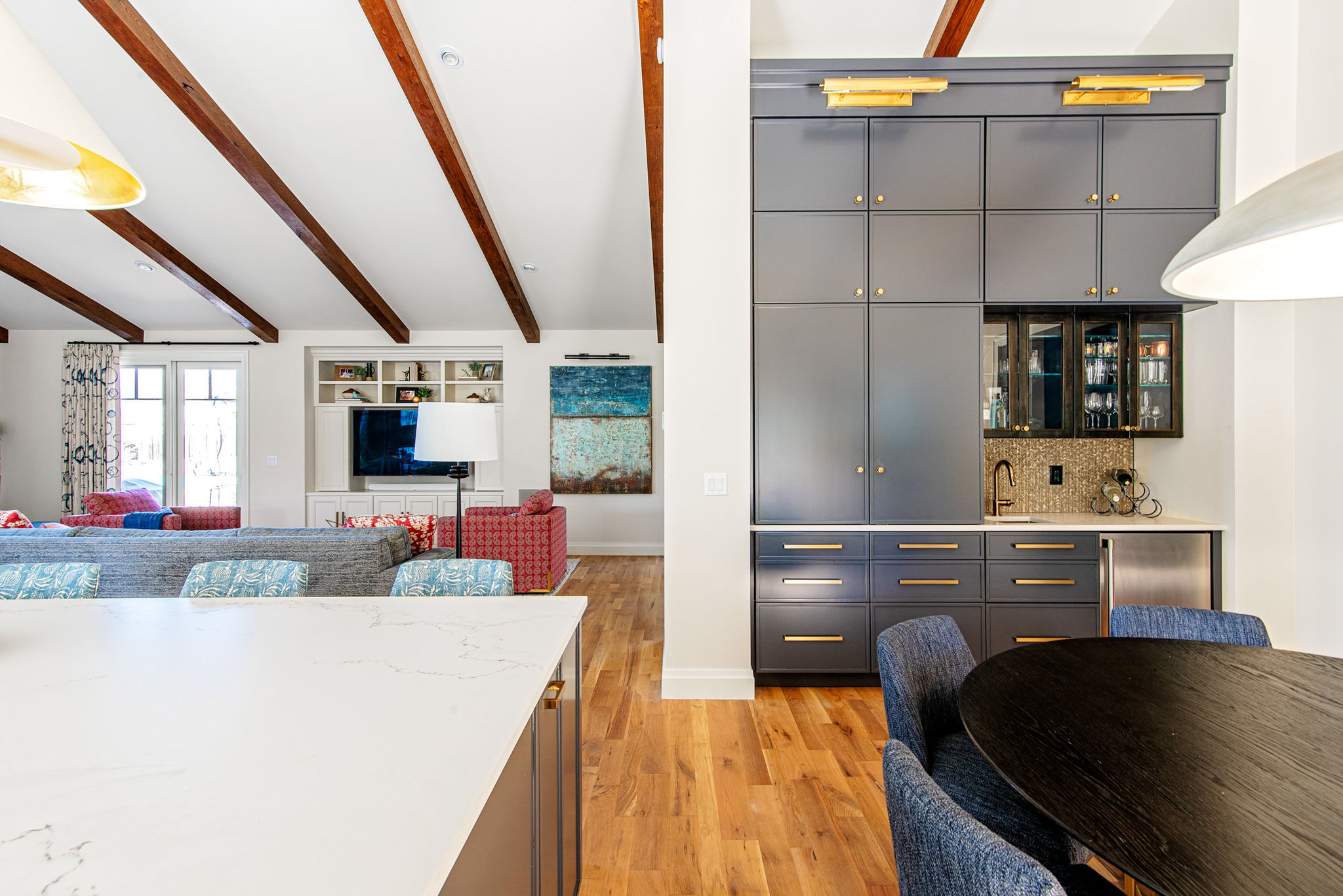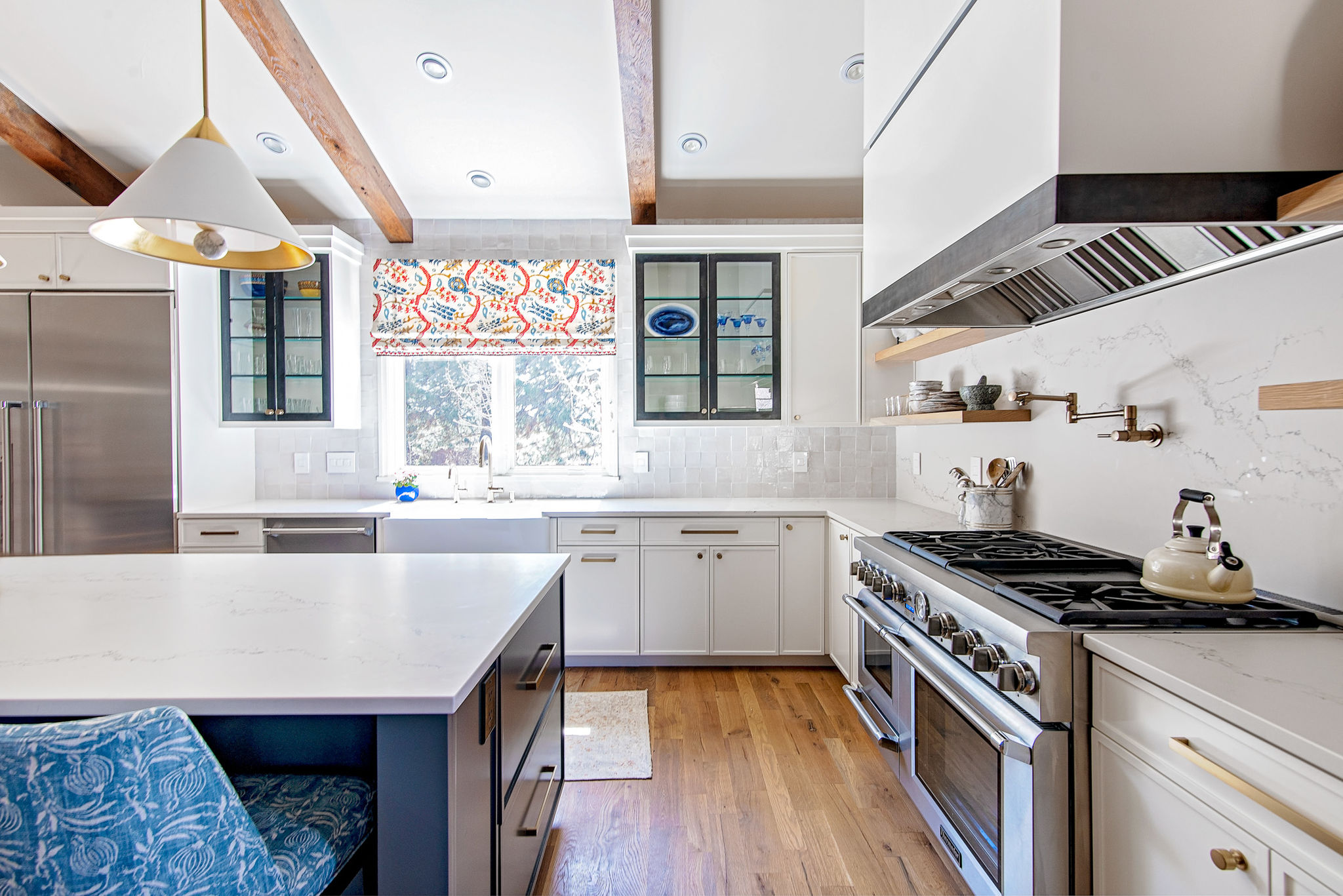 The striking kitchen & living room are the center of the home, creating a superb space for entertaining. The custom-designed kitchen boasts solid wood cabinets, honed quartz countertops, a handcrafted stove hood, six-burner stove, and farmhouse sink.