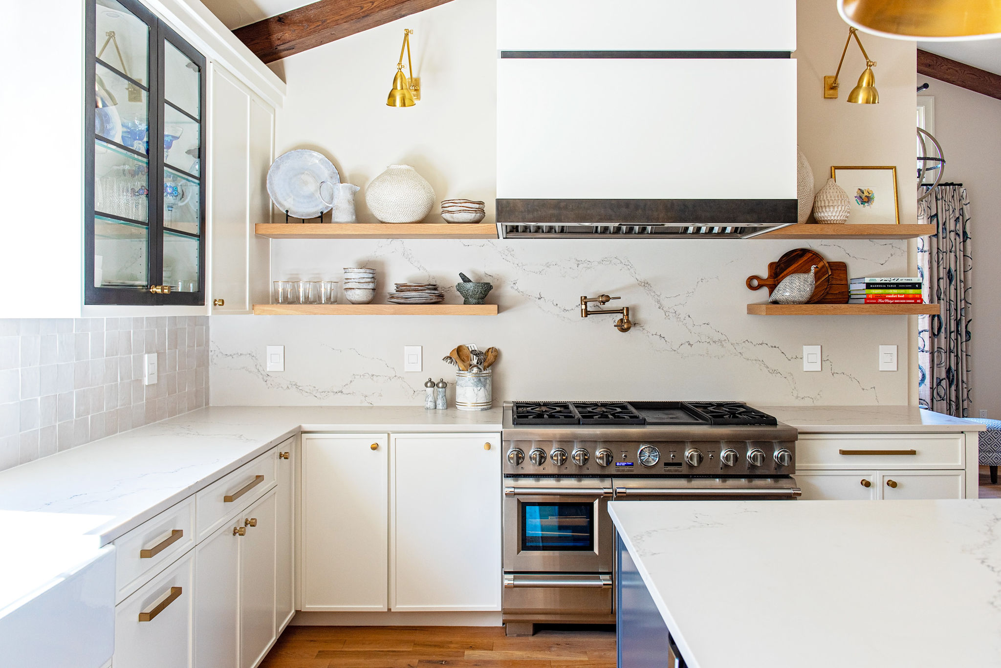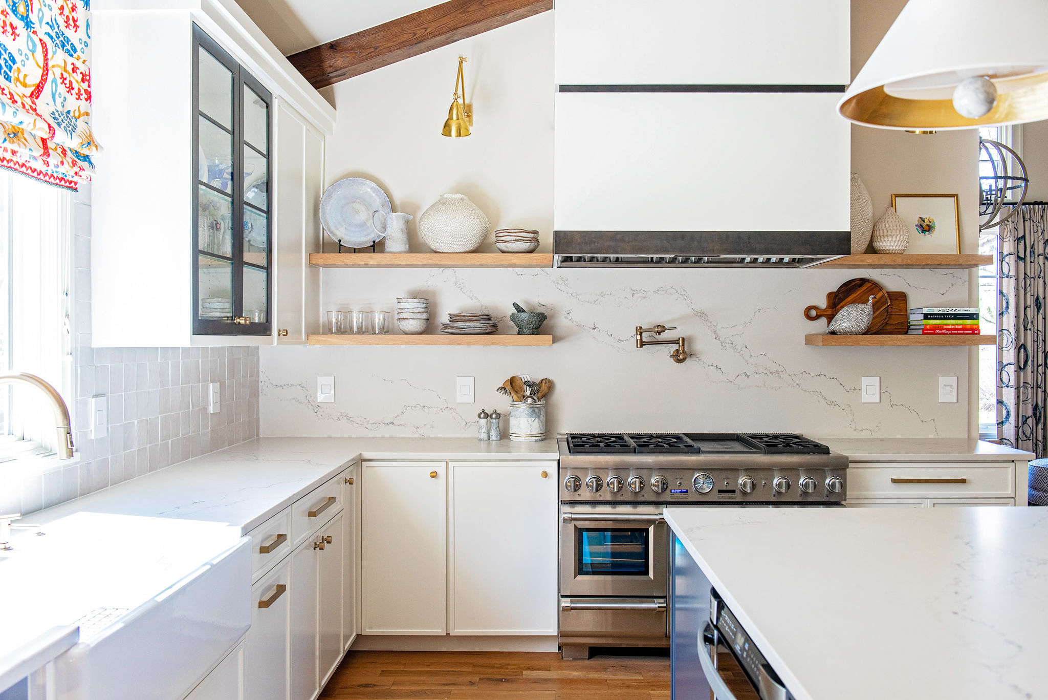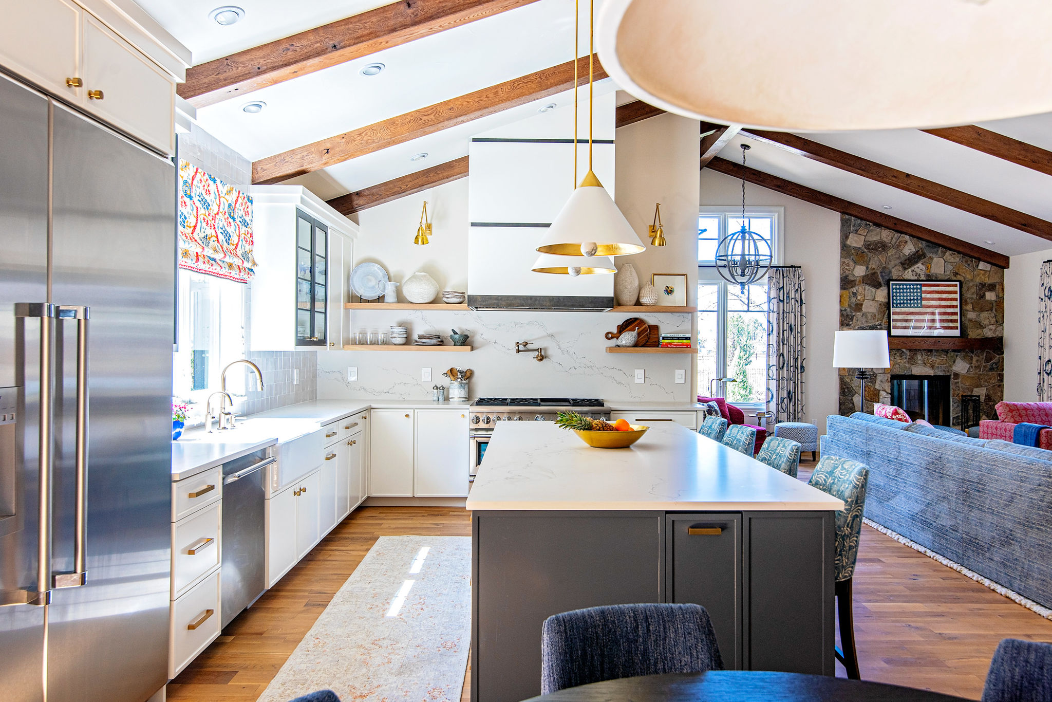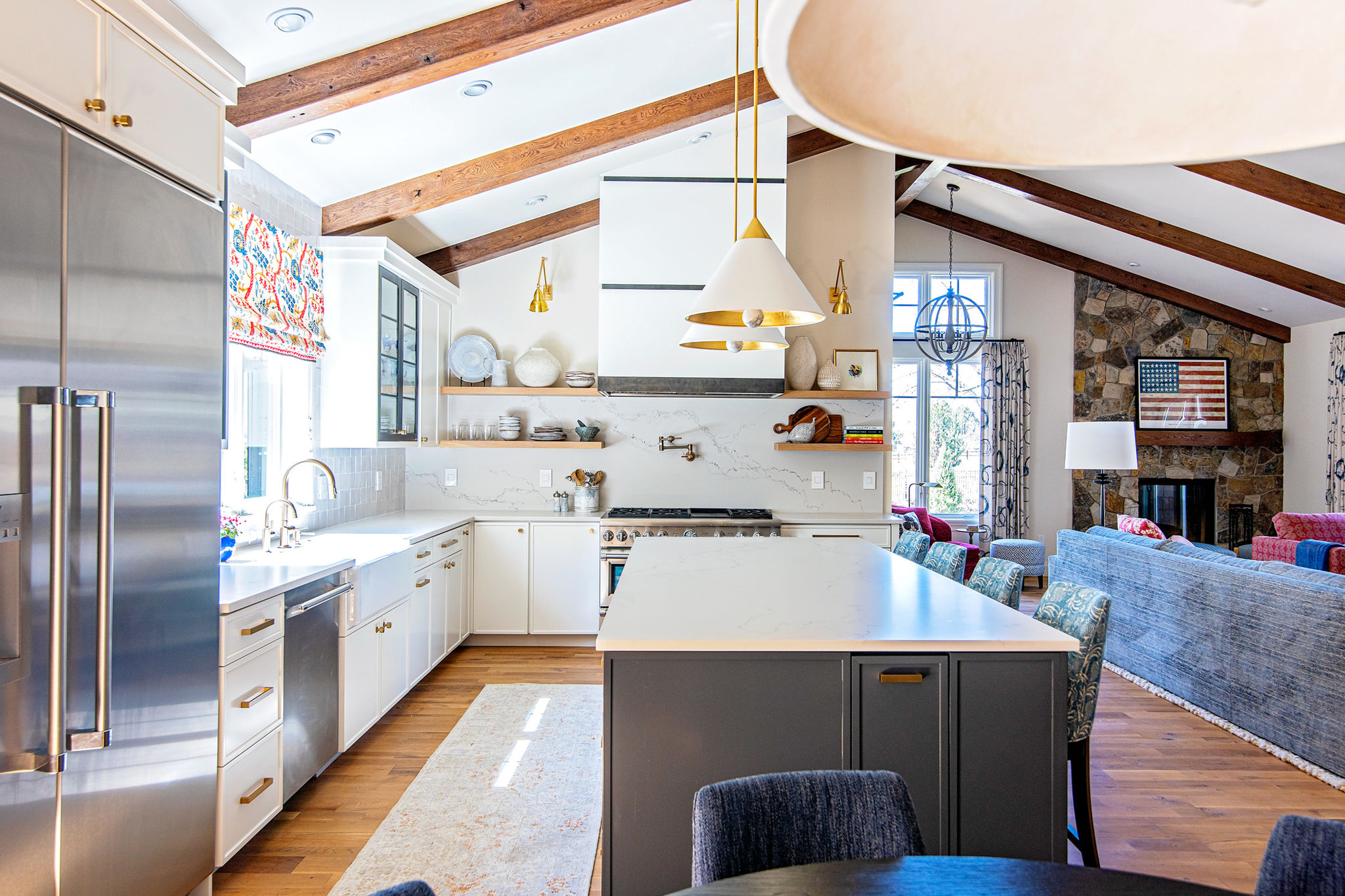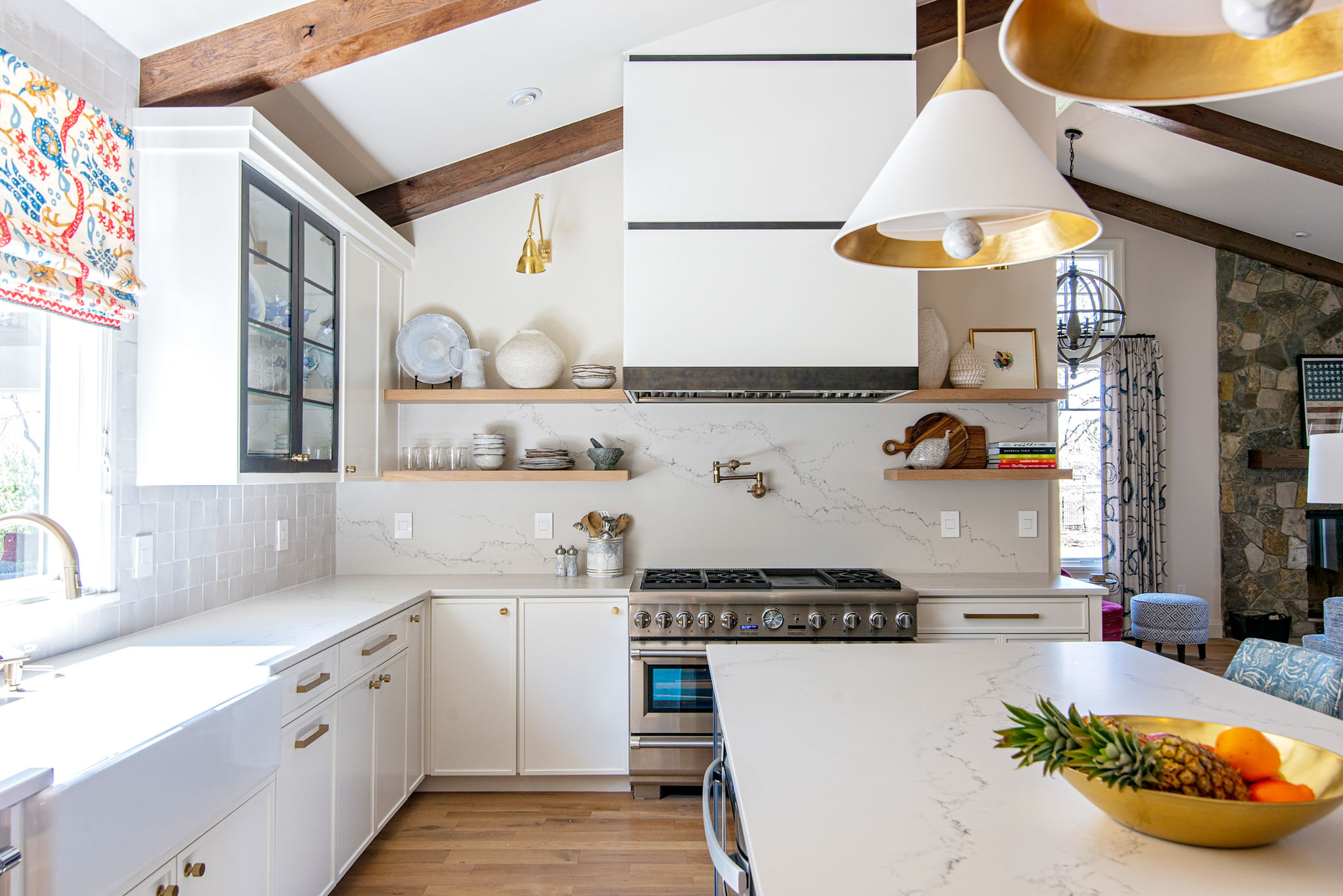 The striking kitchen & living room are the center of the home, creating a superb space for entertaining. The custom-designed kitchen boasts solid wood cabinets, honed quartz countertops, a handcrafted stove hood, six-burner stove, and farmhouse sink.