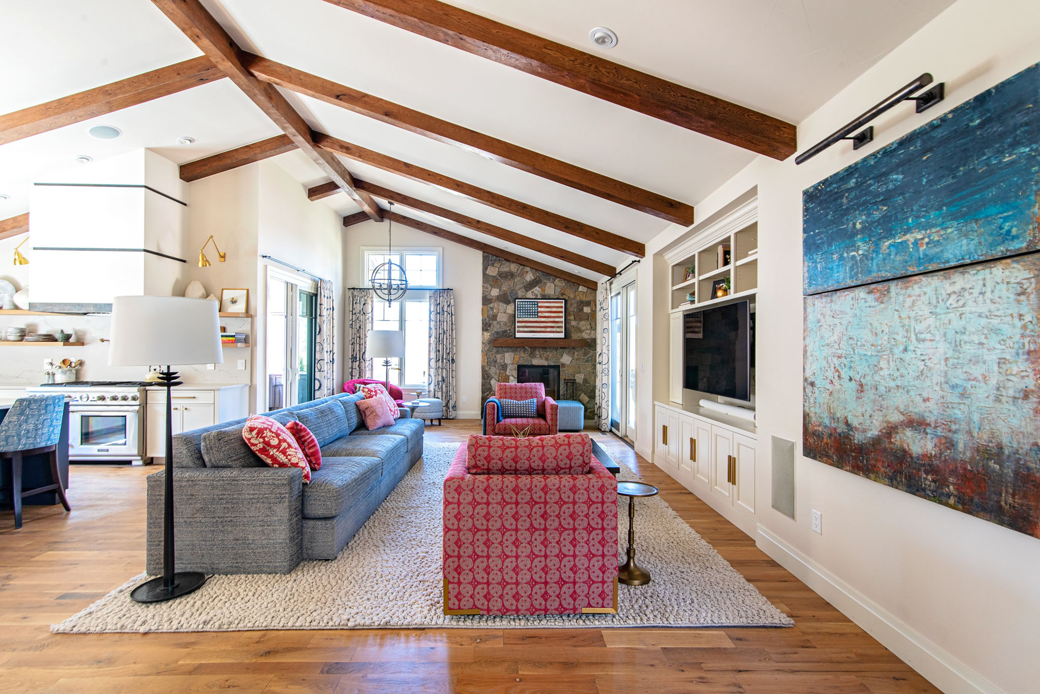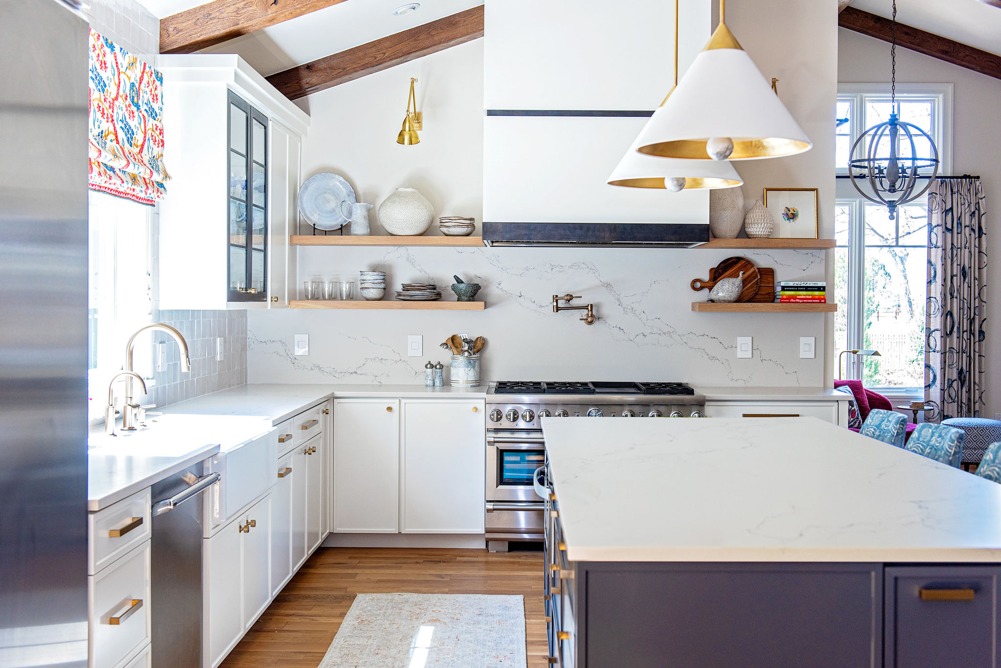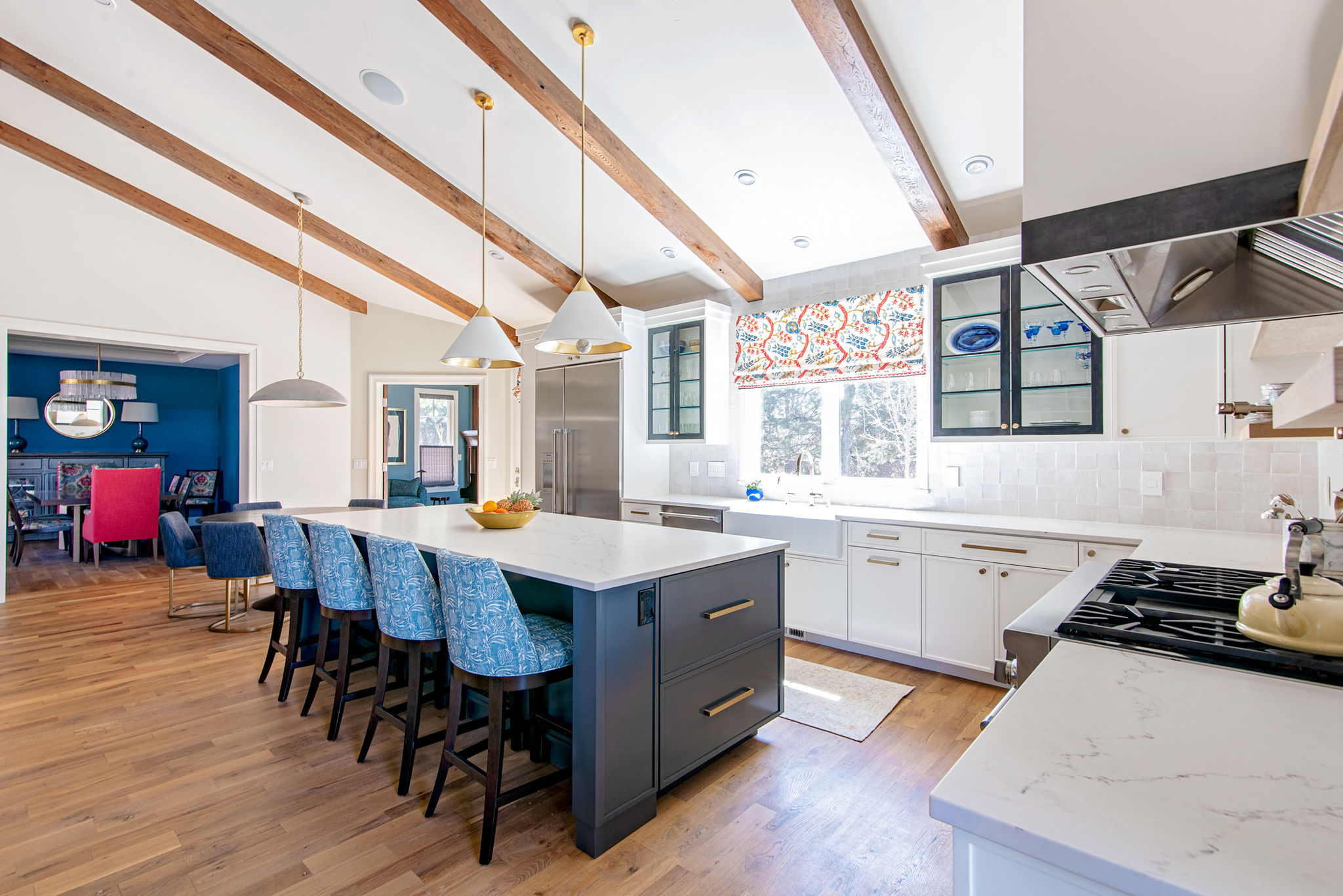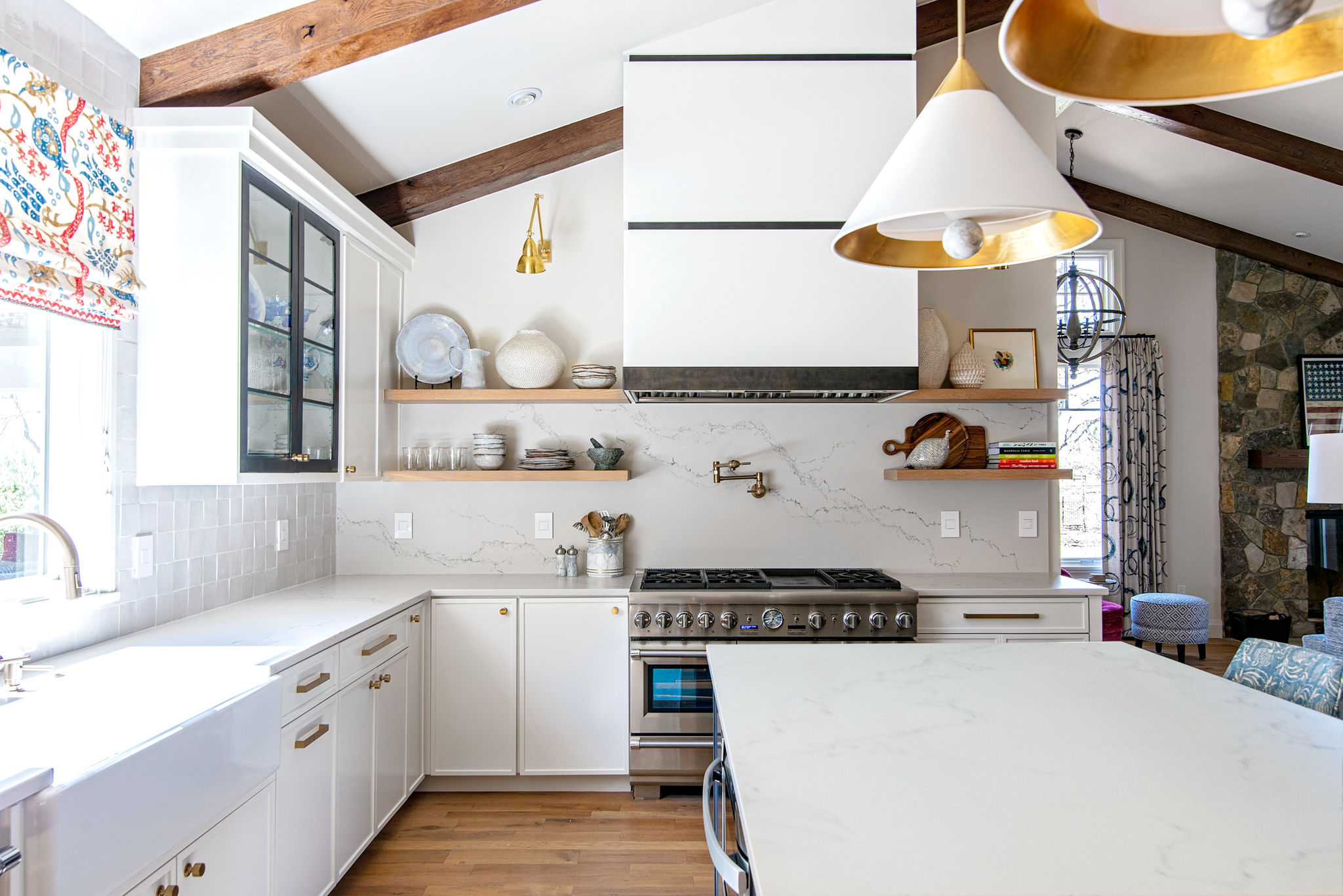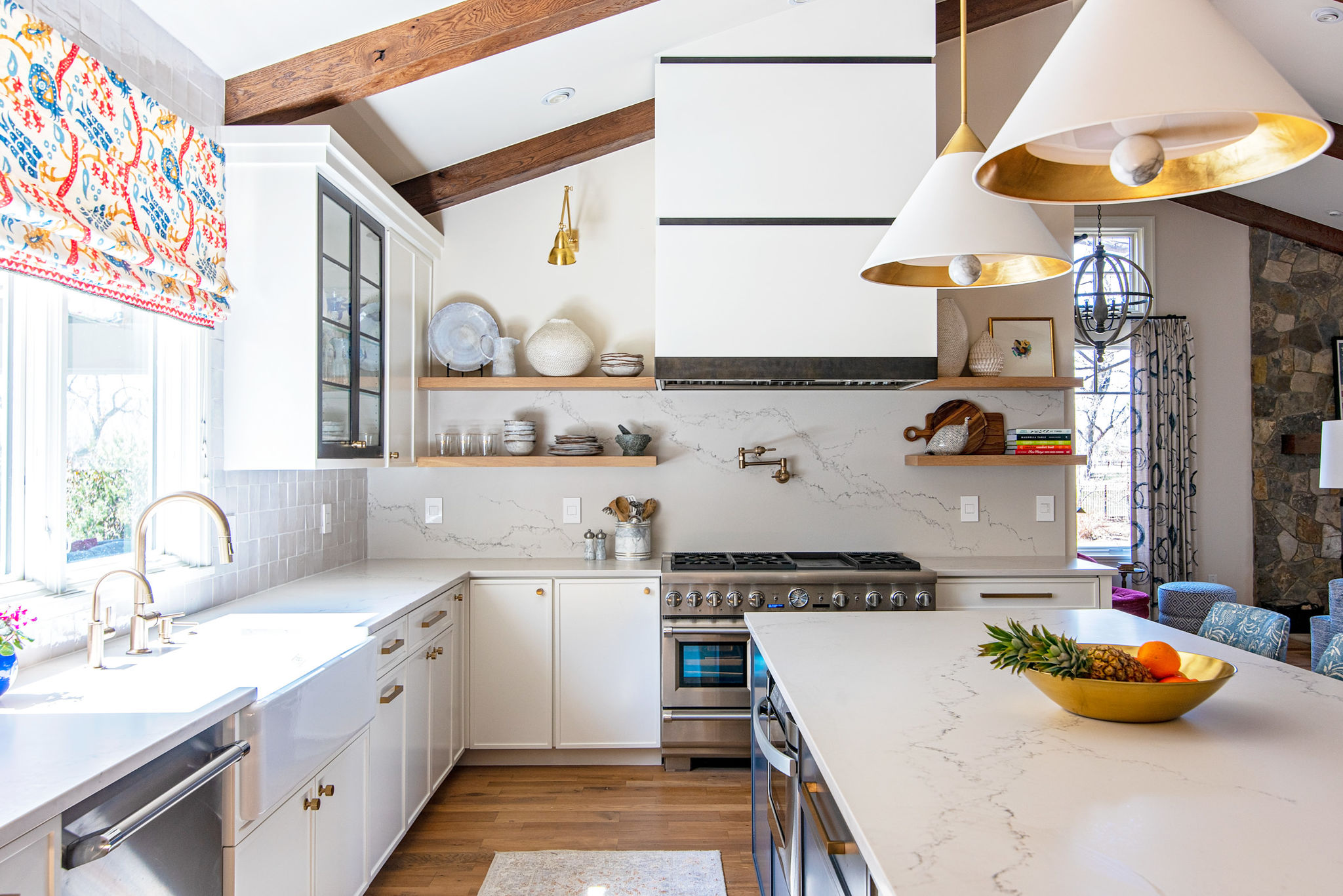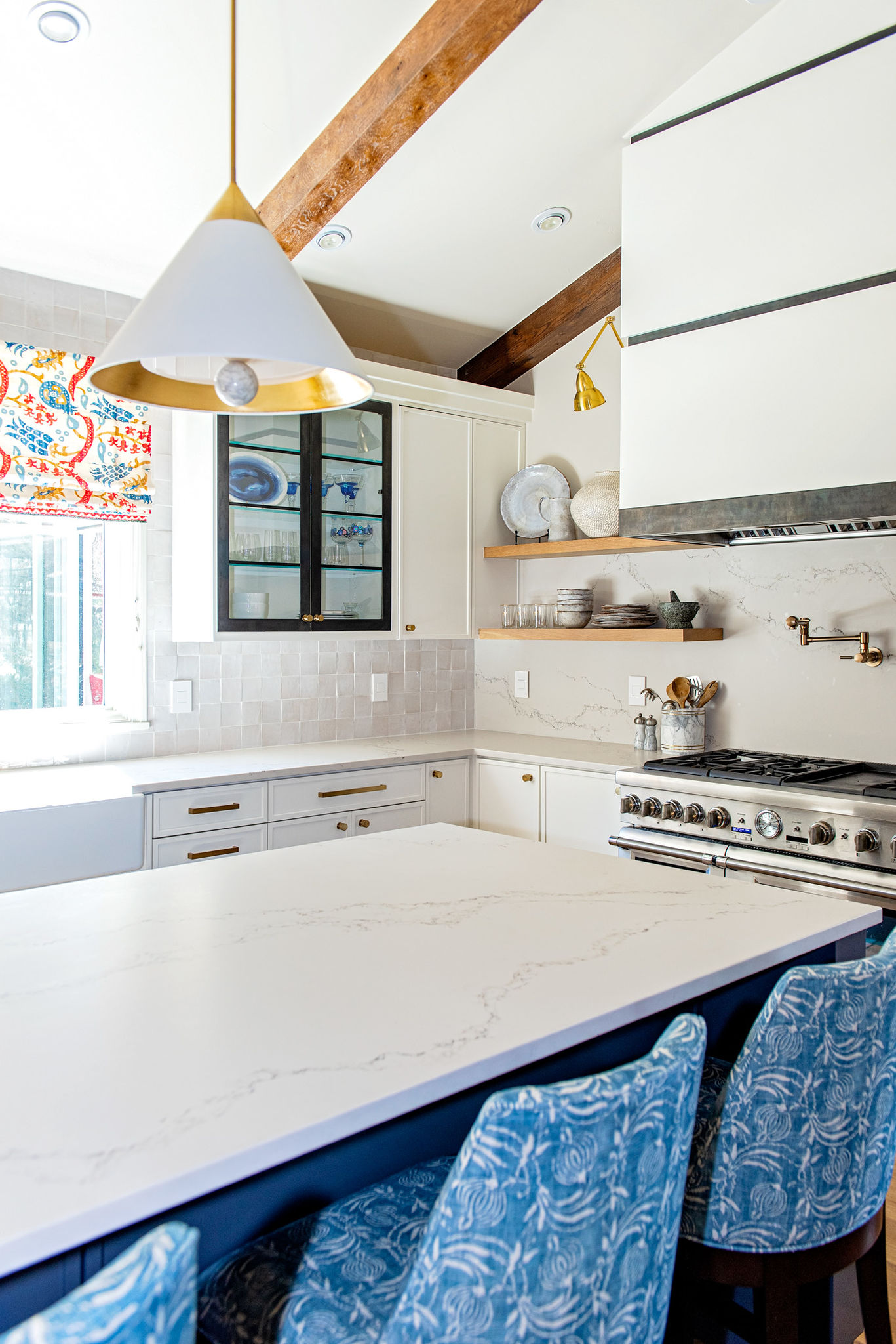 The striking kitchen & living room are the center of the home, creating a superb space for entertaining. The custom-designed kitchen boasts solid wood cabinets, honed quartz countertops, a handcrafted stove hood, six-burner stove, and farmhouse sink.