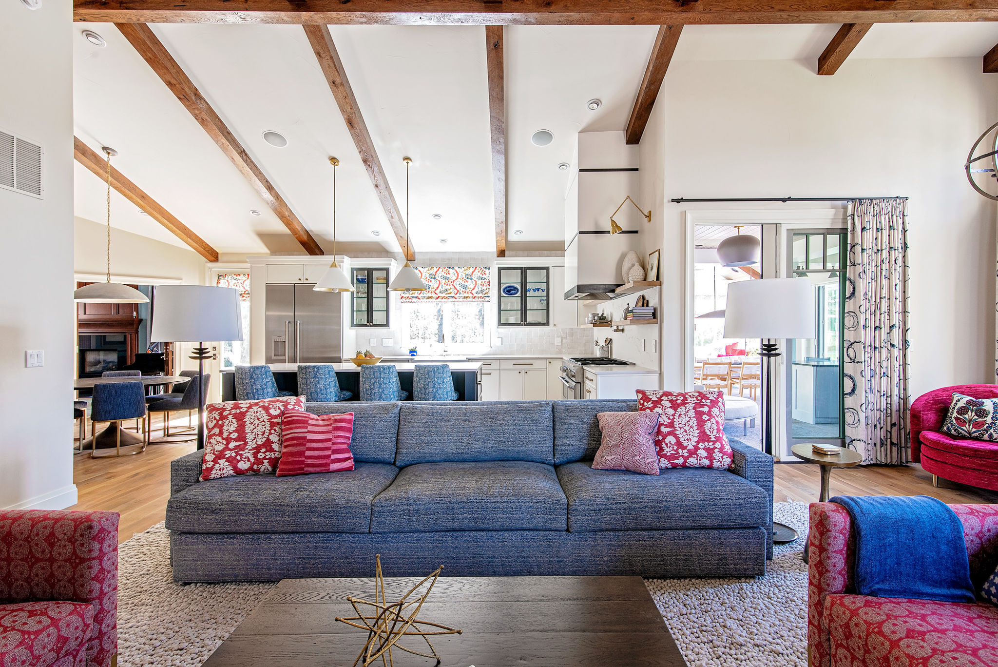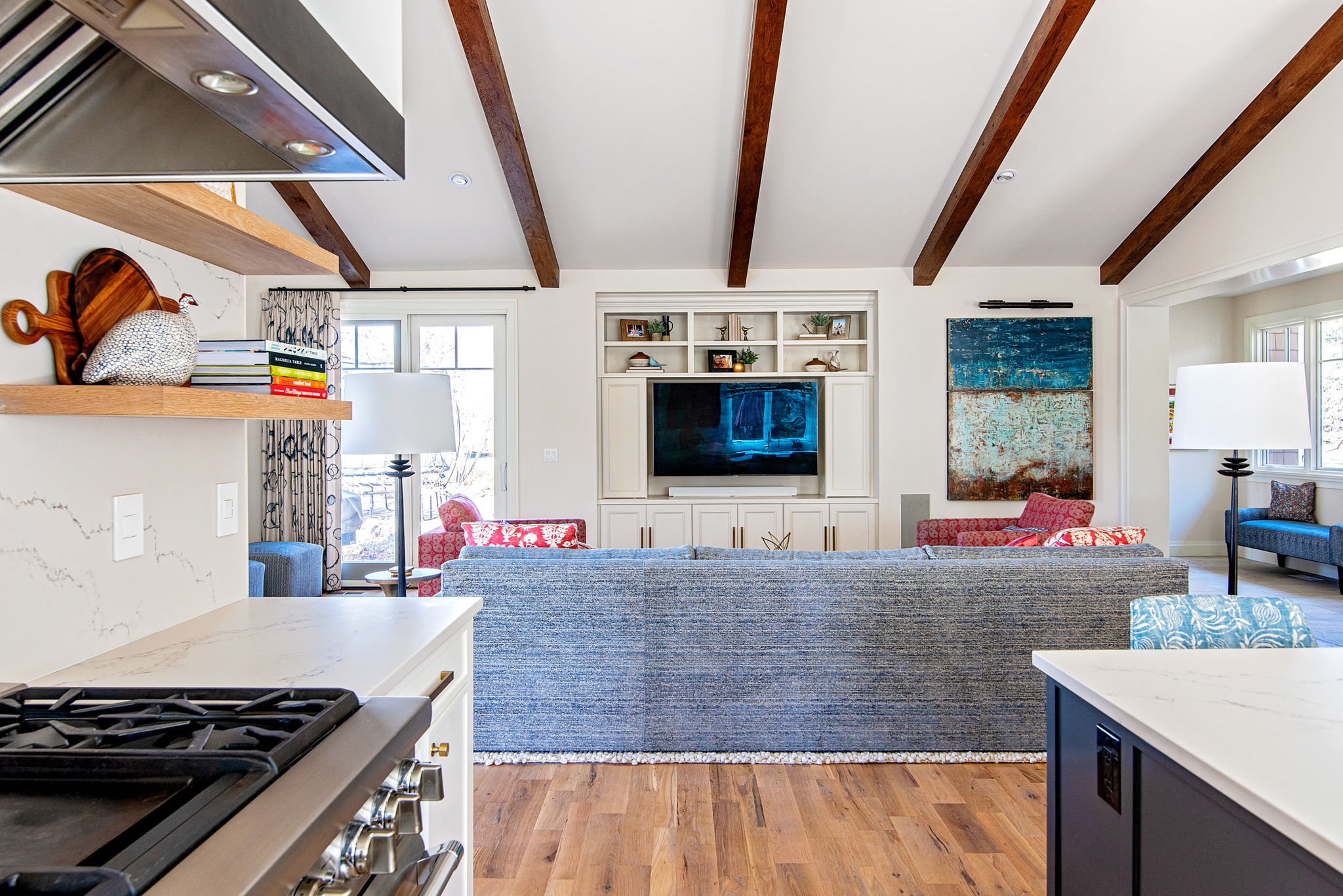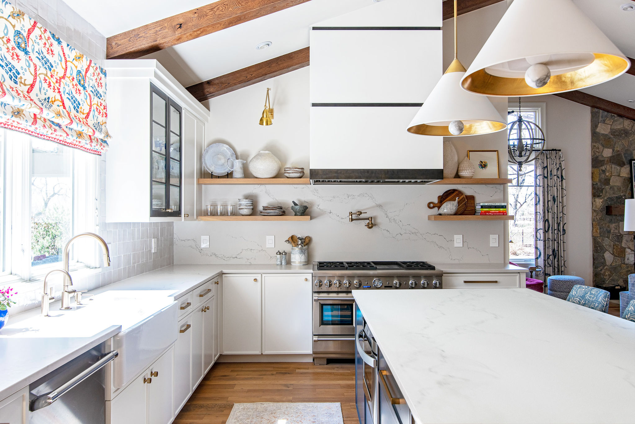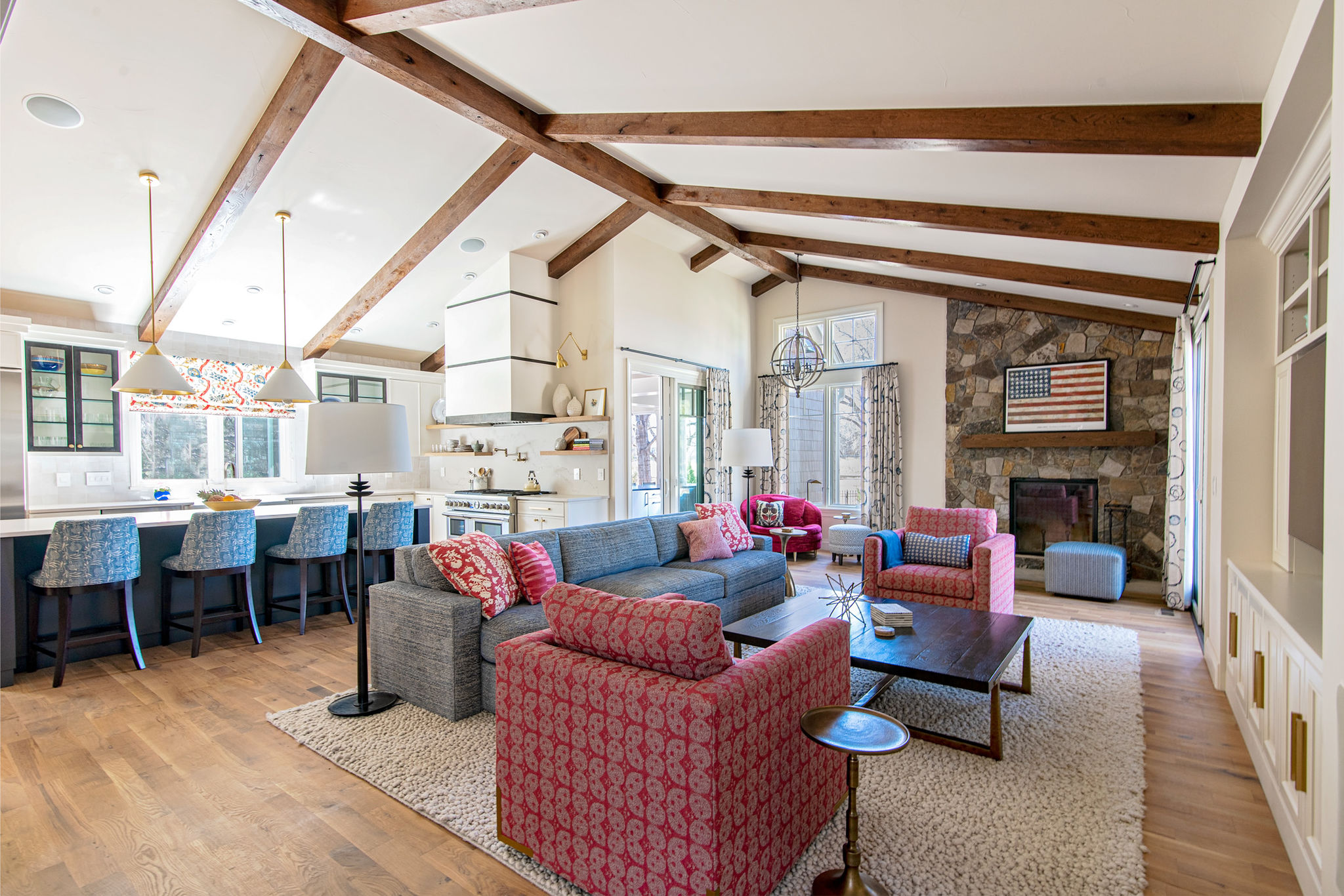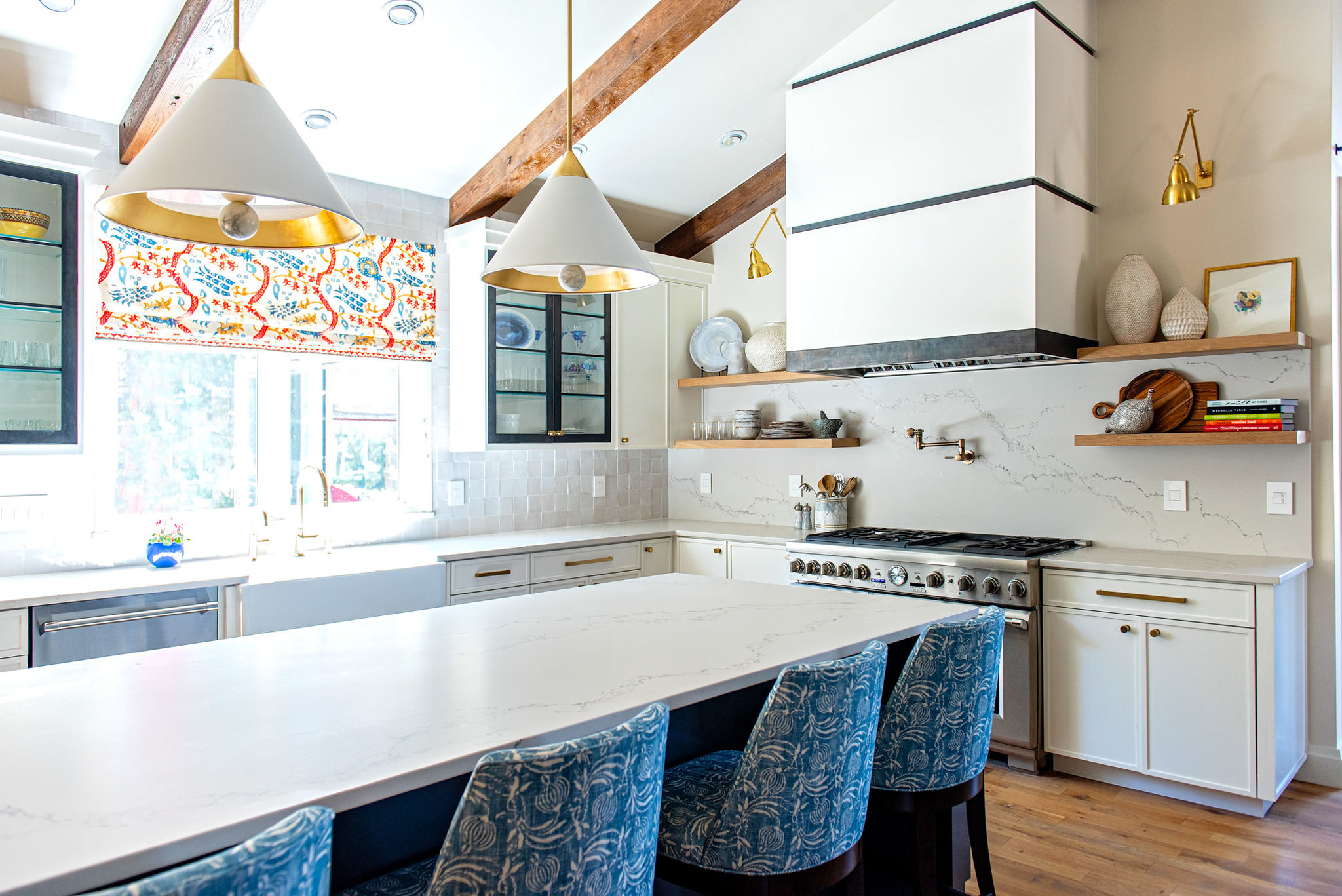 The striking kitchen & living room are the center of the home, creating a superb space for entertaining. The custom-designed kitchen boasts solid wood cabinets, honed quartz countertops, a handcrafted stove hood, six-burner stove, and farmhouse sink.