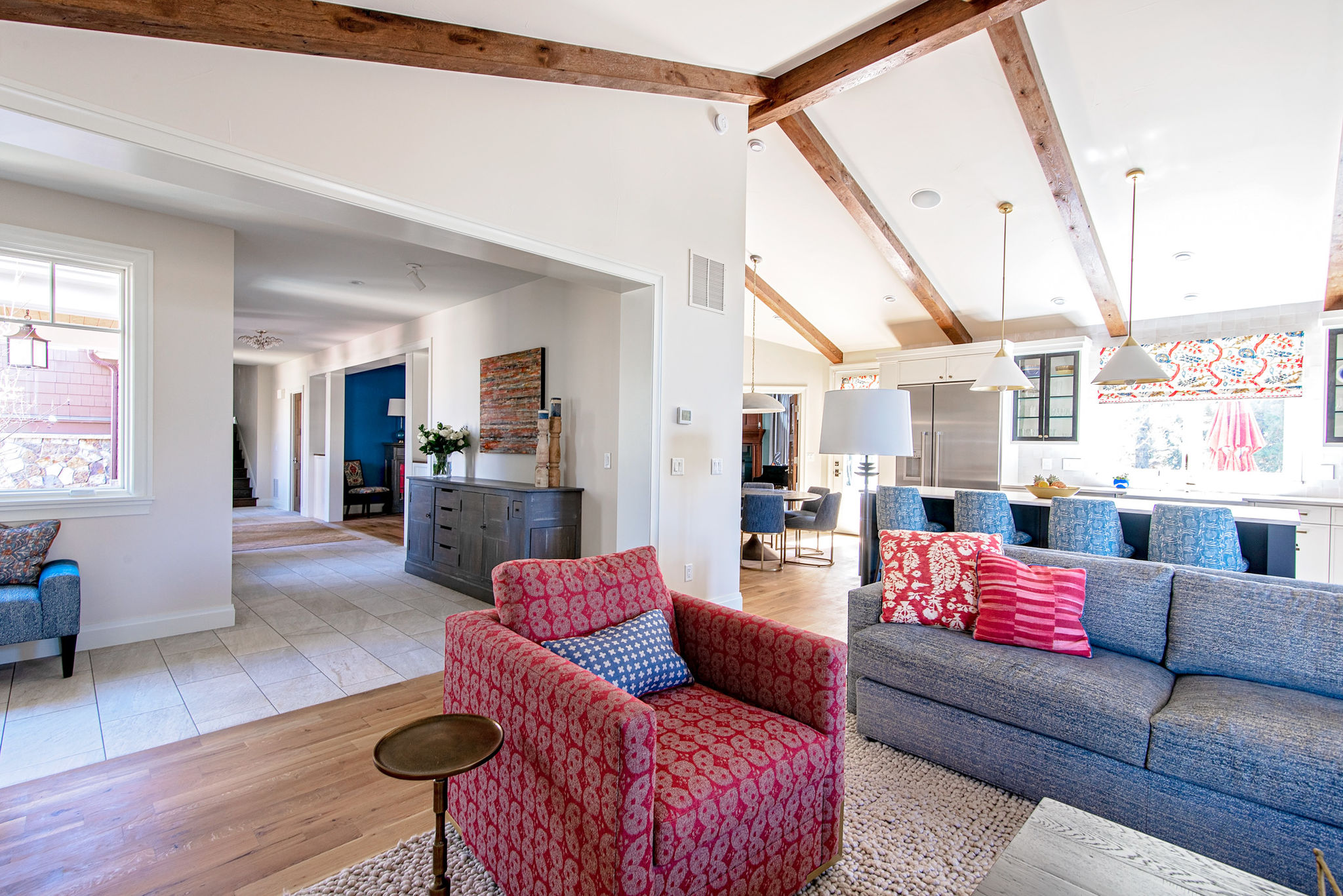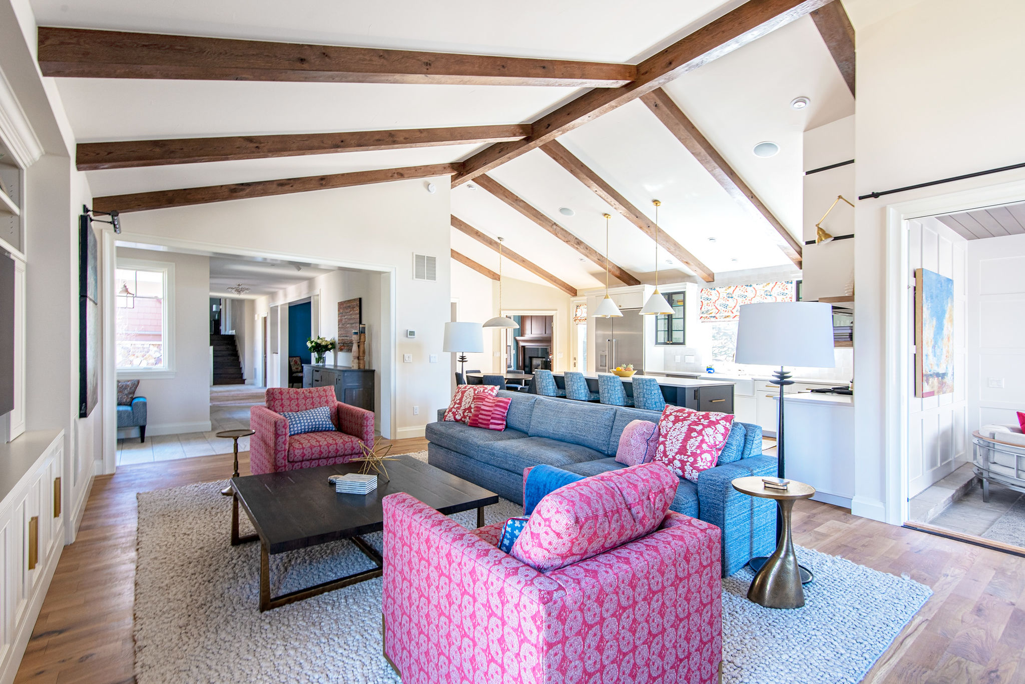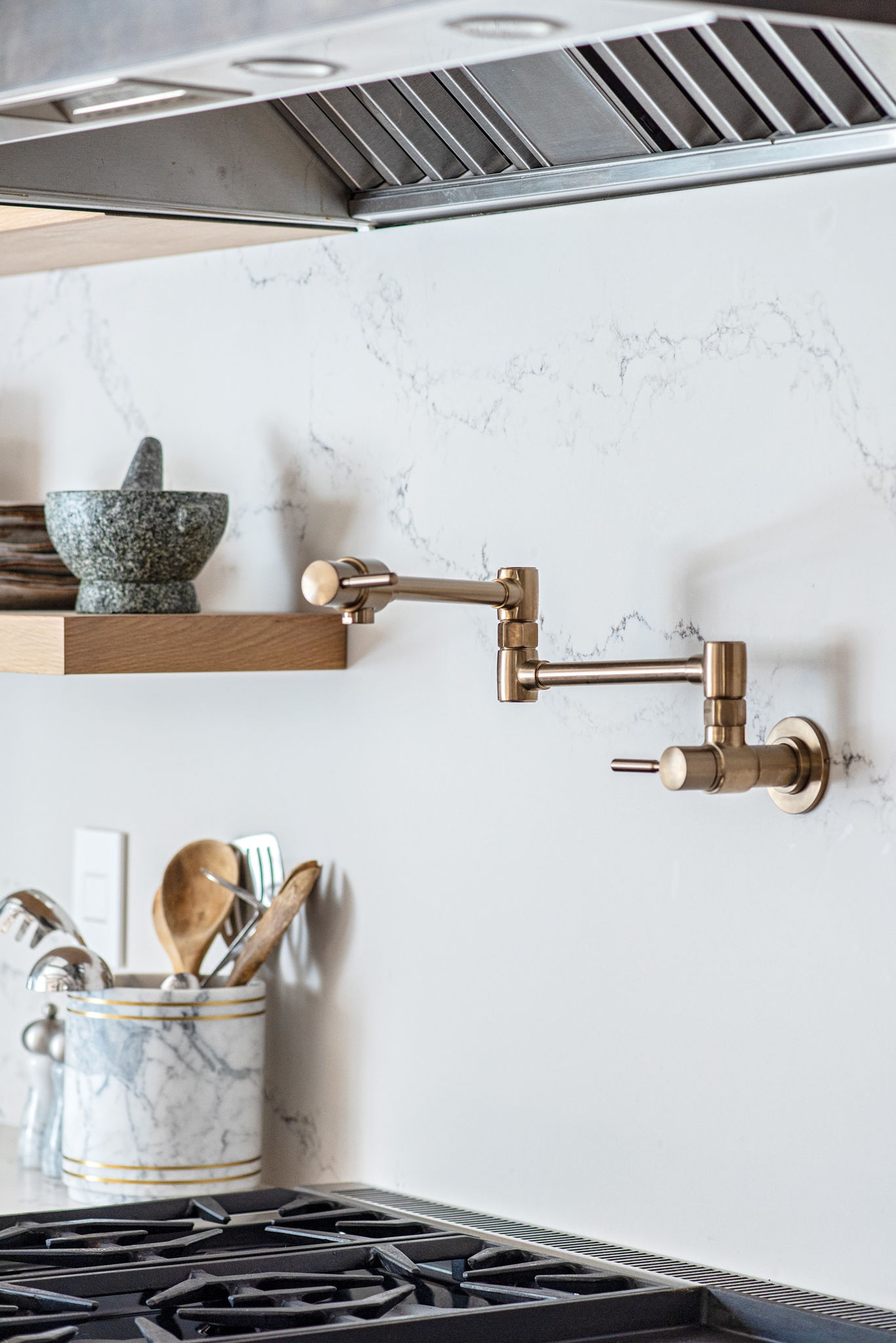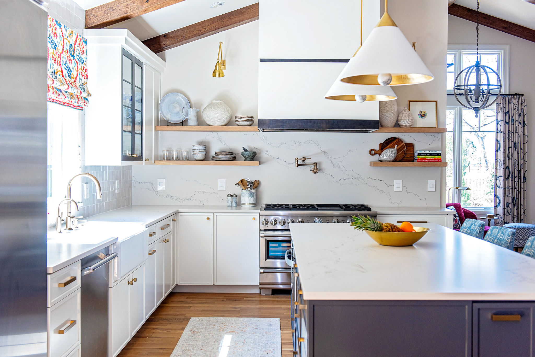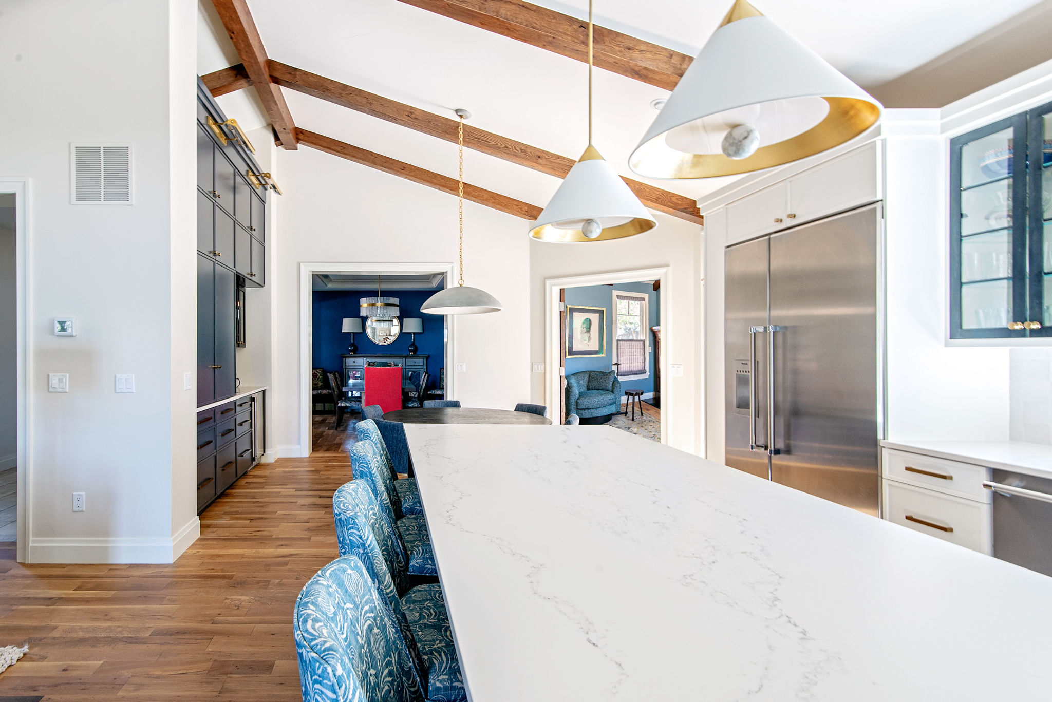 The striking kitchen & living room are the center of the home, creating a superb space for entertaining. The custom-designed kitchen boasts solid wood cabinets, honed quartz countertops, a handcrafted stove hood, six-burner stove, and farmhouse sink.