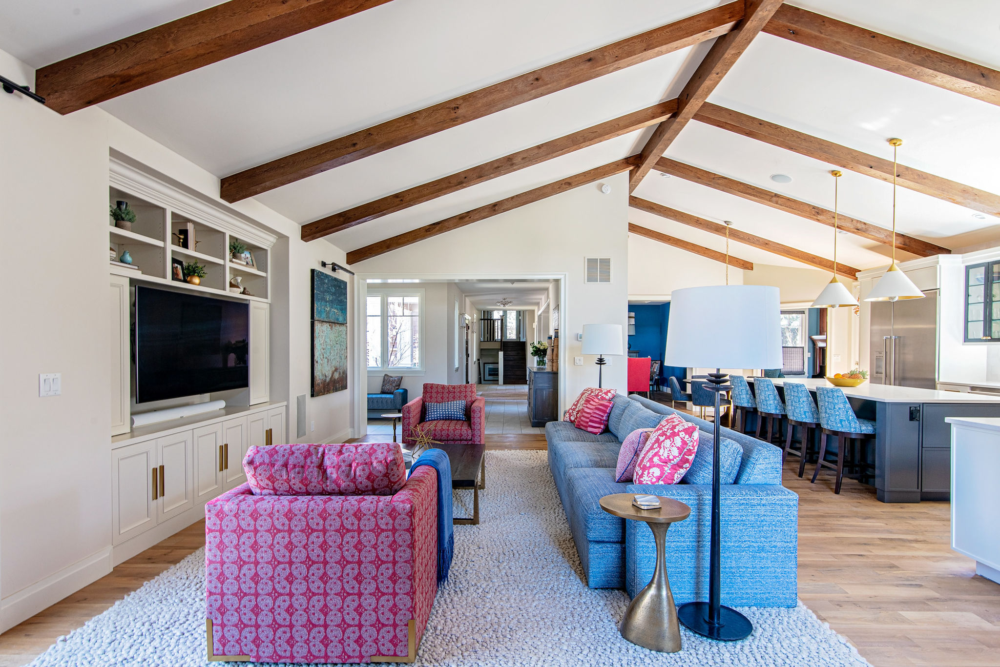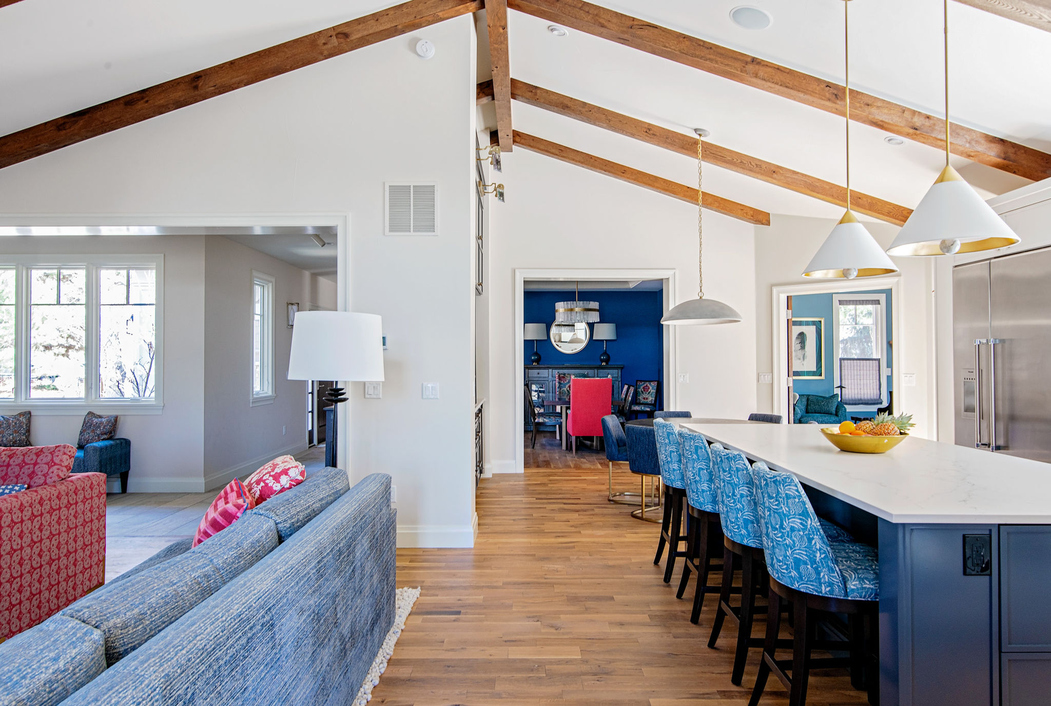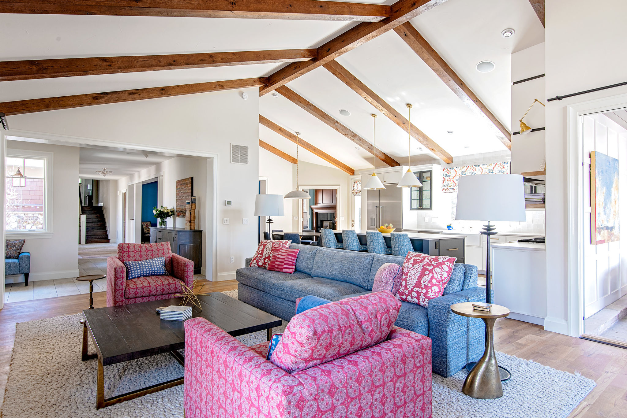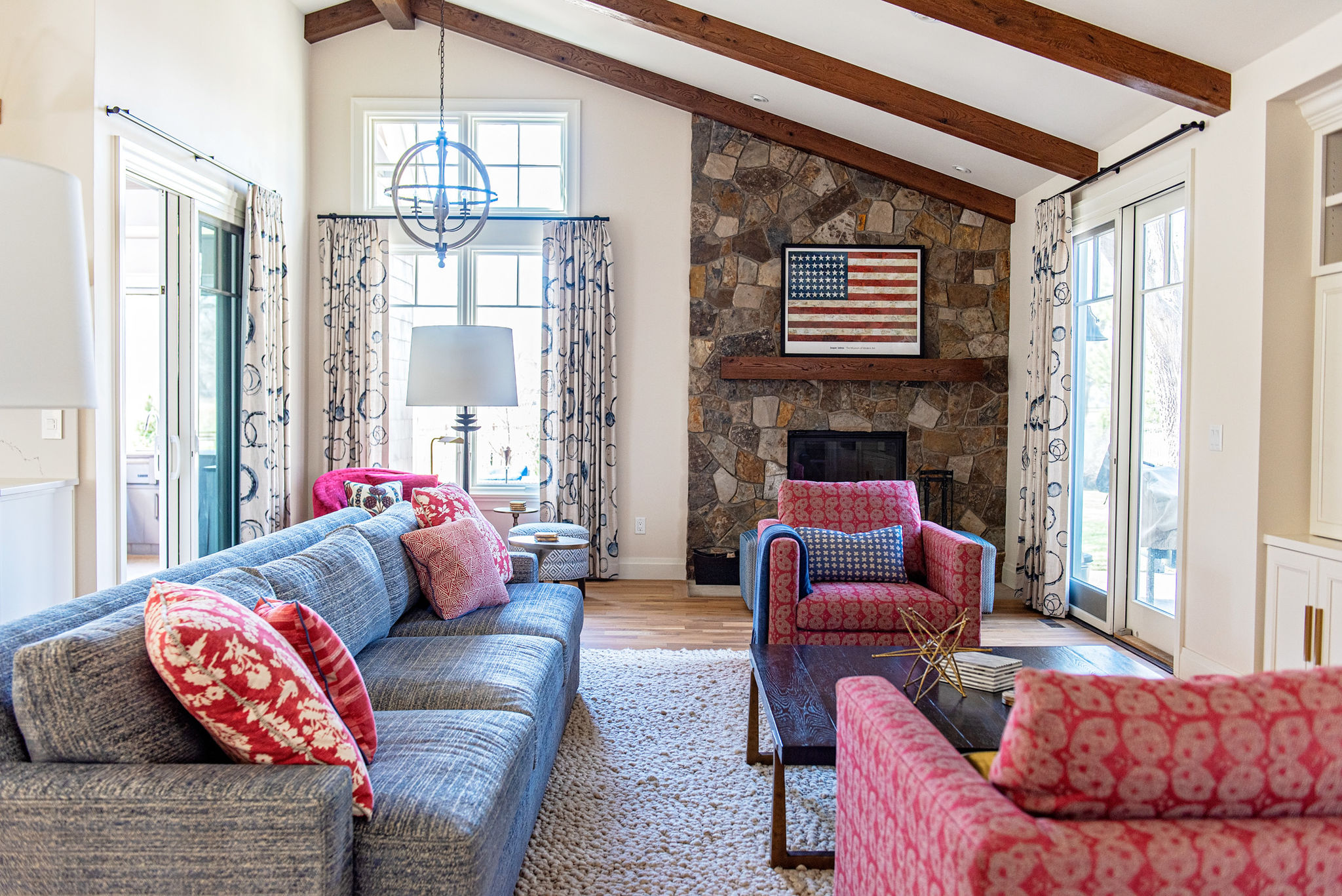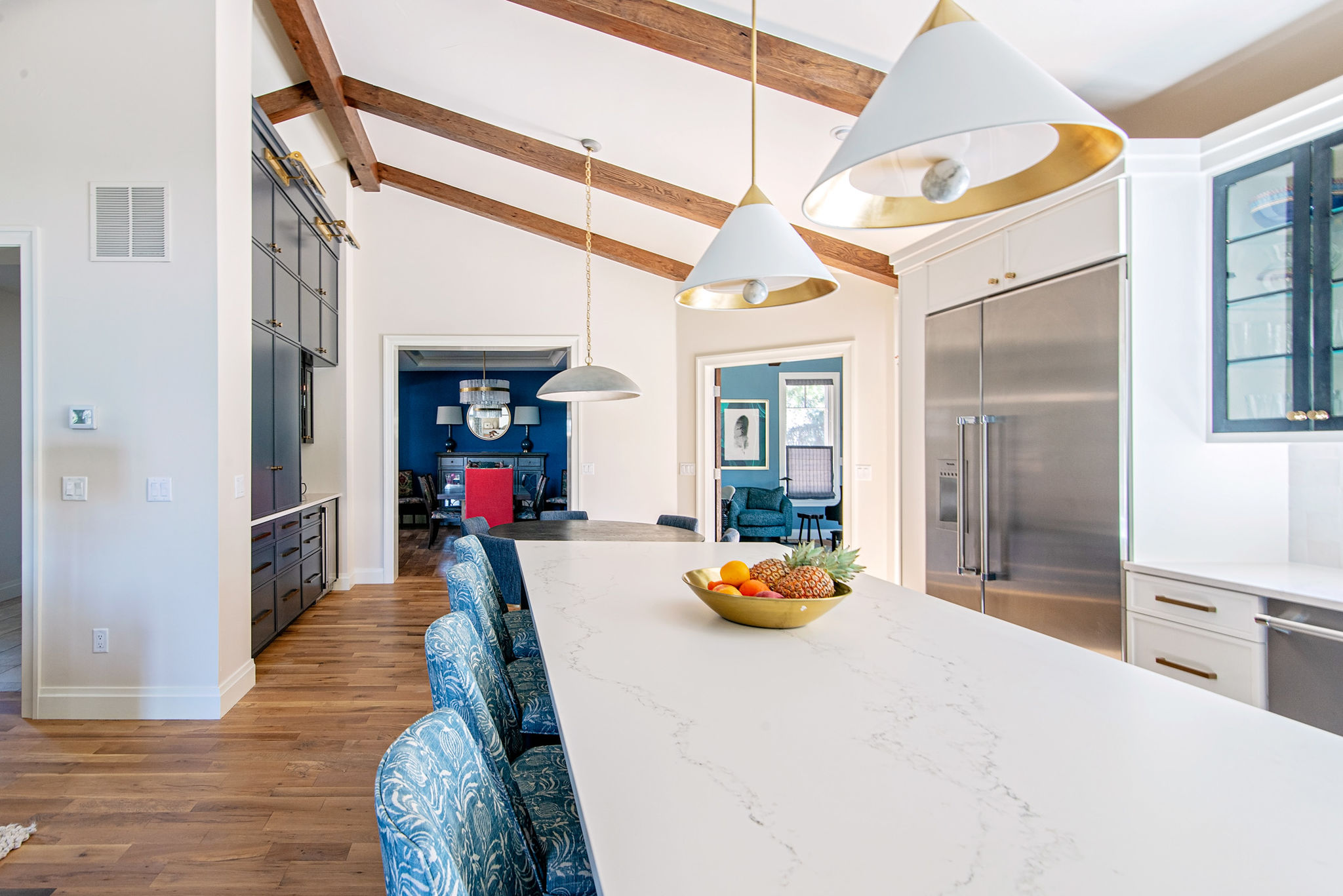 The striking kitchen & living room are the center of the home, creating a superb space for entertaining. The custom-designed kitchen boasts solid wood cabinets, honed quartz countertops, a handcrafted stove hood, six-burner stove, and farmhouse sink.