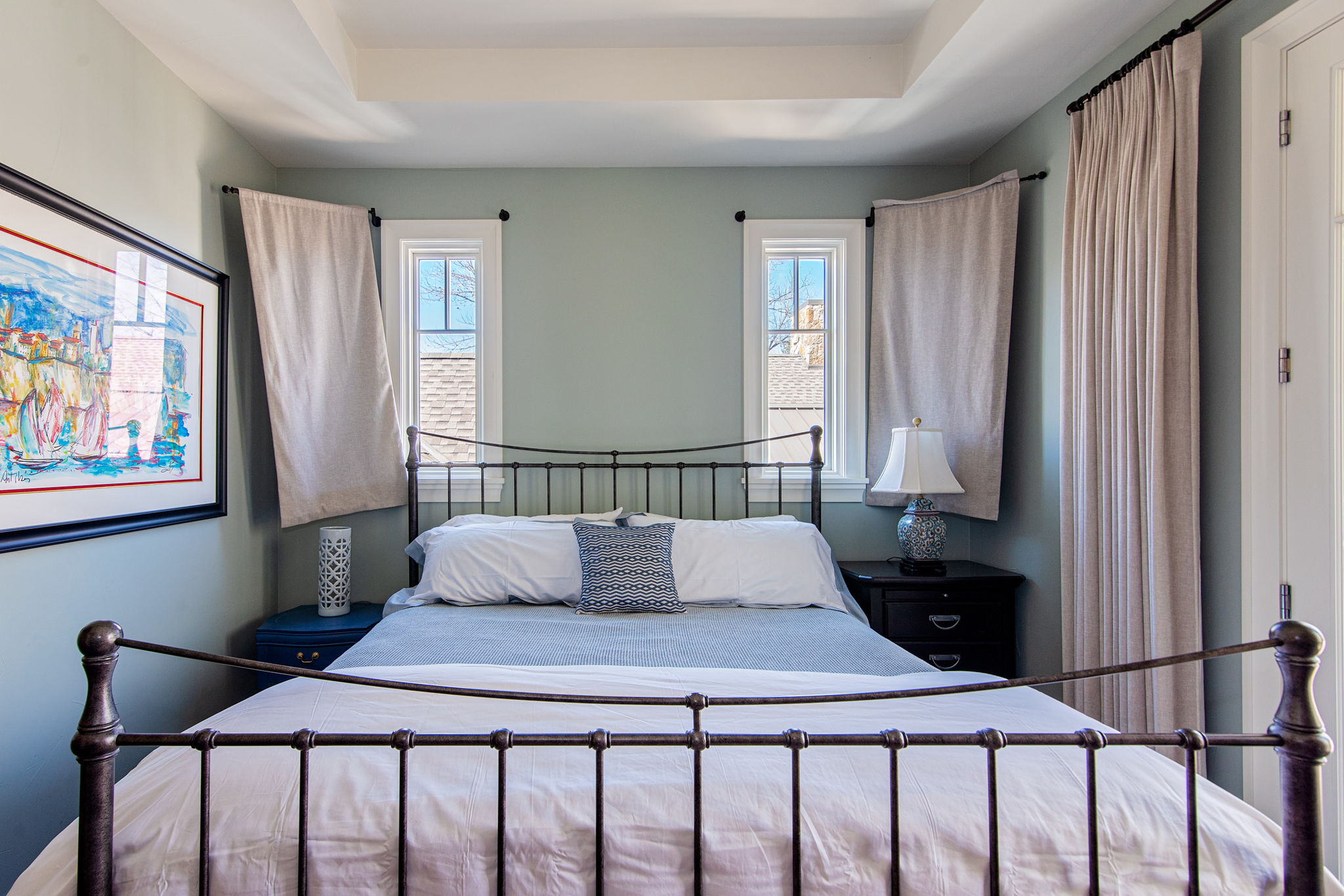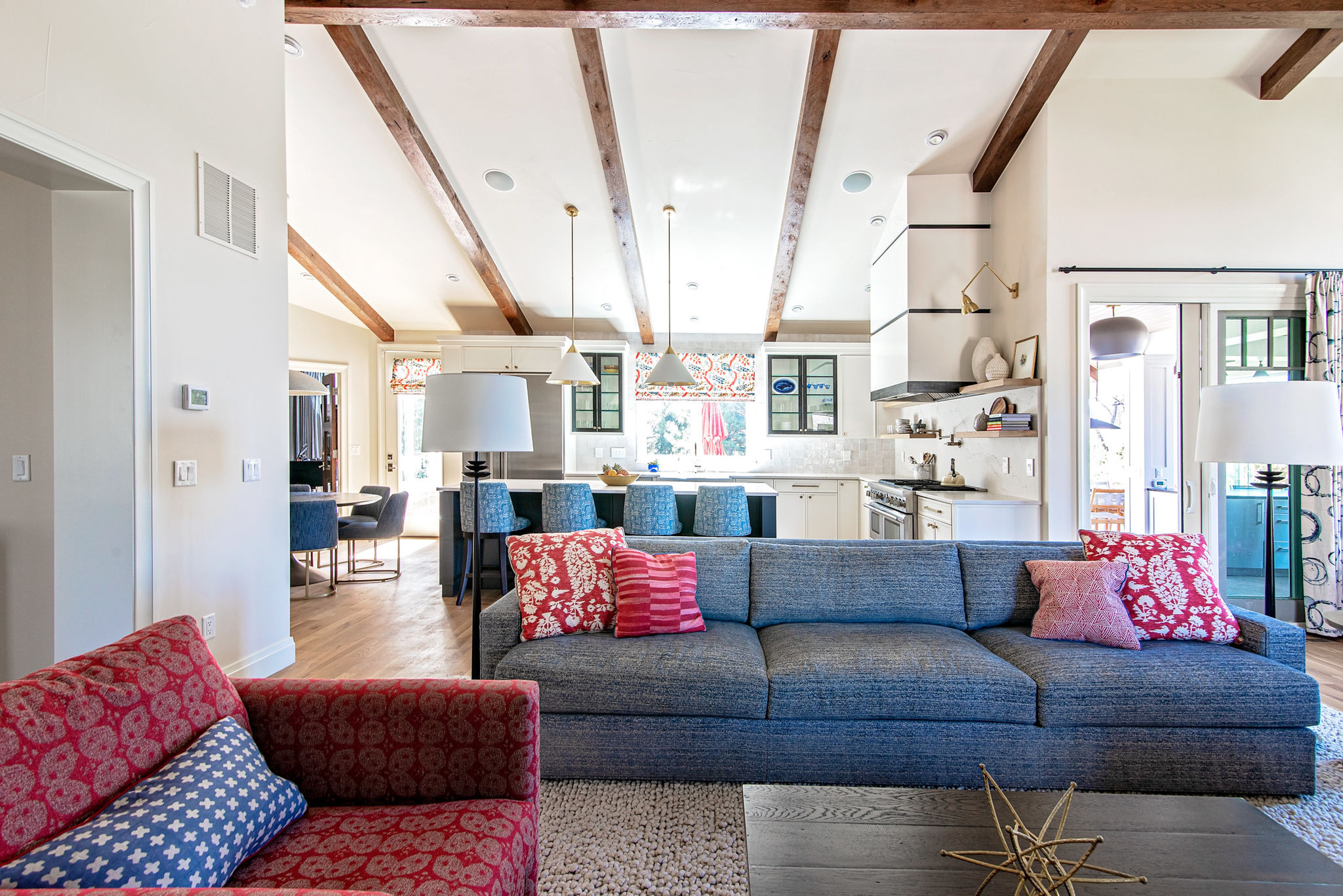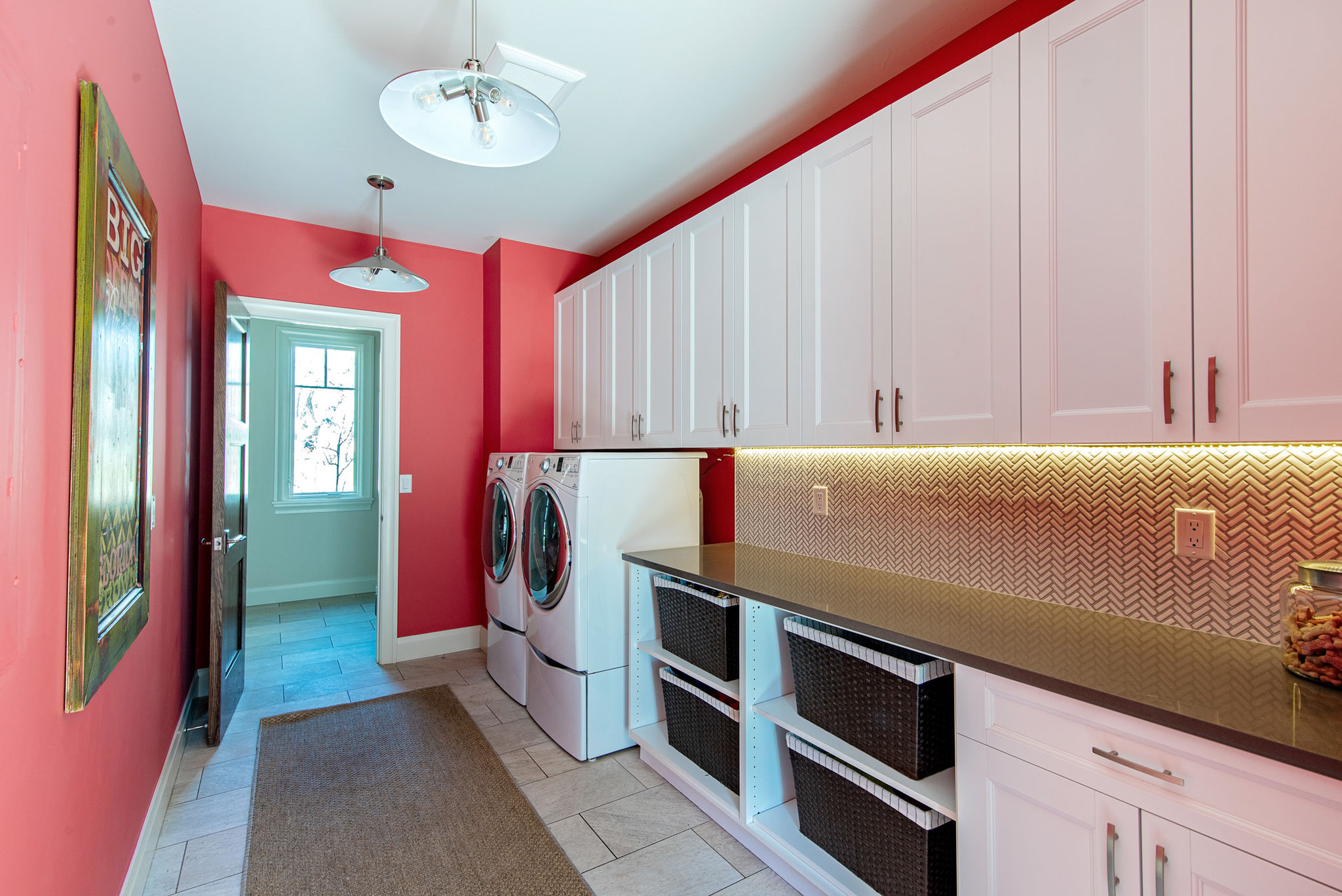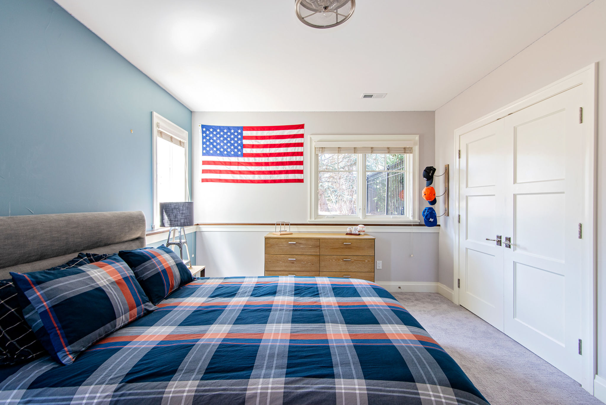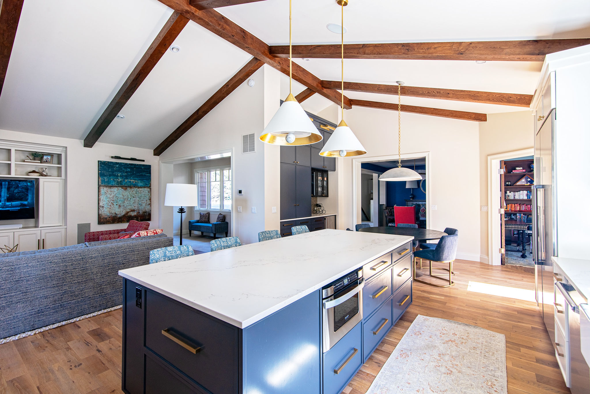 The striking kitchen & living room are the center of the home, creating a superb space for entertaining. The custom-designed kitchen boasts solid wood cabinets, honed quartz countertops, a handcrafted stove hood, six-burner stove, and farmhouse sink.