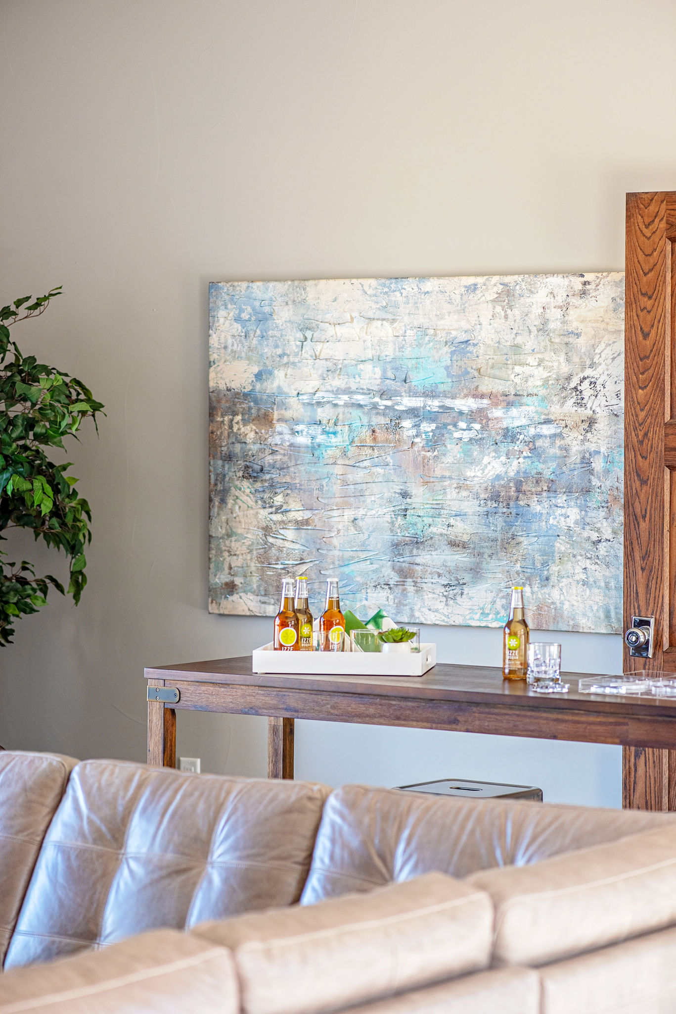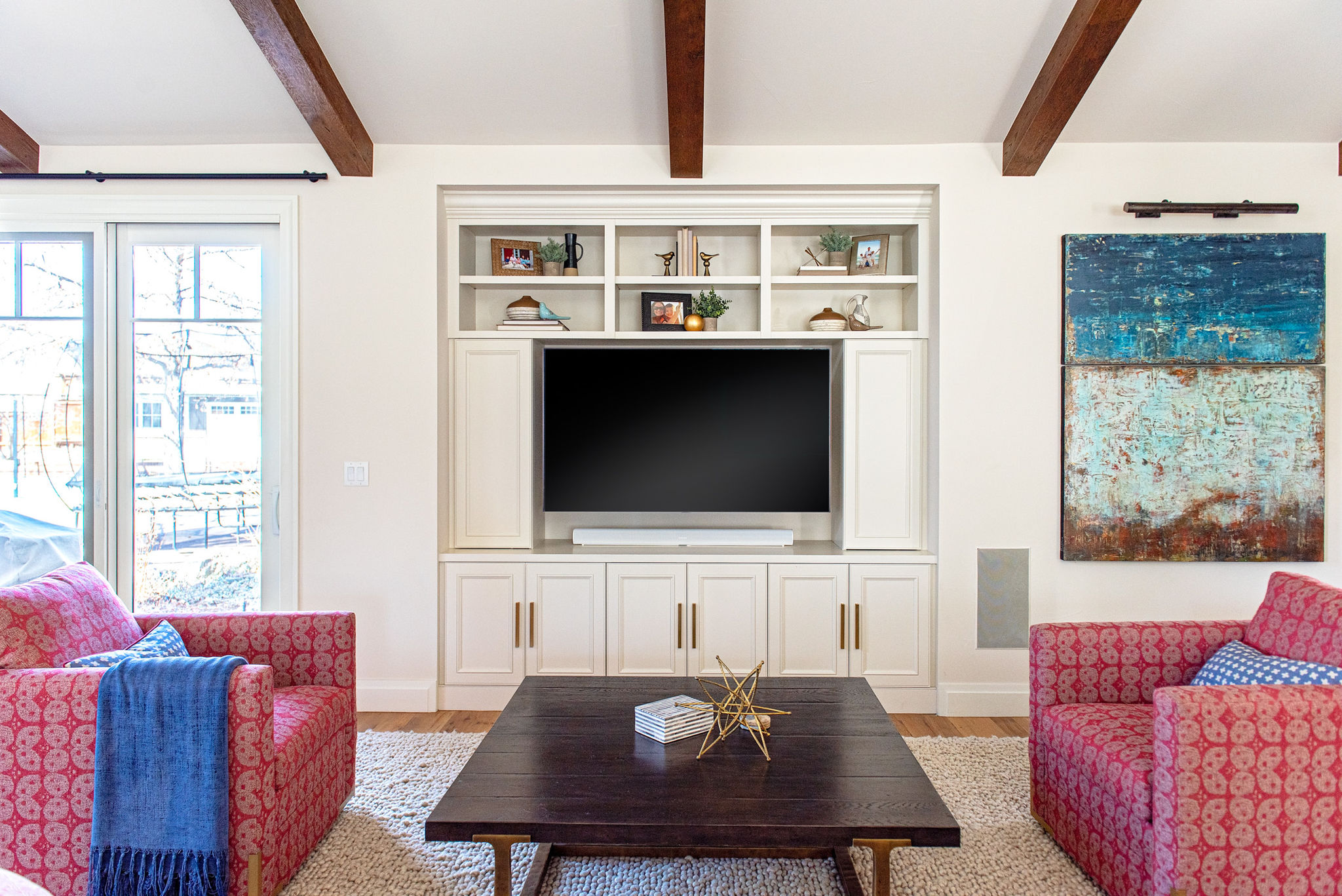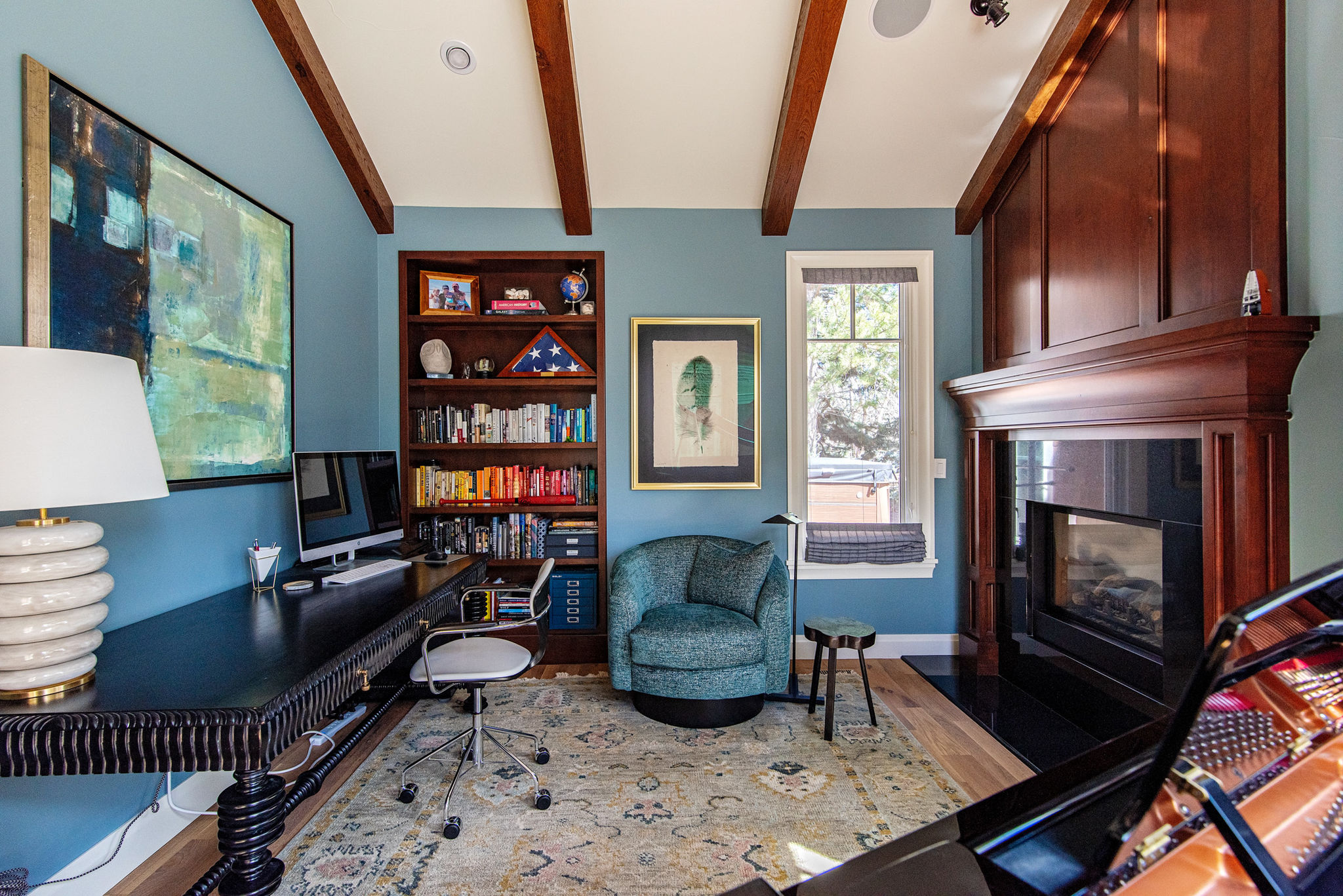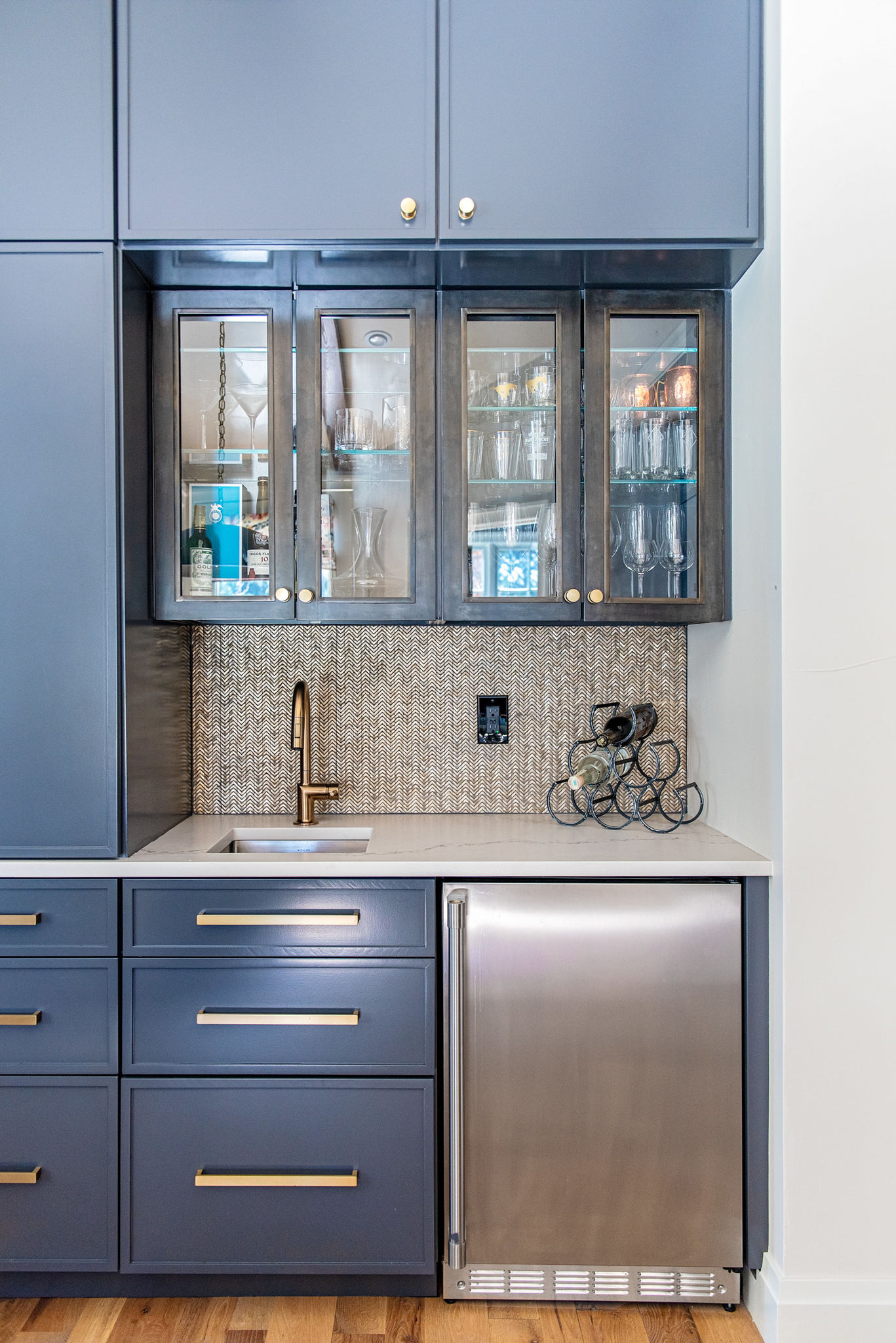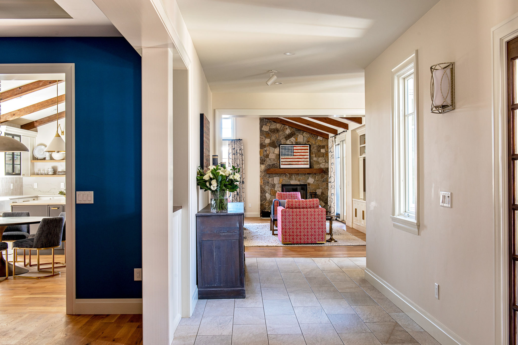The striking kitchen & living room are the center of the home, creating a superb space for entertaining. The custom-designed kitchen boasts solid wood cabinets, honed quartz countertops, a handcrafted stove hood, six-burner stove, and farmhouse sink.