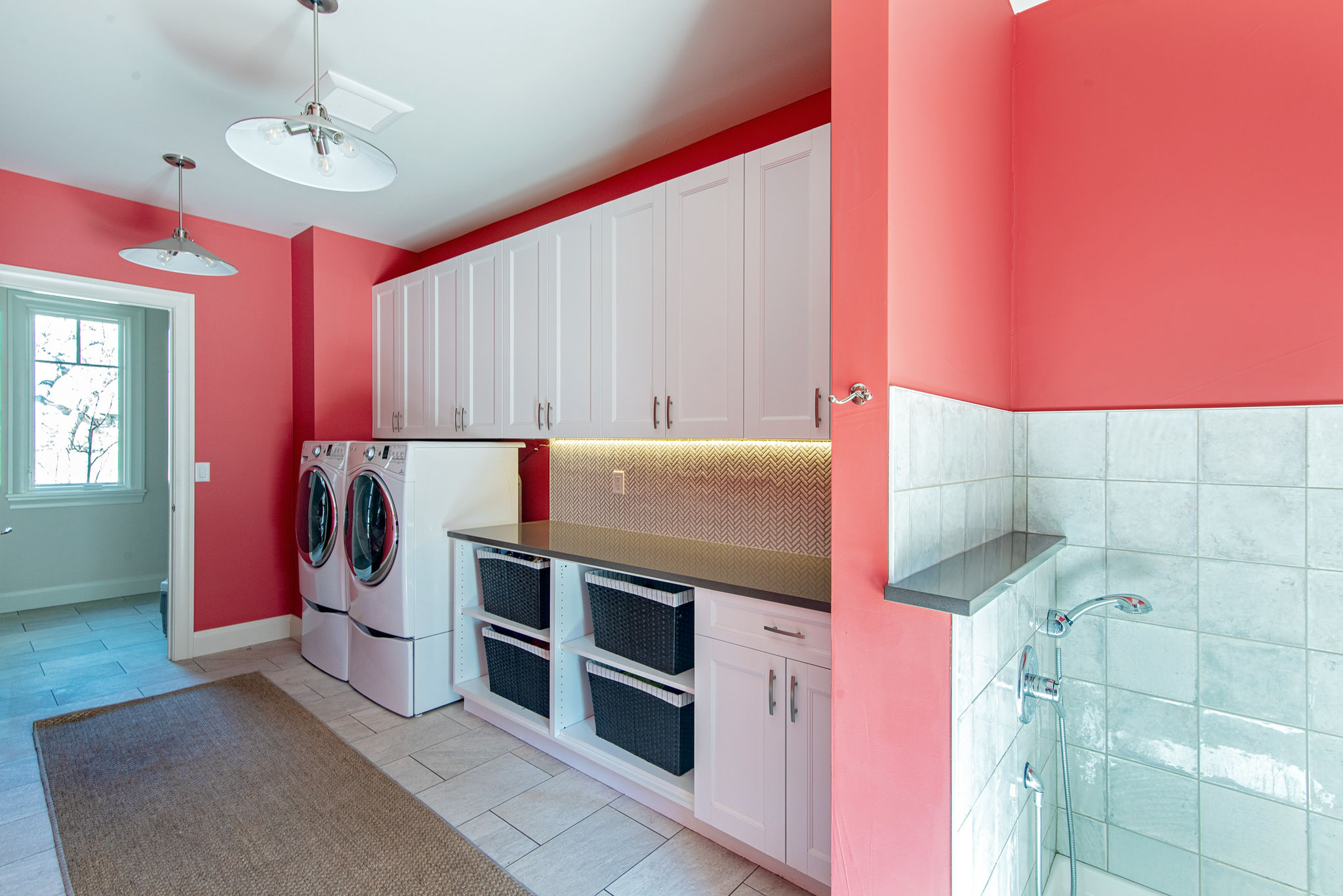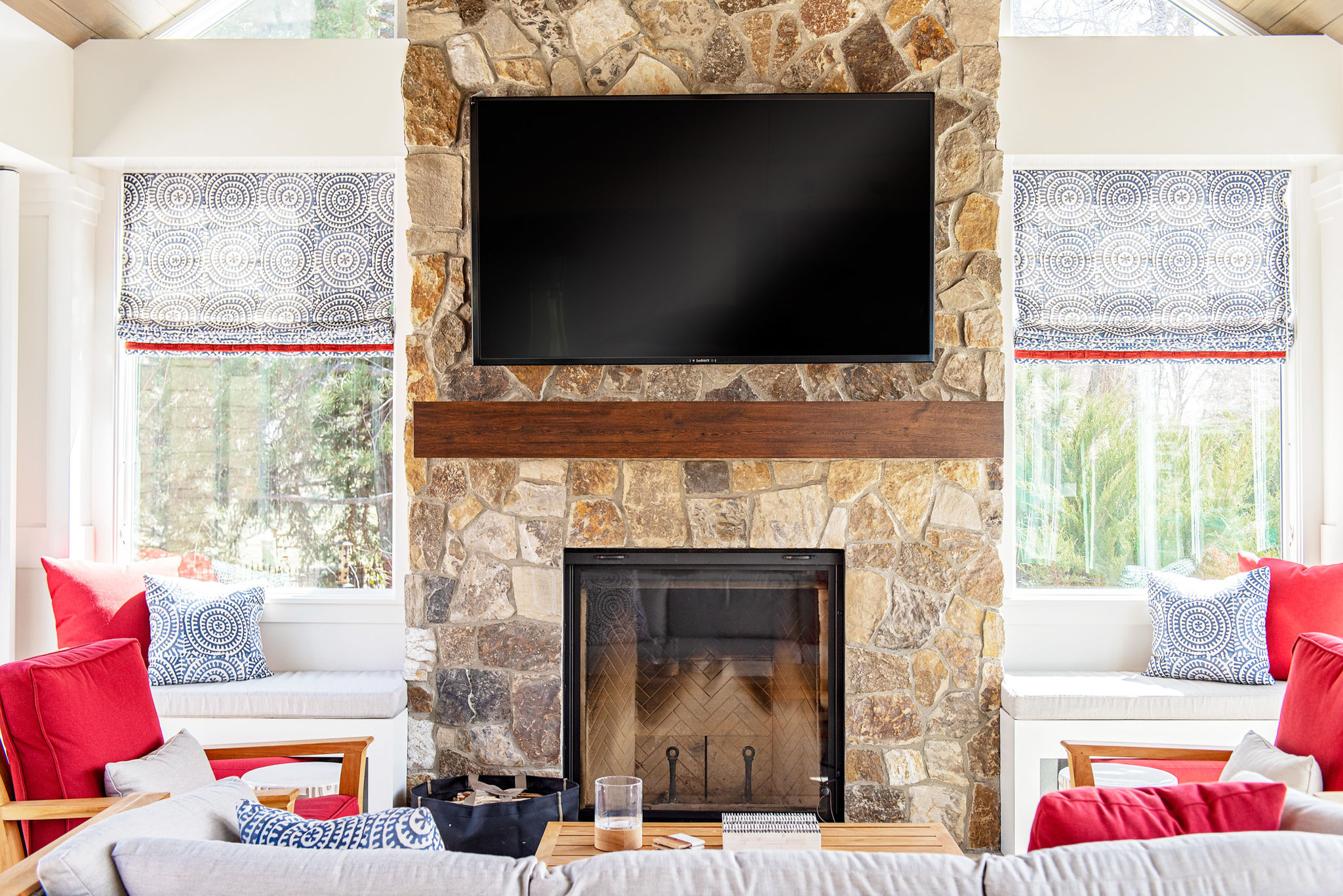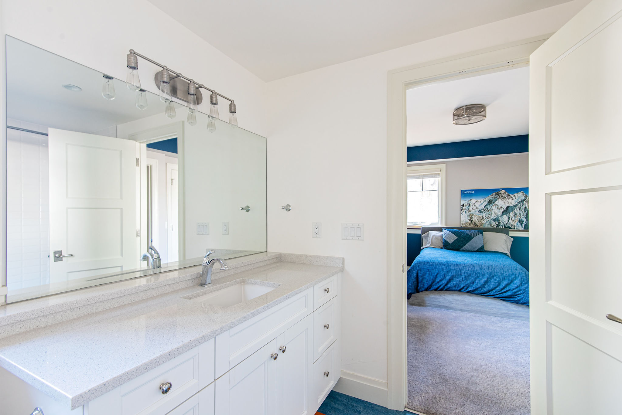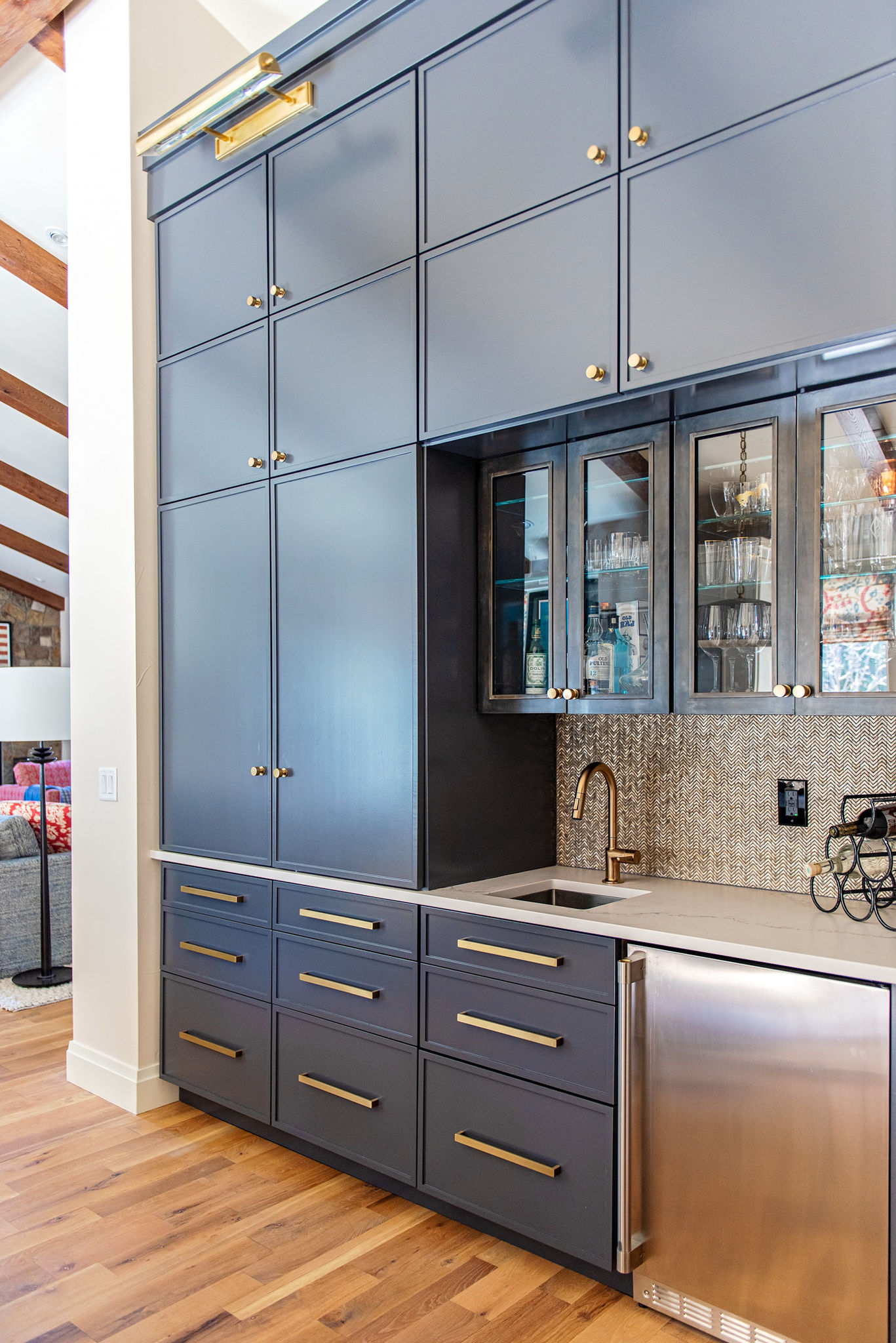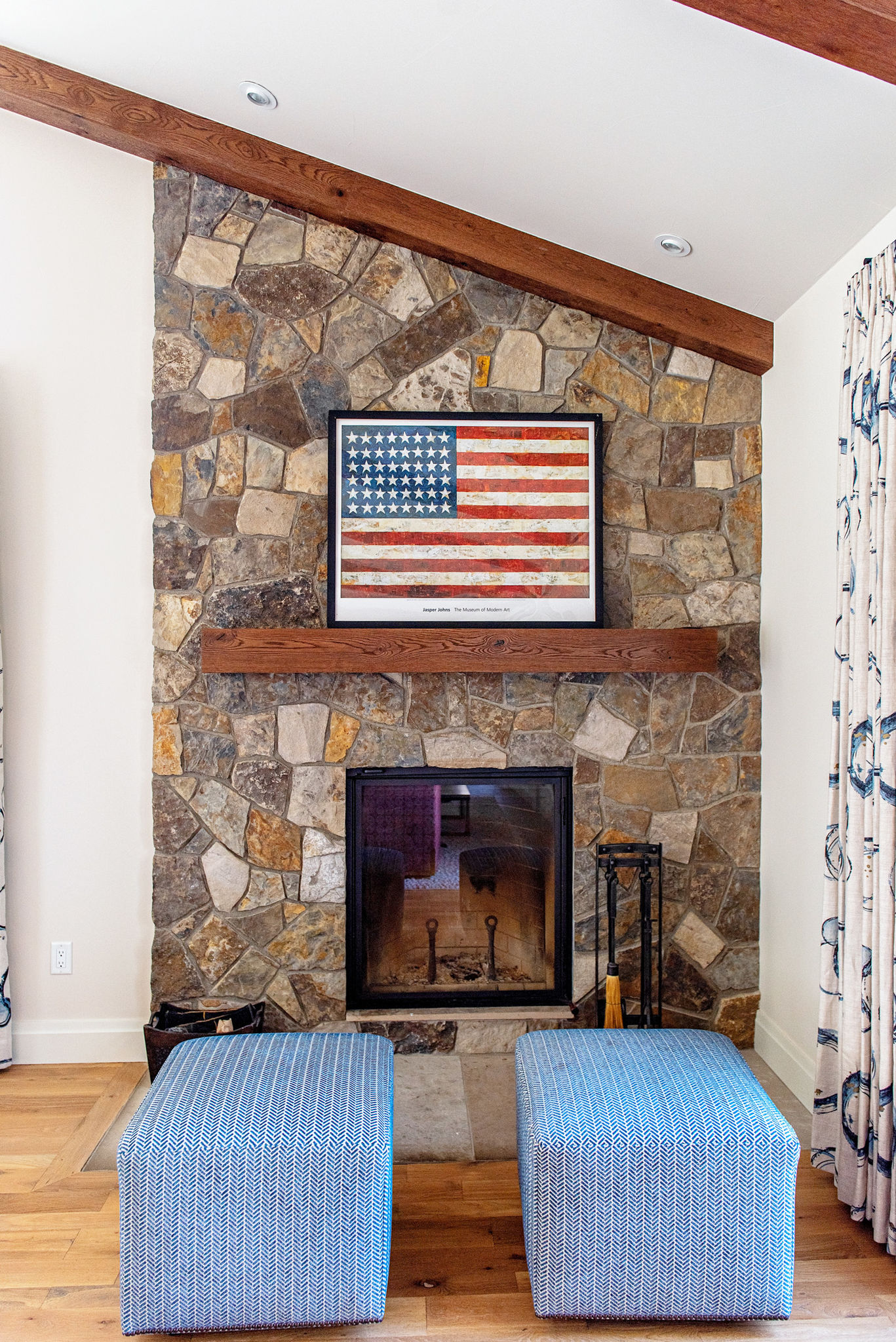 The striking kitchen & living room are the center of the home, creating a superb space for entertaining. The custom-designed kitchen boasts solid wood cabinets, honed quartz countertops, a handcrafted stove hood, six-burner stove, and farmhouse sink.