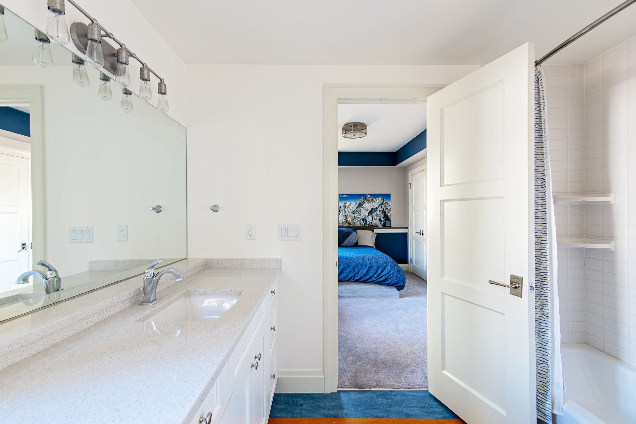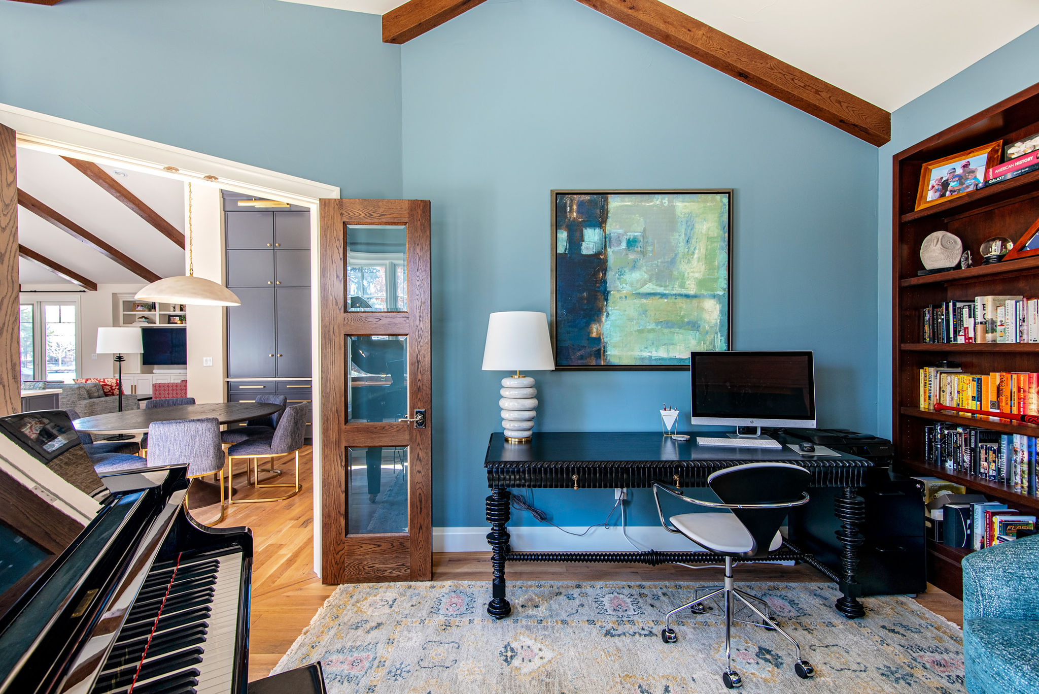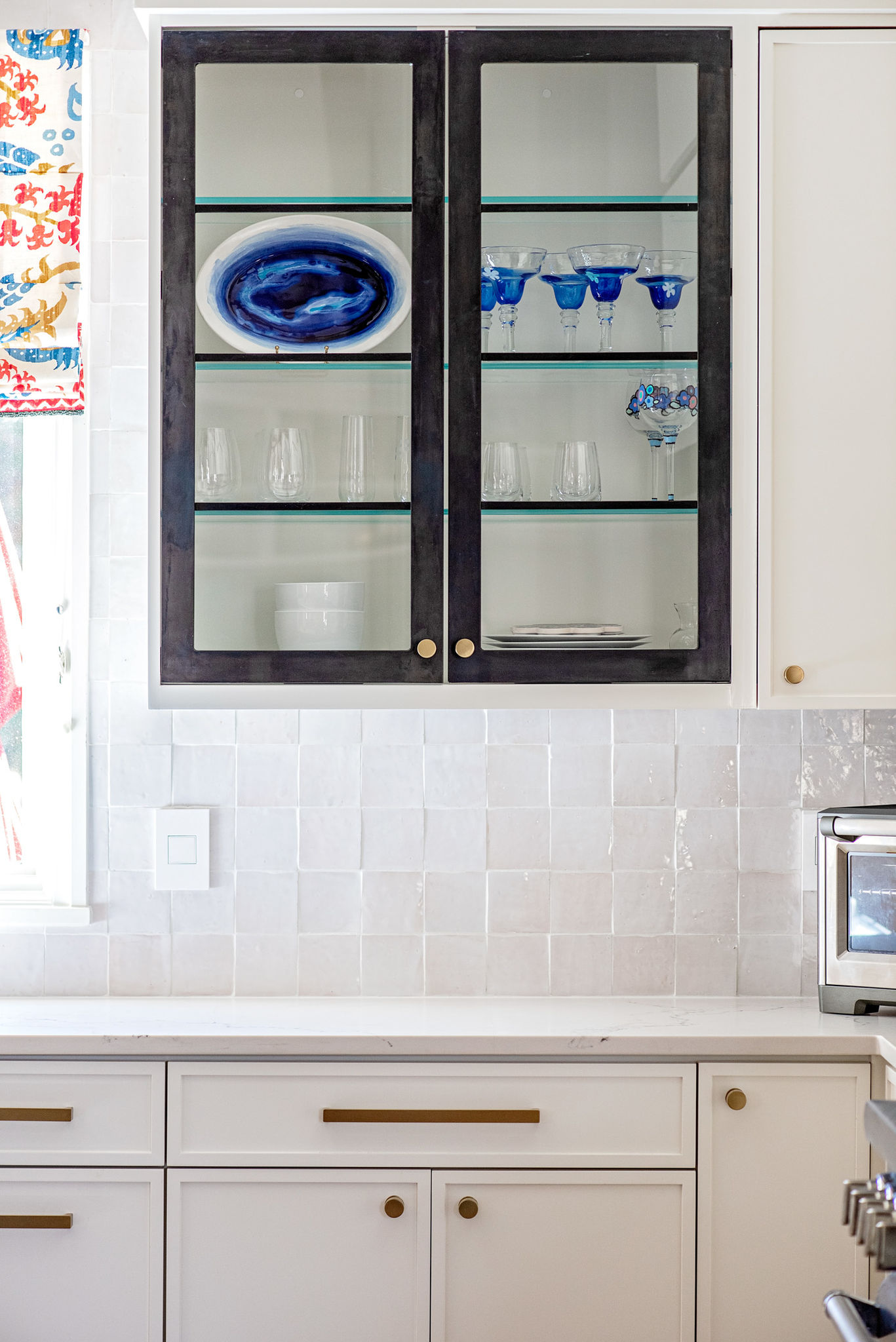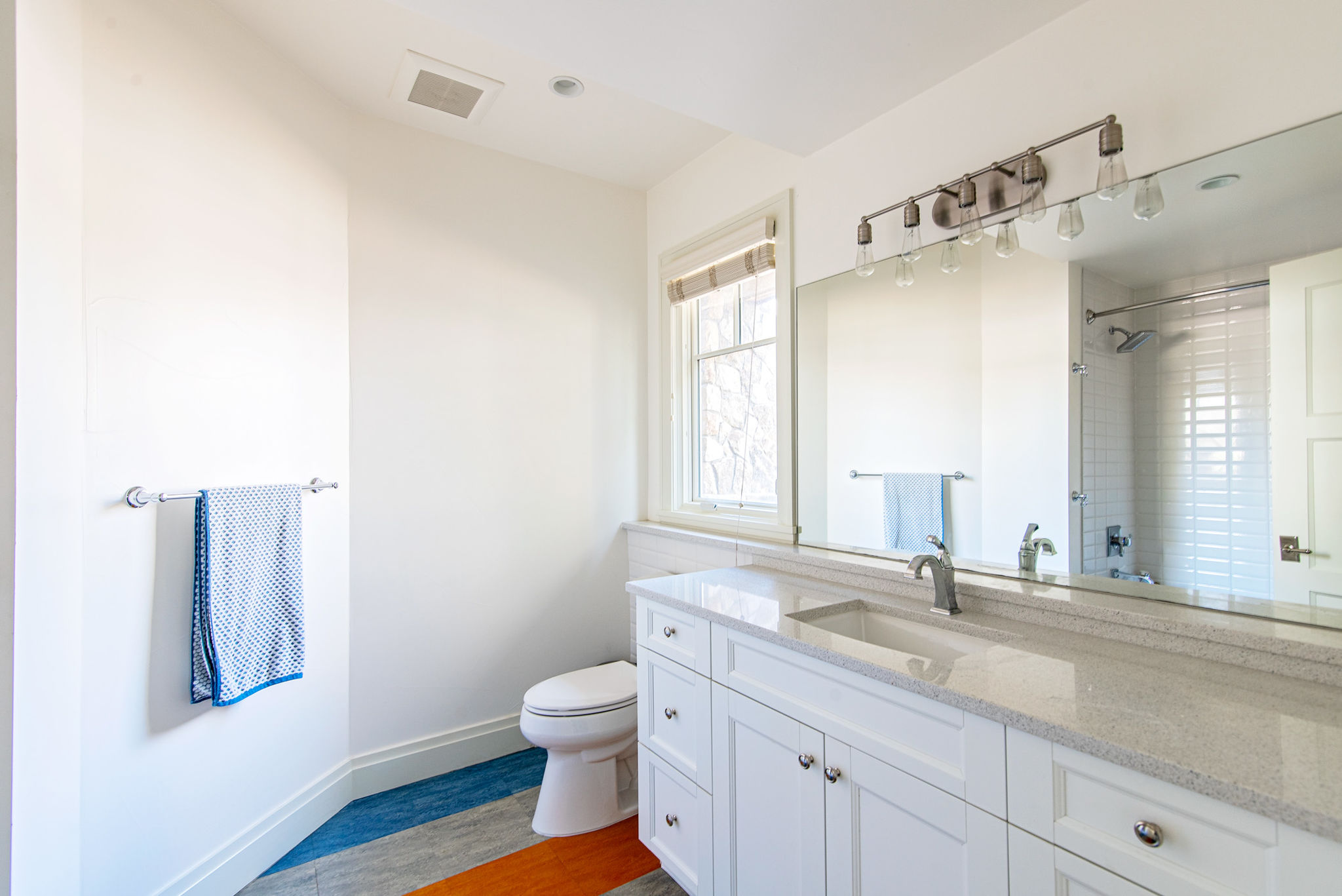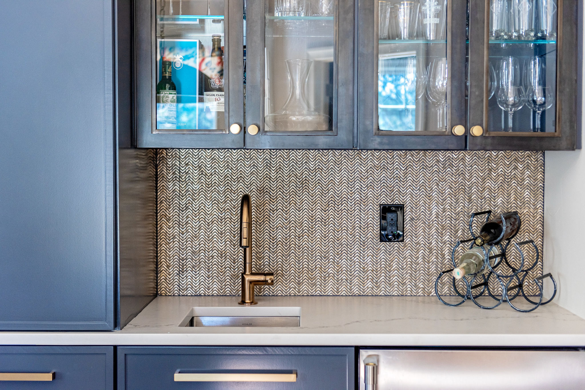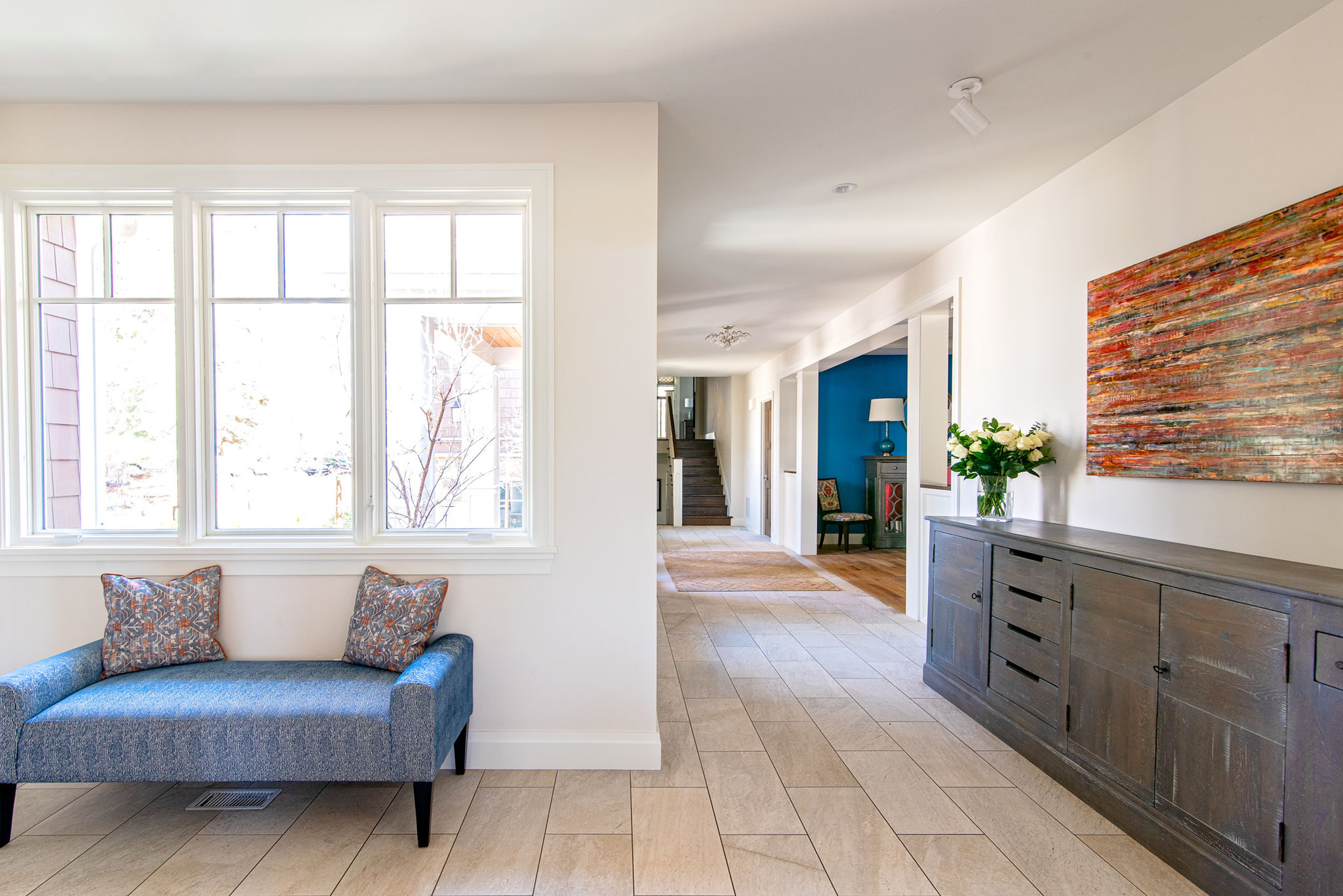 The striking kitchen & living room are the center of the home, creating a superb space for entertaining. The custom-designed kitchen boasts solid wood cabinets, honed quartz countertops, a handcrafted stove hood, six-burner stove, and farmhouse sink.