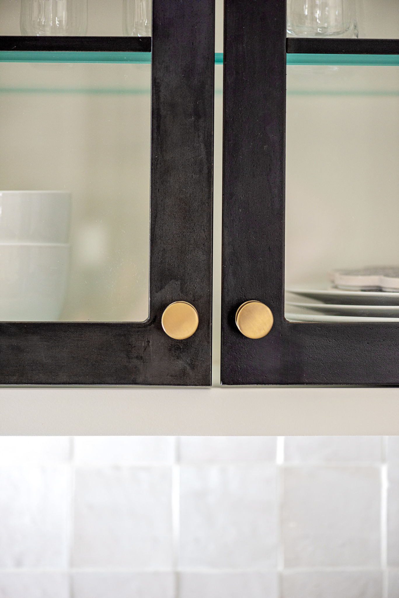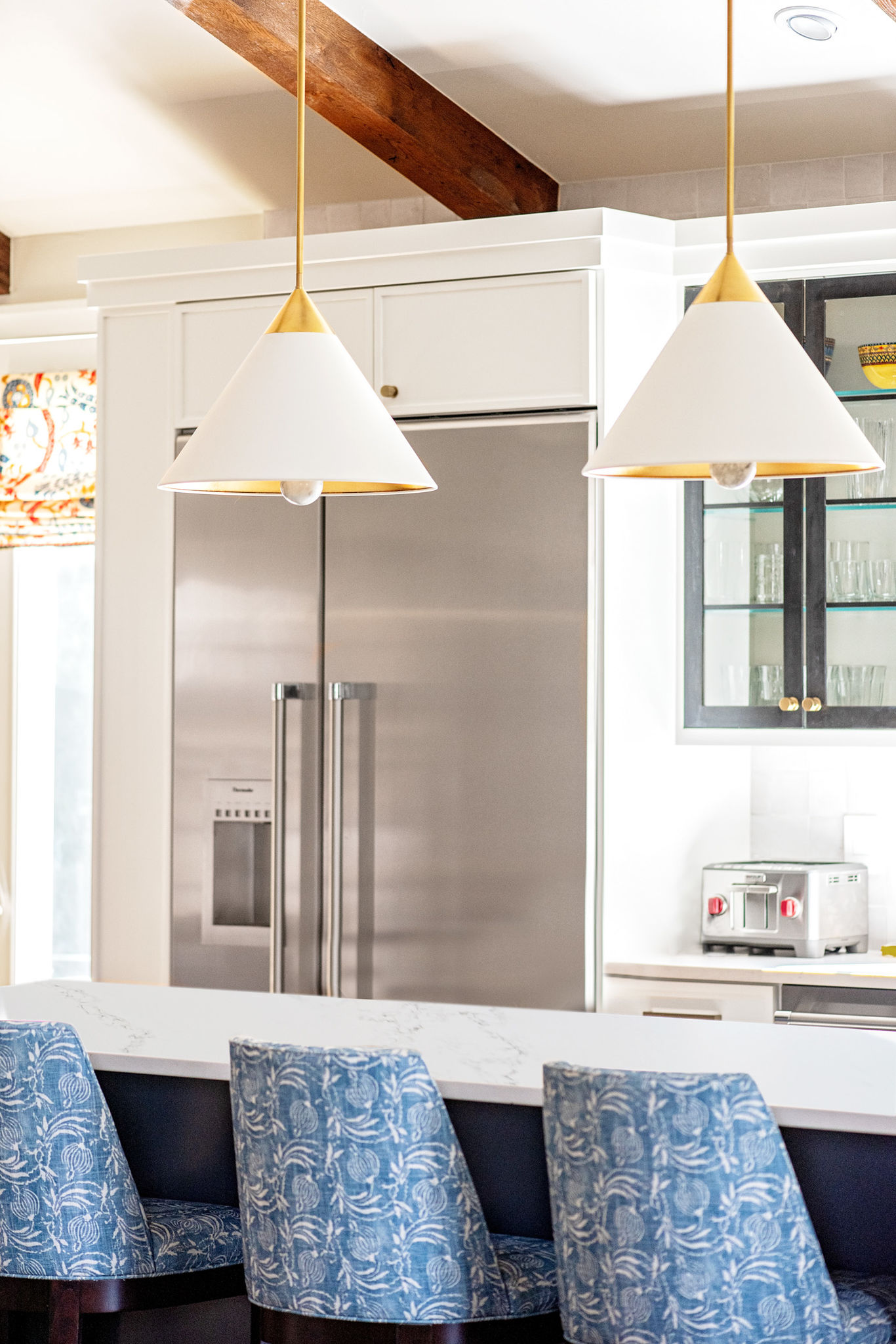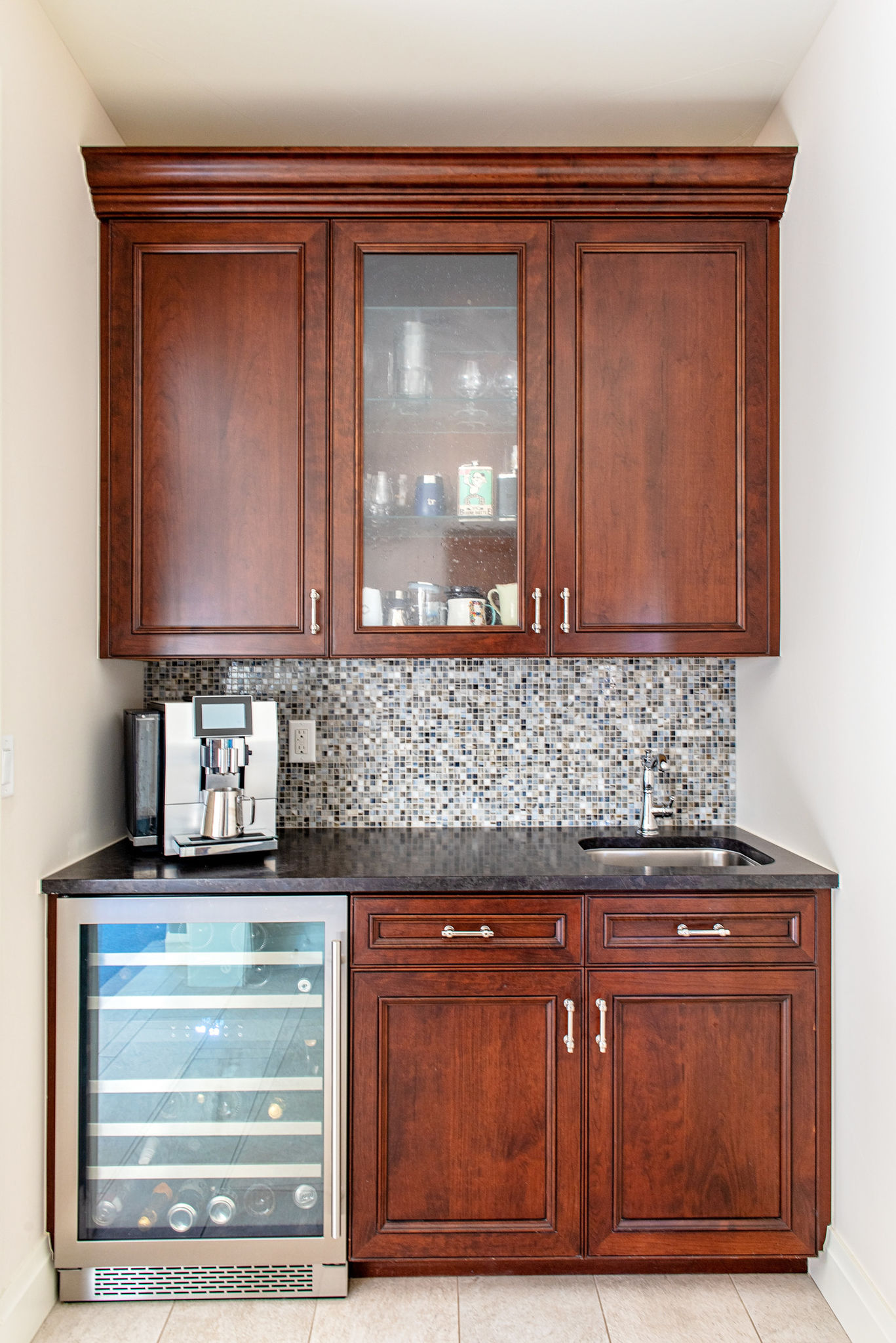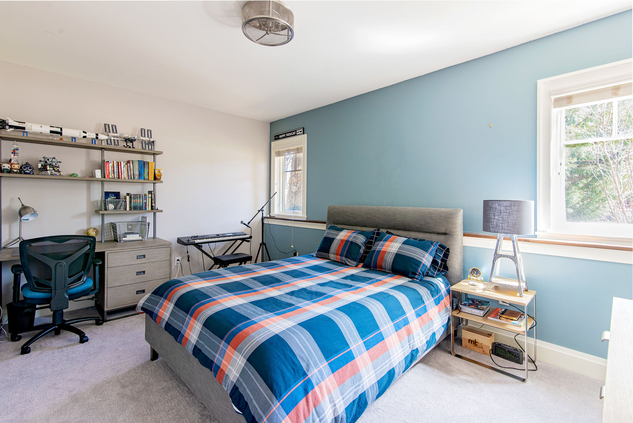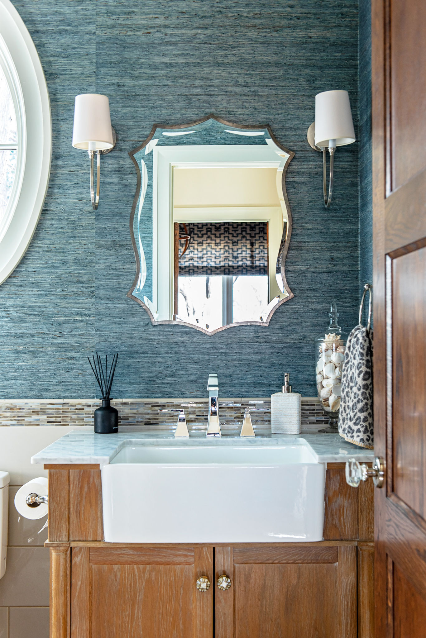 The striking kitchen & living room are the center of the home, creating a superb space for entertaining. The custom-designed kitchen boasts solid wood cabinets, honed quartz countertops, a handcrafted stove hood, six-burner stove, and farmhouse sink.