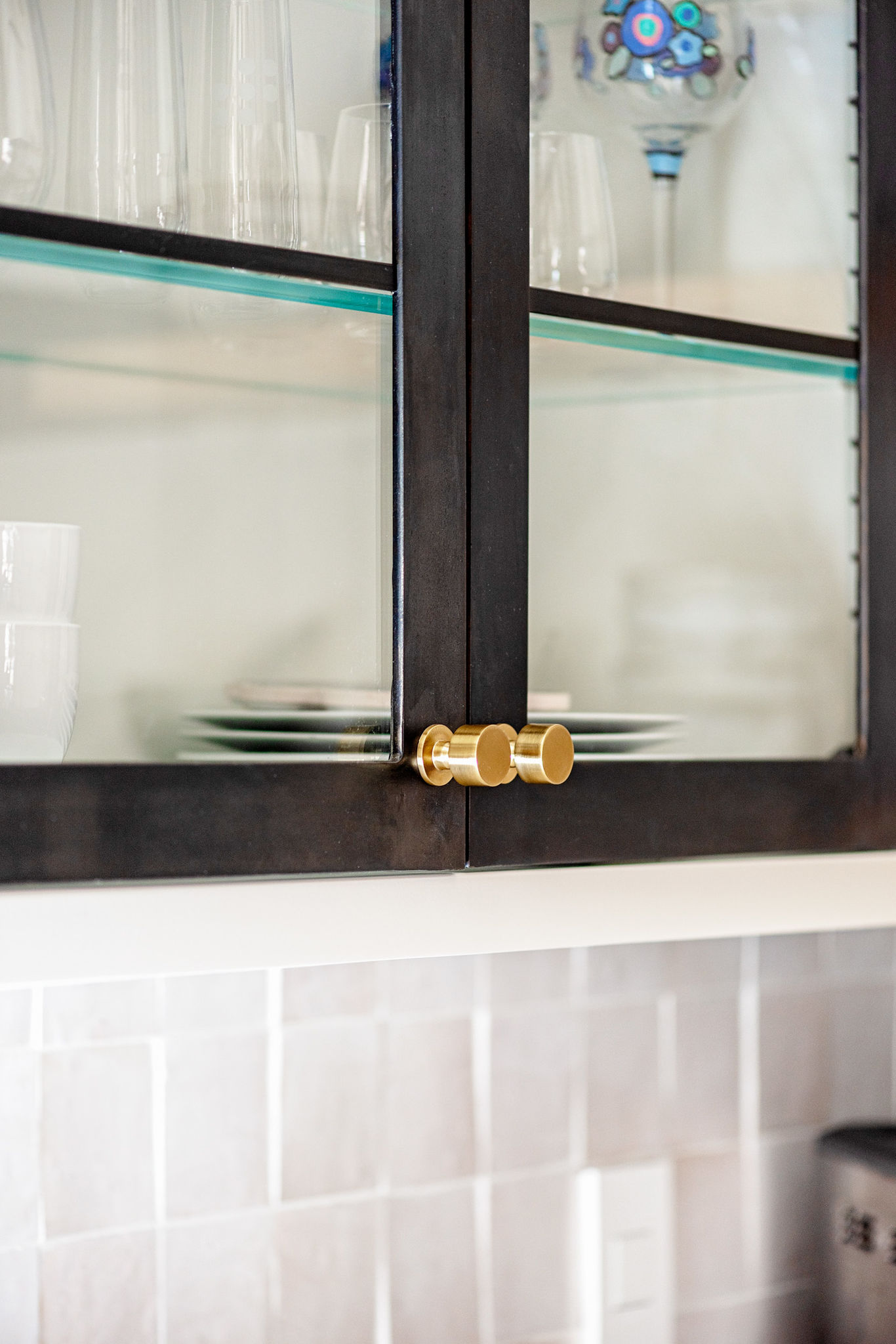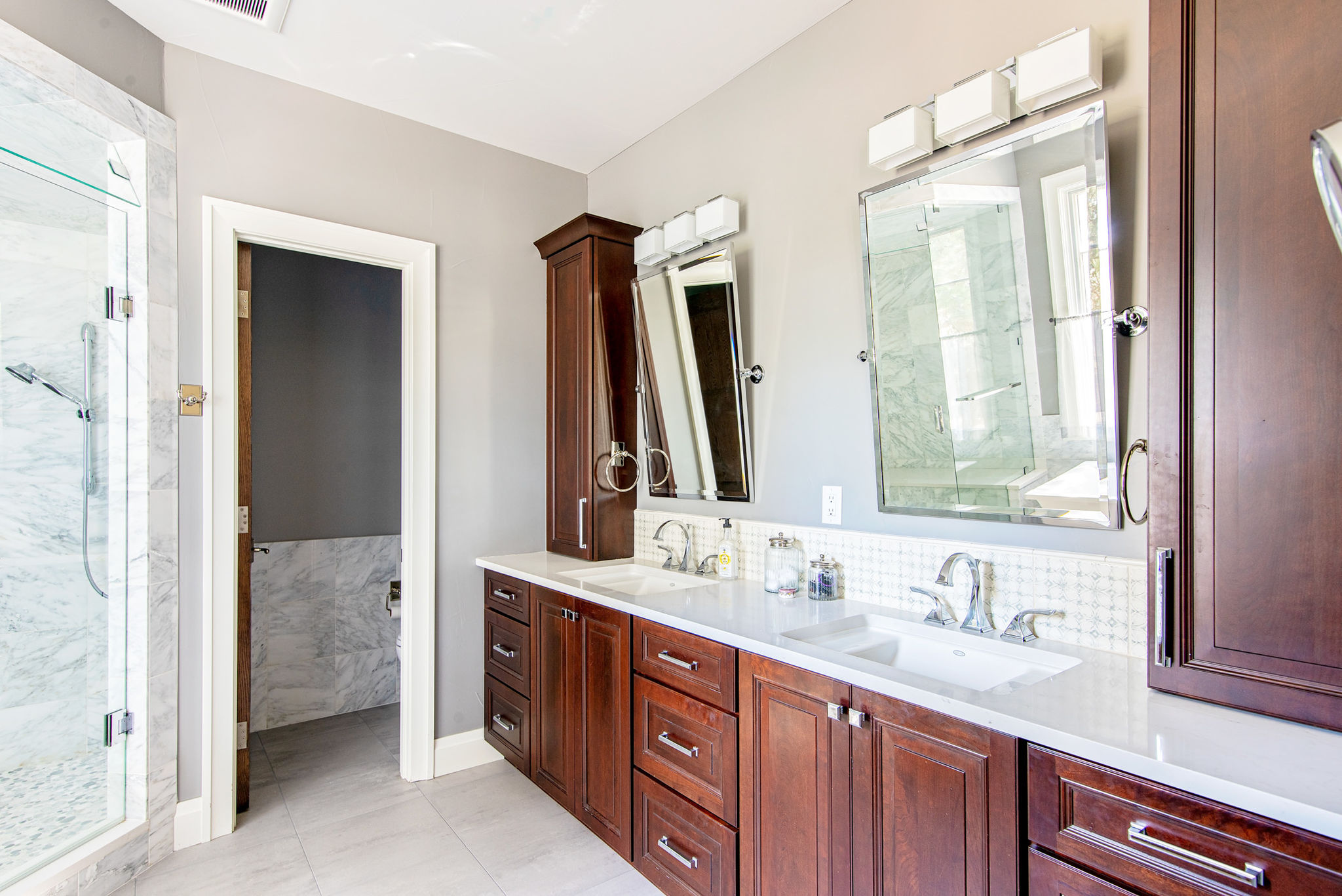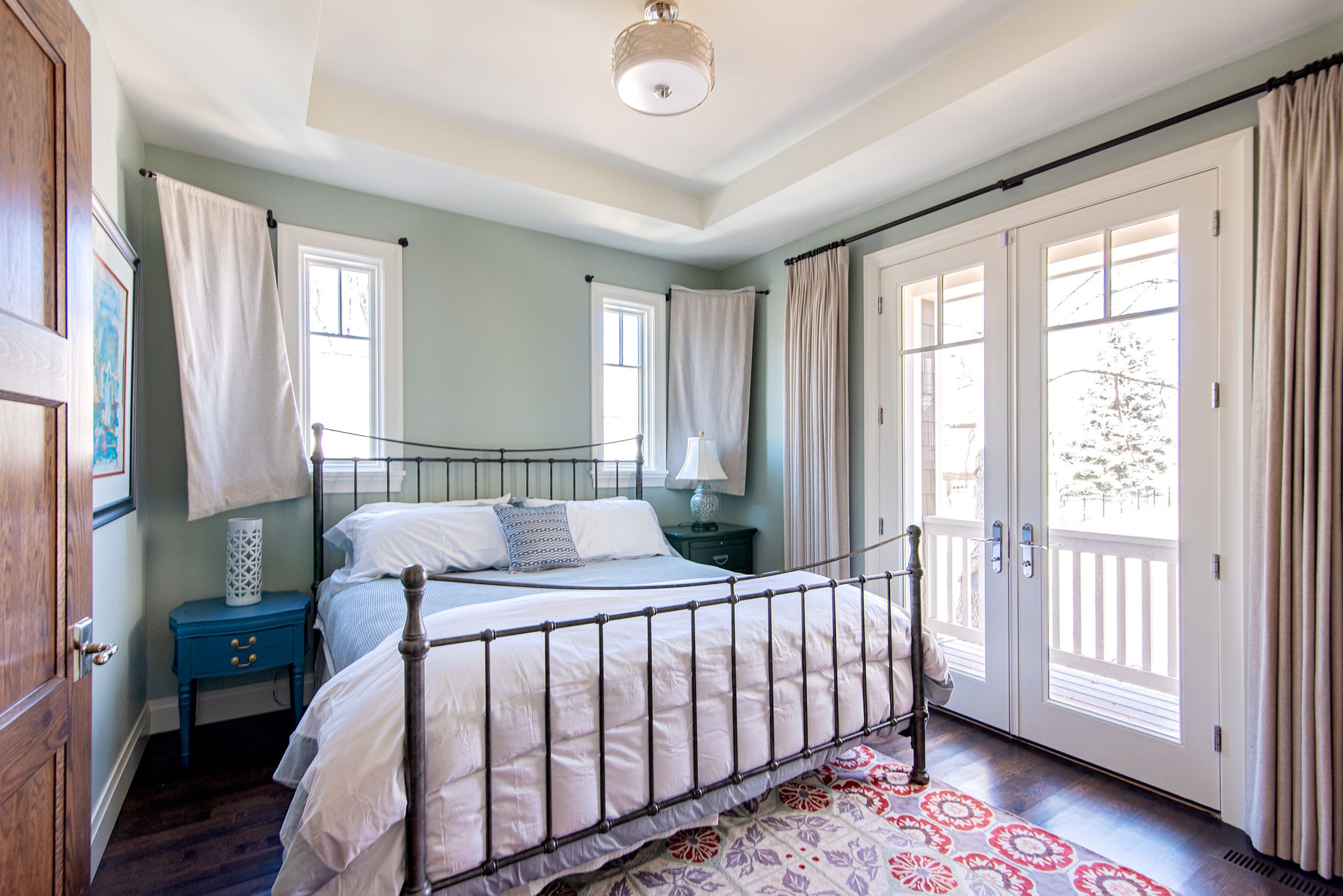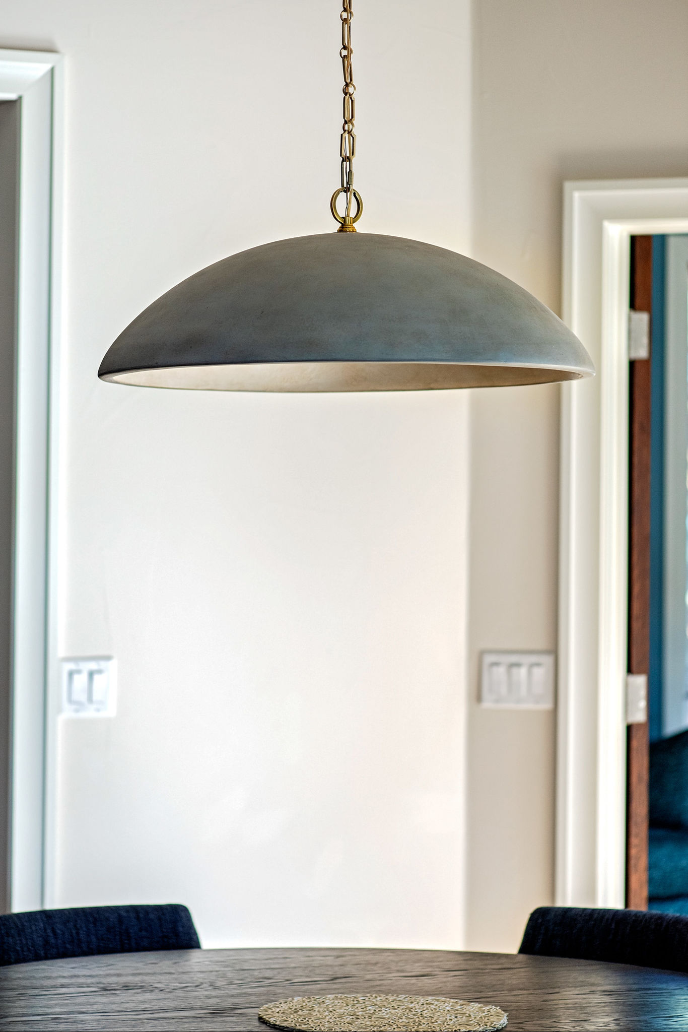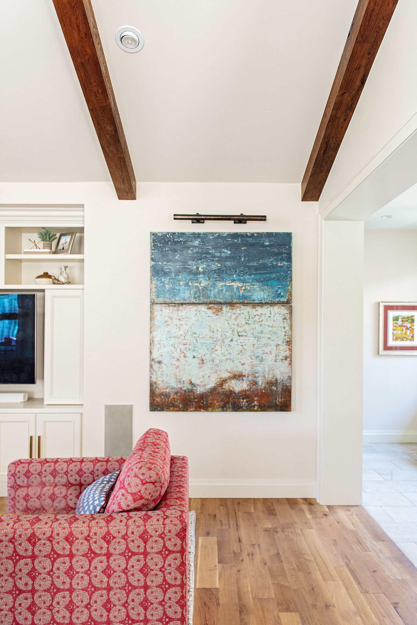 The striking kitchen & living room are the center of the home, creating a superb space for entertaining. The custom-designed kitchen boasts solid wood cabinets, honed quartz countertops, a handcrafted stove hood, six-burner stove, and farmhouse sink.