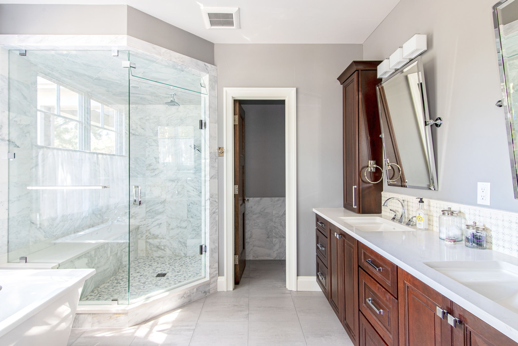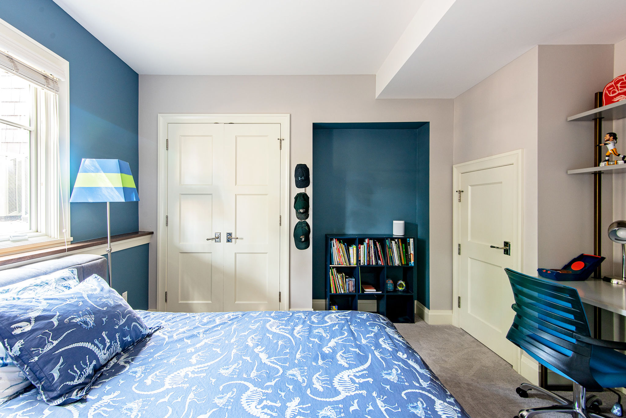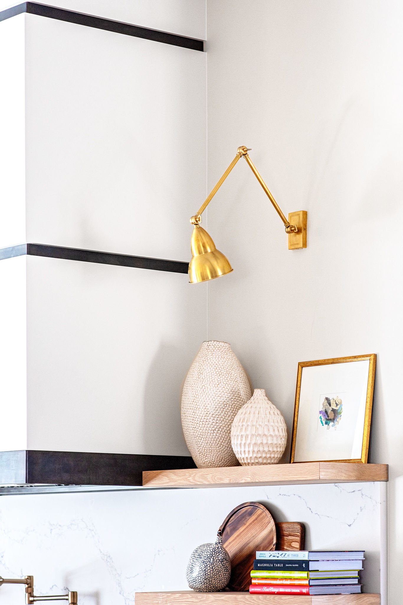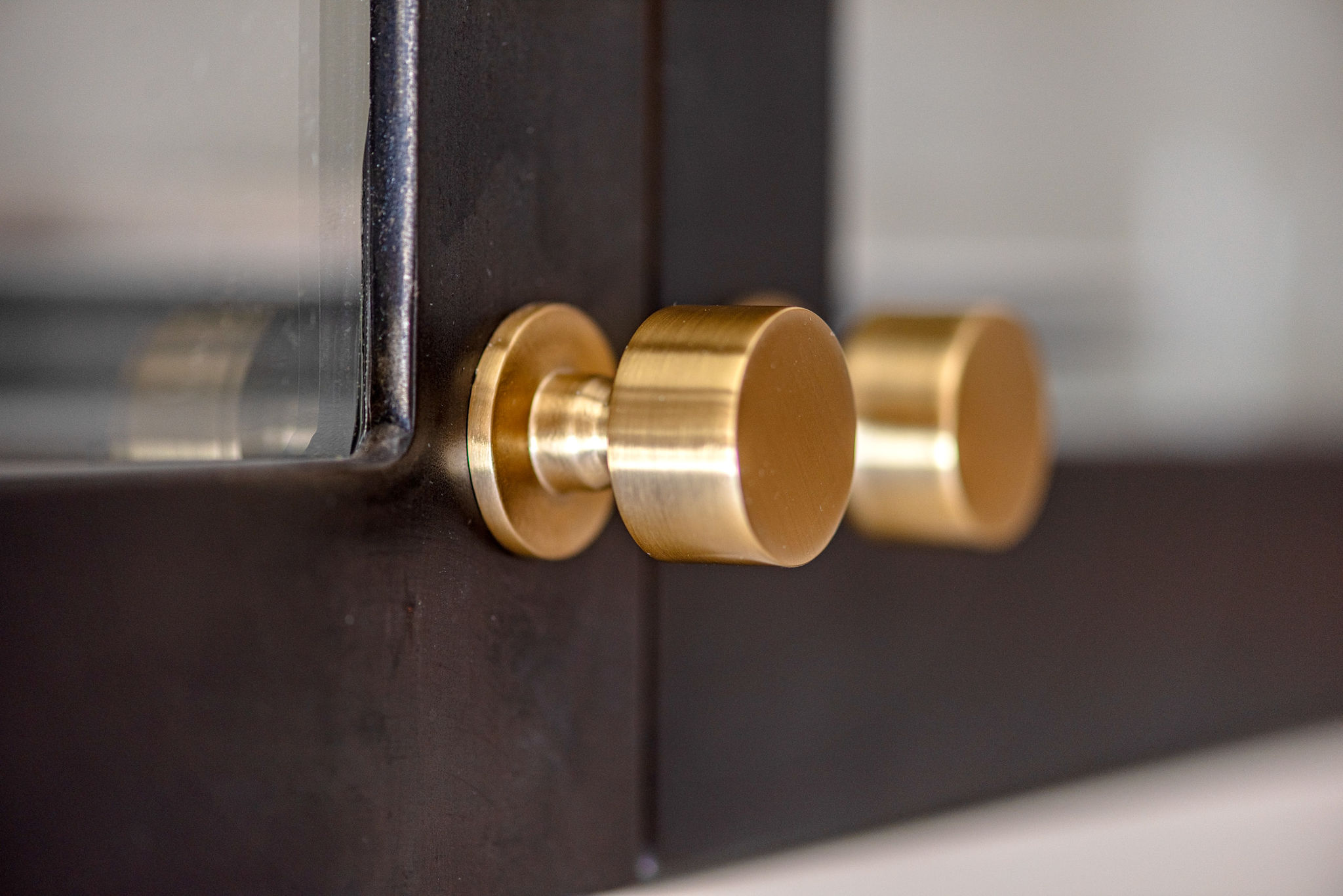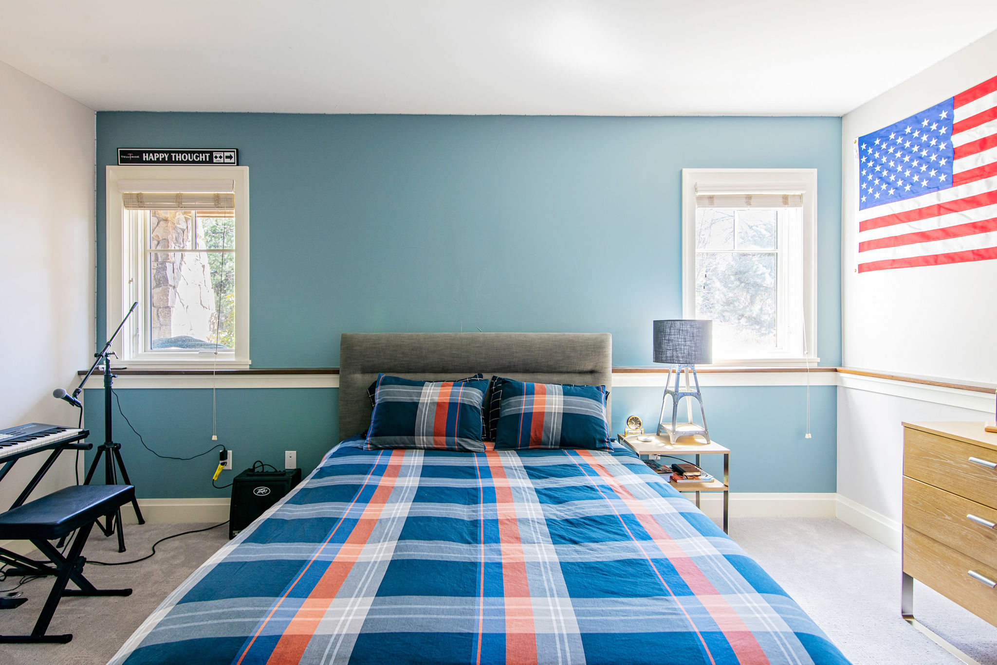 The striking kitchen & living room are the center of the home, creating a superb space for entertaining. The custom-designed kitchen boasts solid wood cabinets, honed quartz countertops, a handcrafted stove hood, six-burner stove, and farmhouse sink.