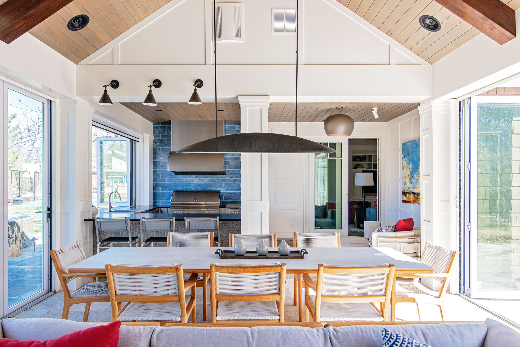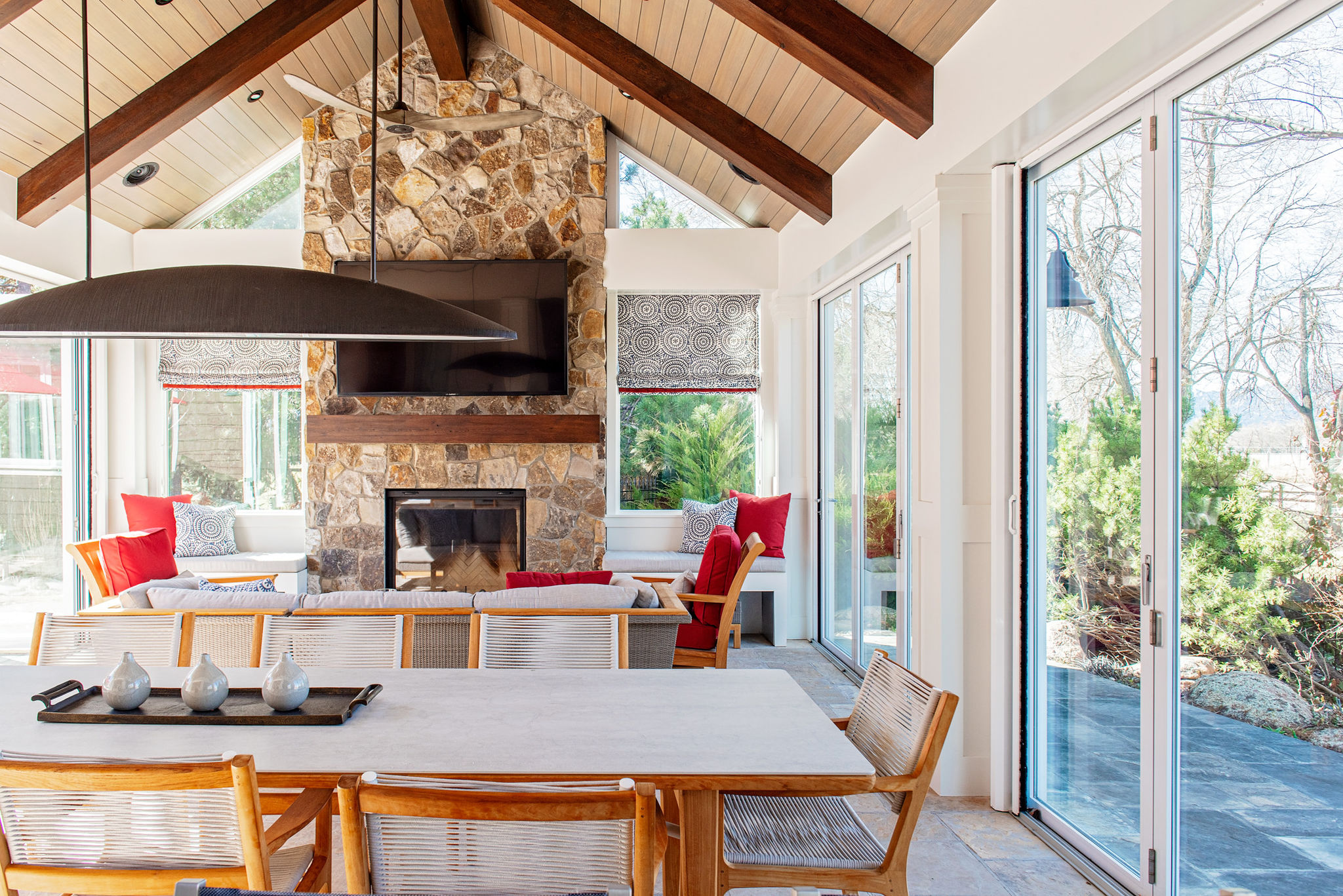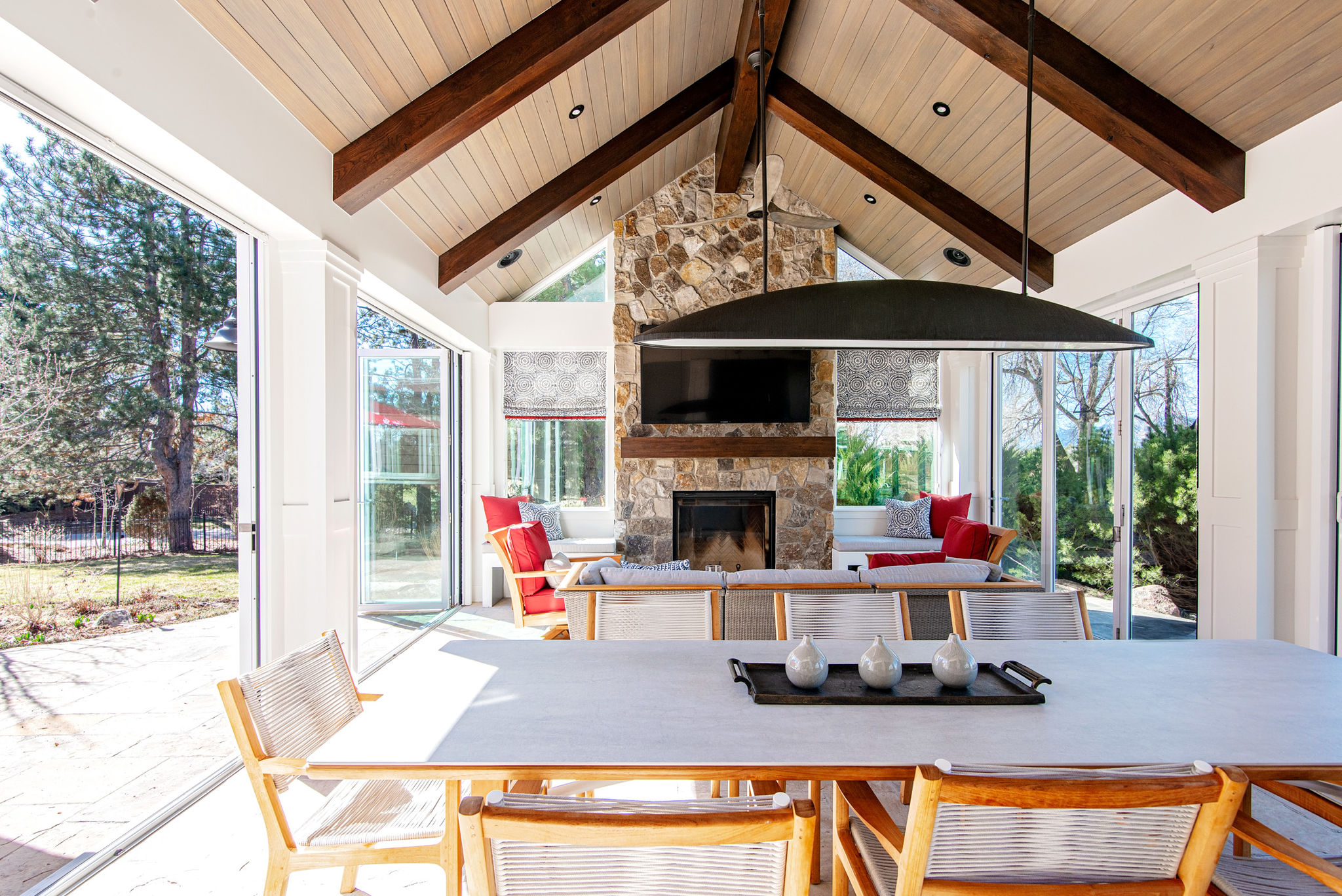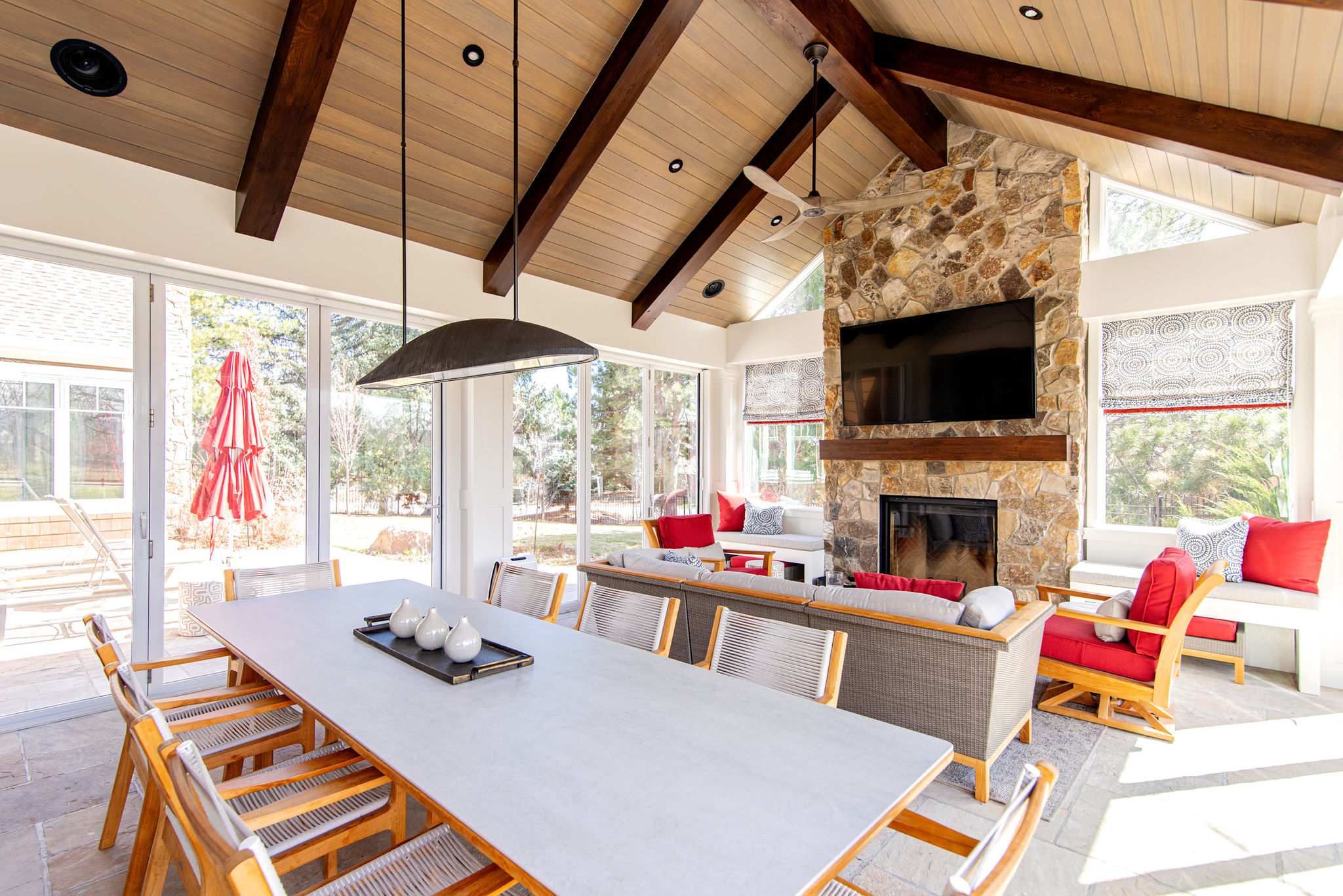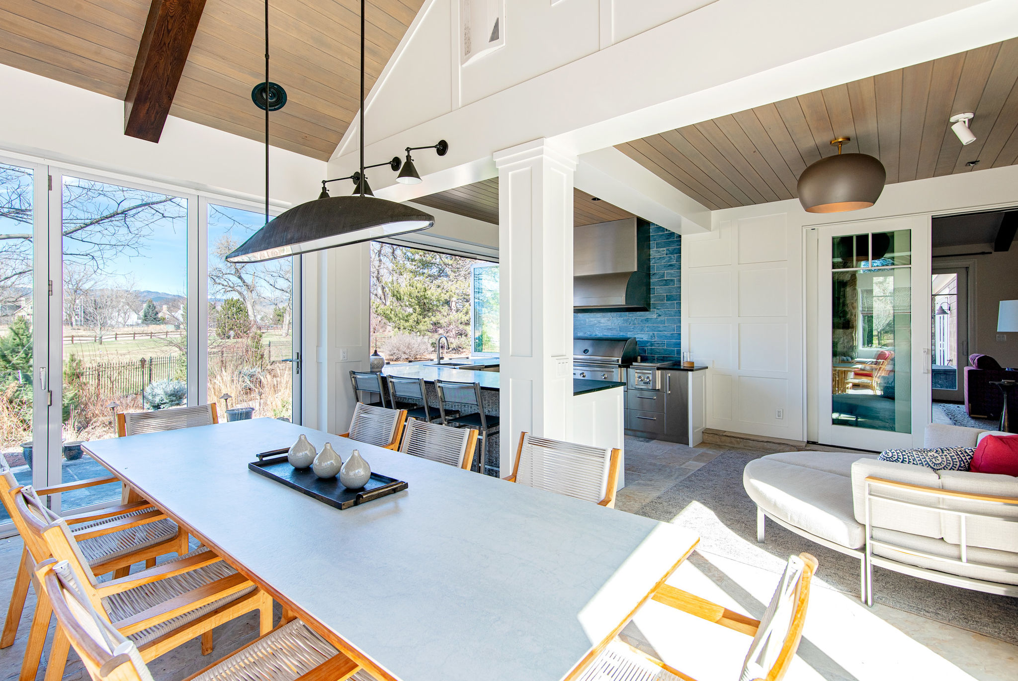 The stunning four-season room with tongue and groove ceilings, floor to ceiling LaCantina folding doors and full kitchen allow enjoyment of the outdoors any time of the year.