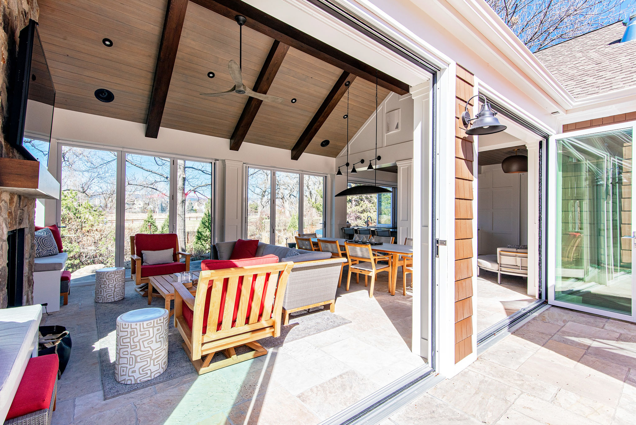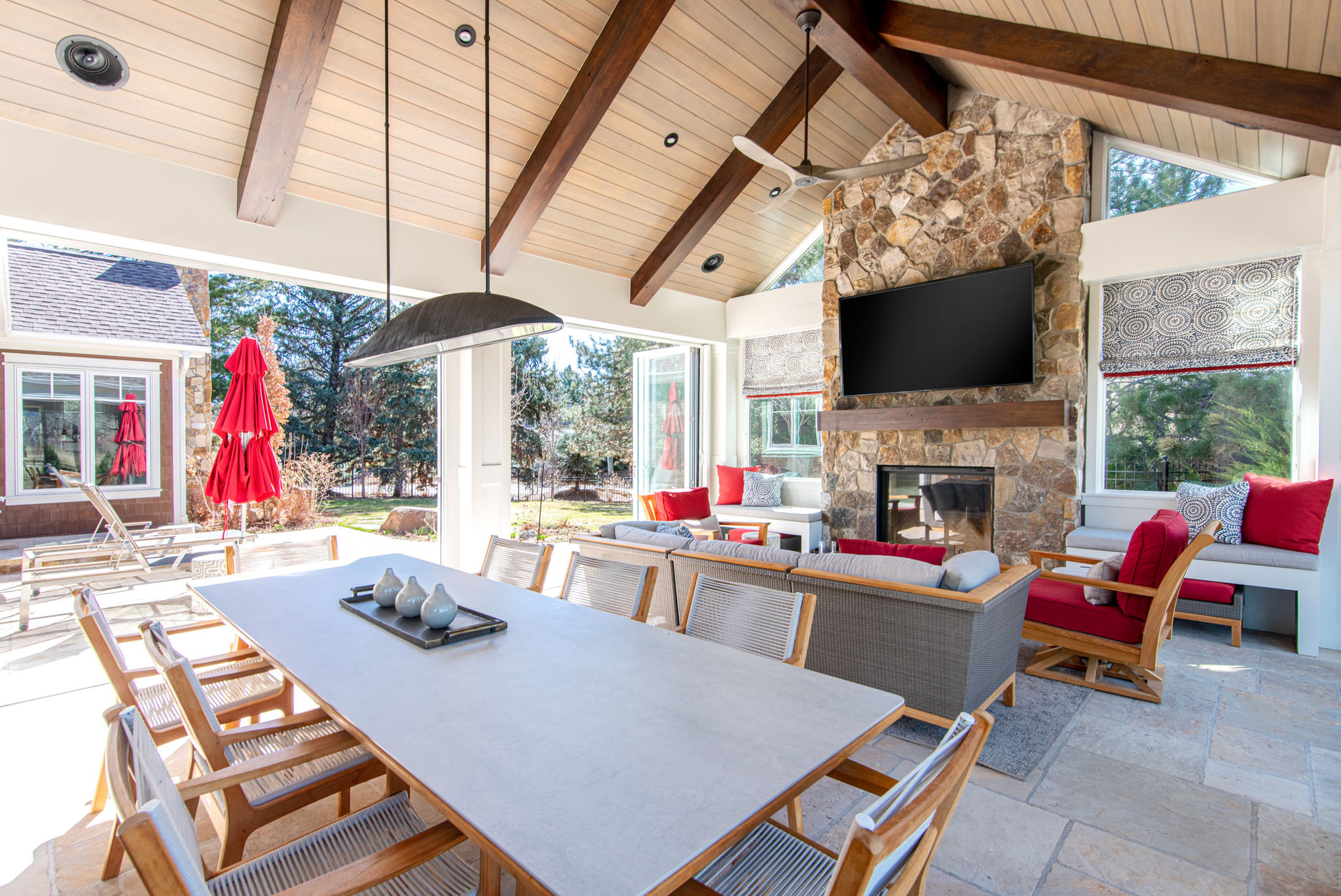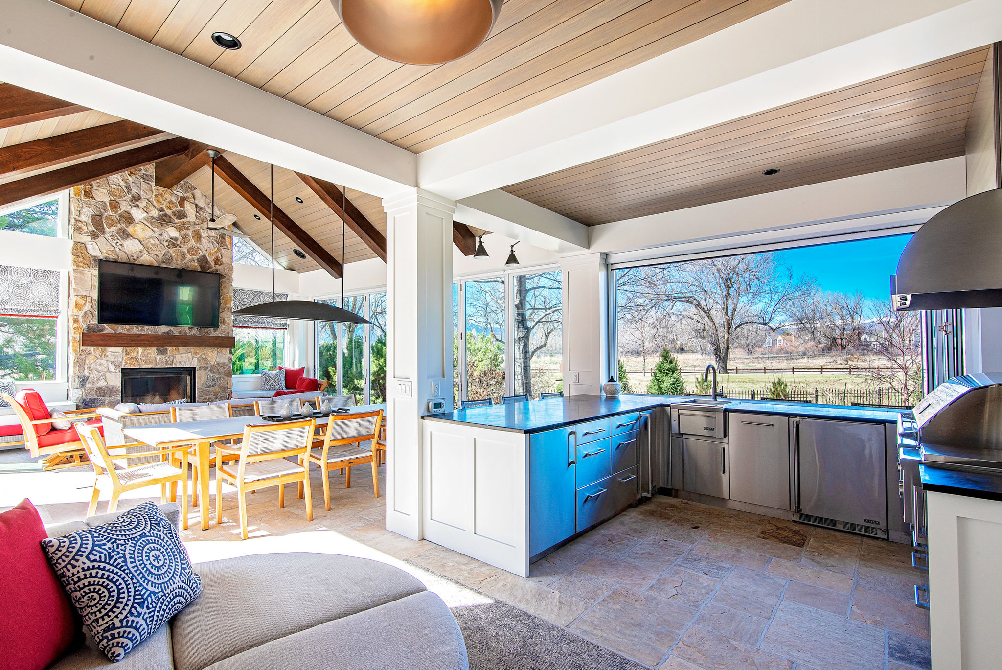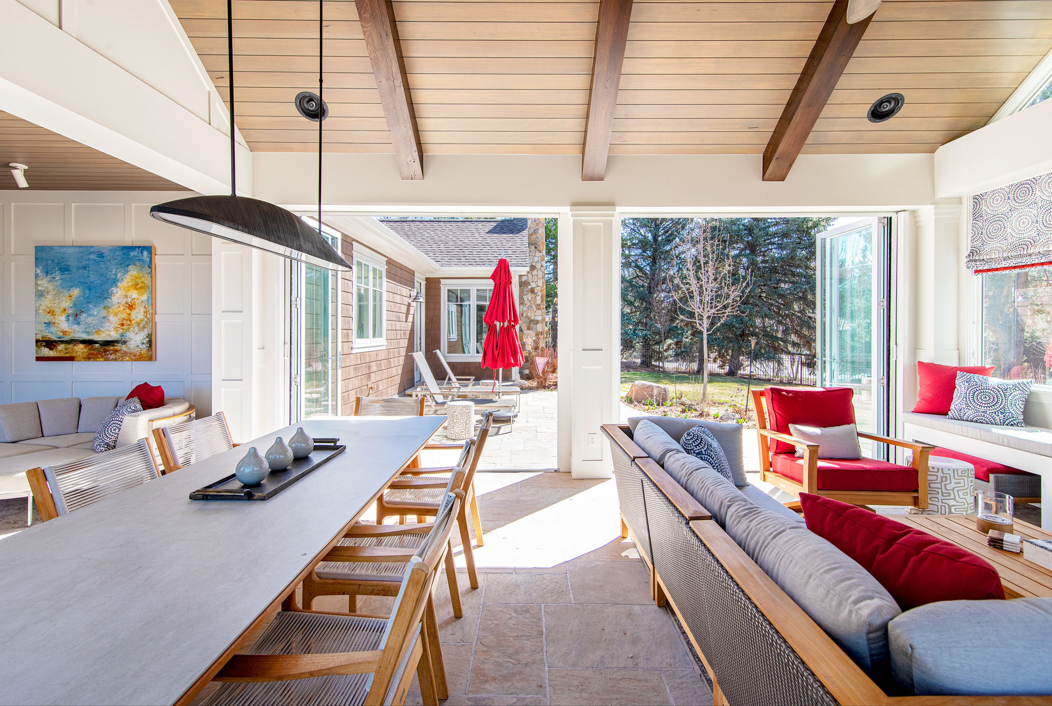 The stunning four-season room with tongue and groove ceilings, floor to ceiling LaCantina folding doors and full kitchen allow enjoyment of the outdoors any time of the year.