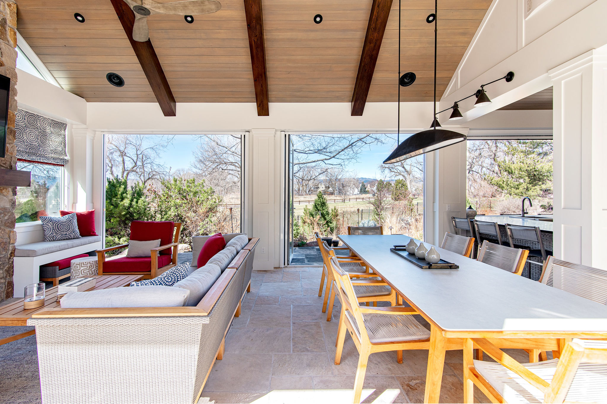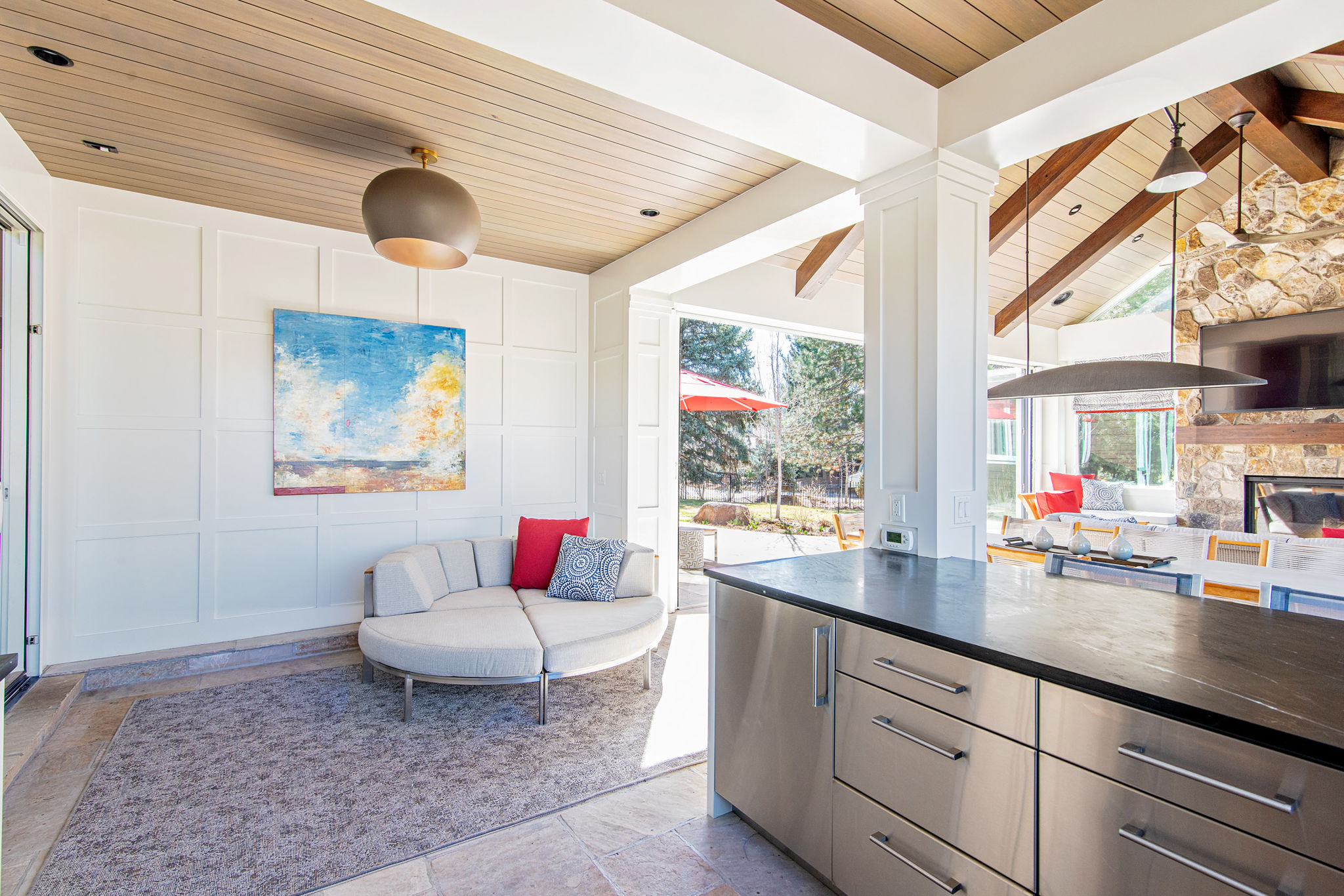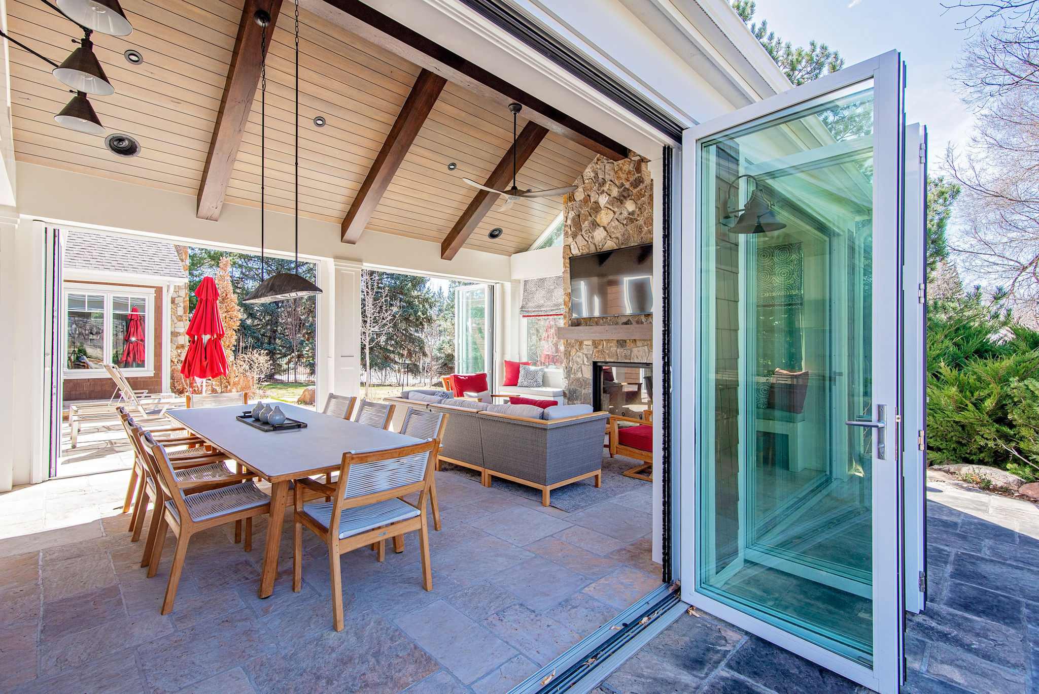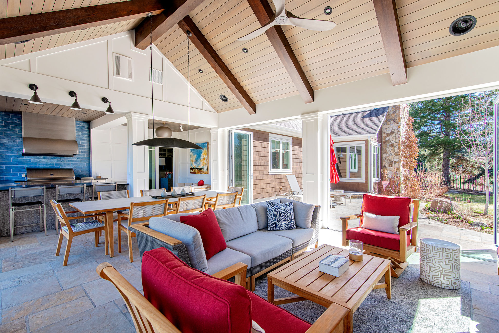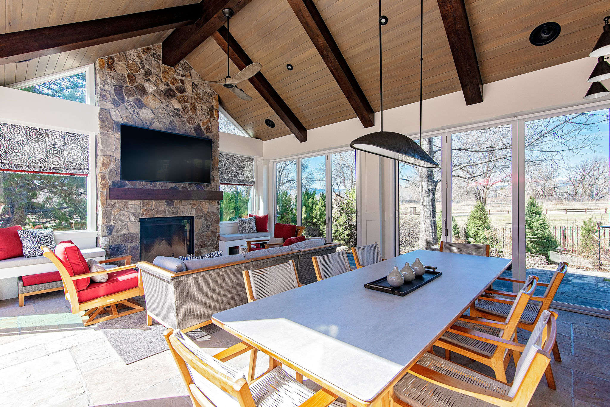The stunning four-season room with tongue and groove ceilings, floor to ceiling LaCantina folding doors and full kitchen allow enjoyment of the outdoors any time of the year.
