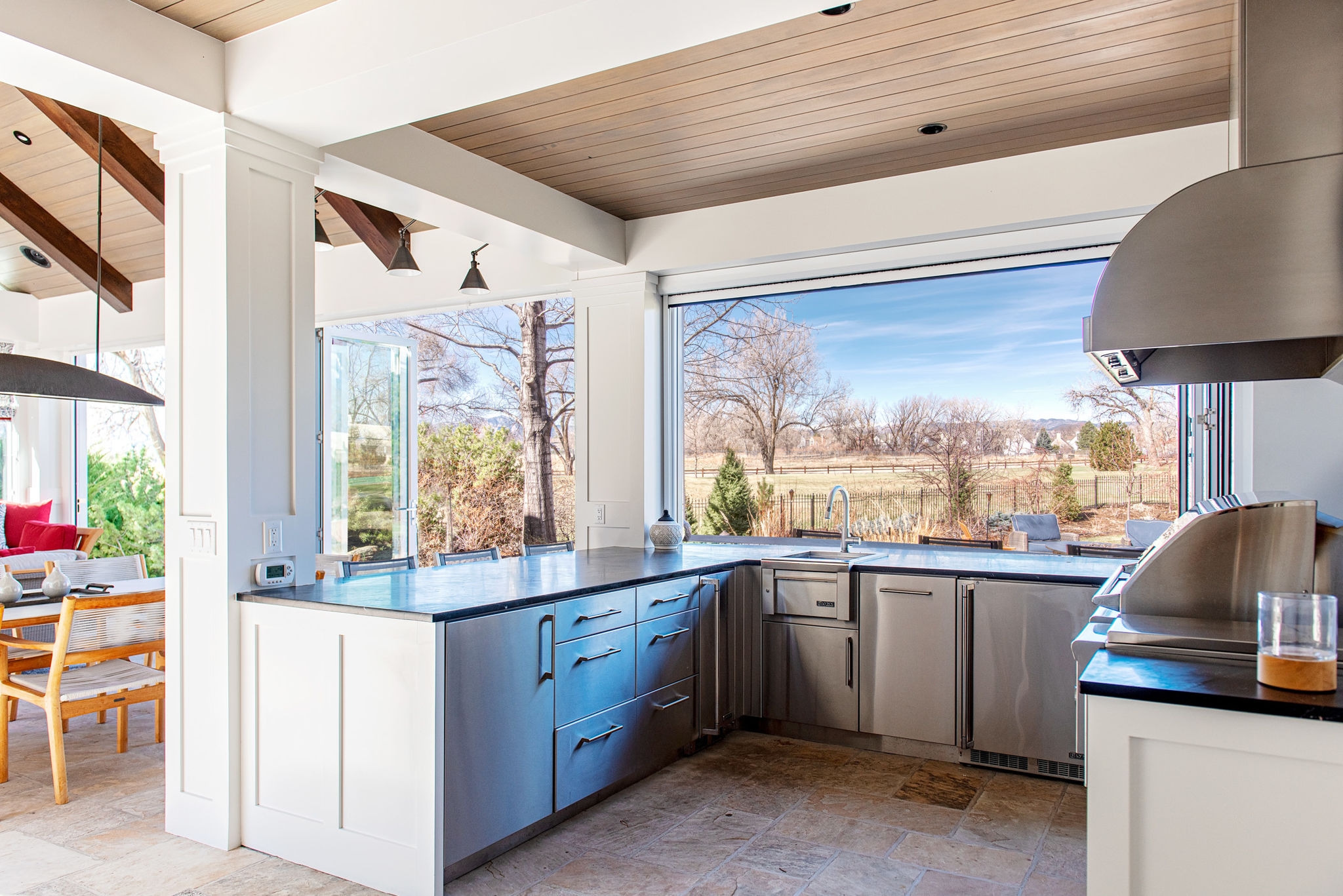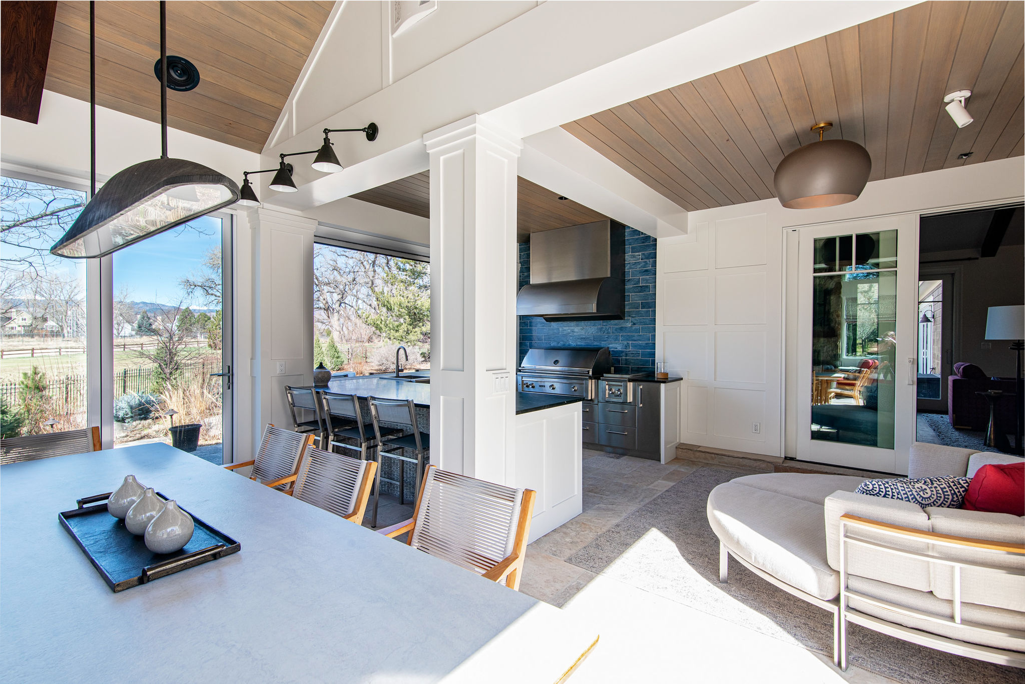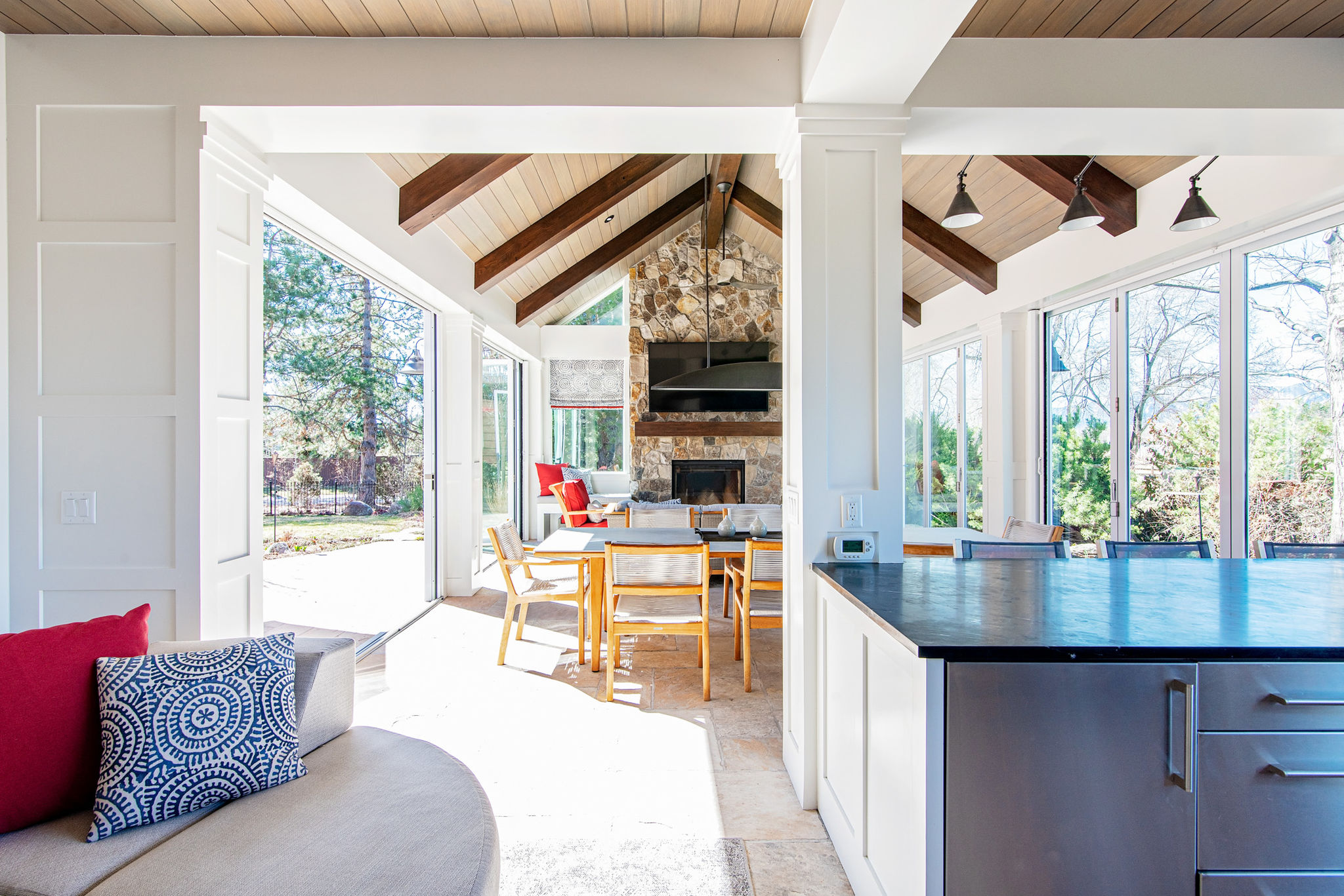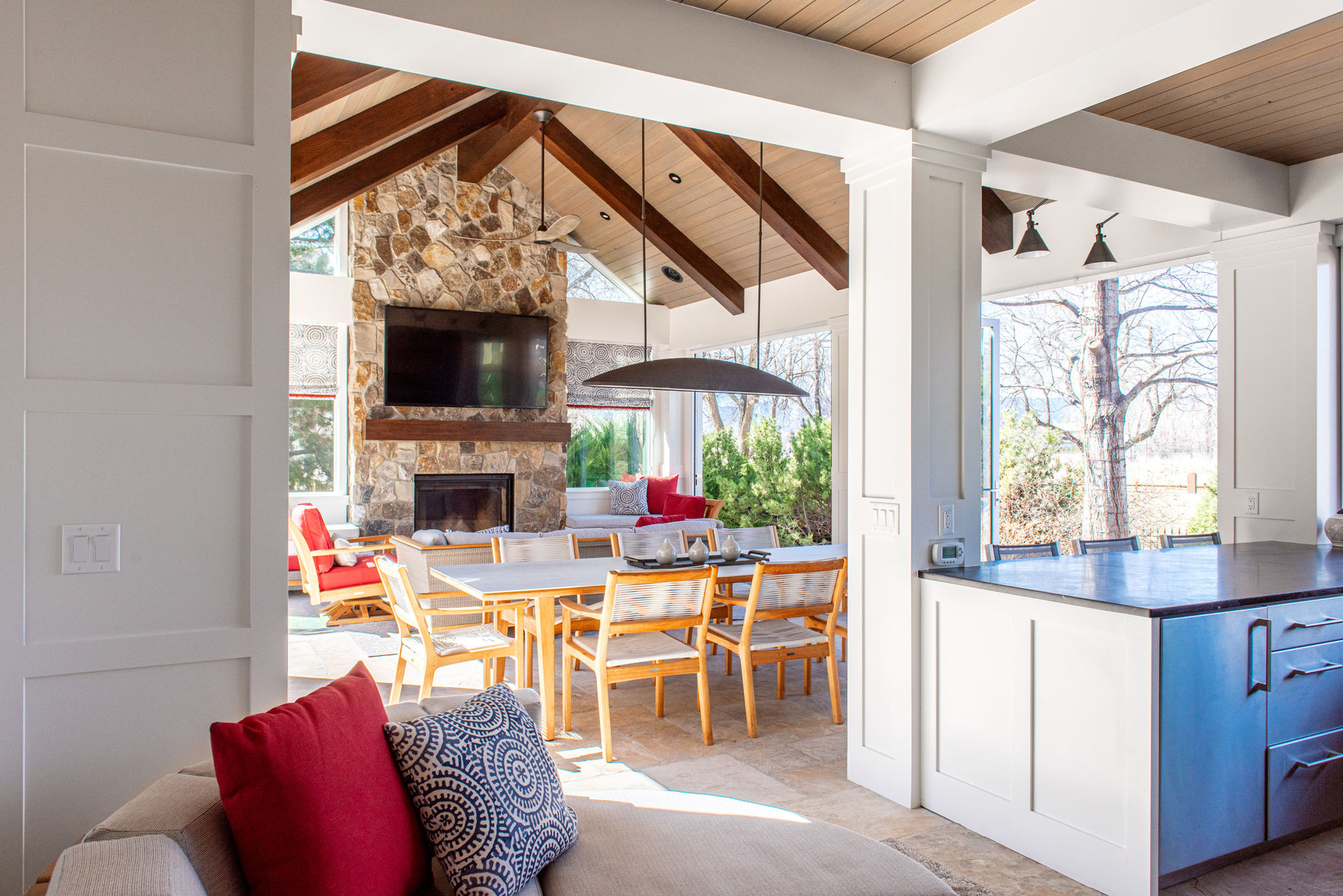 The stunning four-season room with tongue and groove ceilings, floor to ceiling LaCantina folding doors and full kitchen allow enjoyment of the outdoors any time of the year.