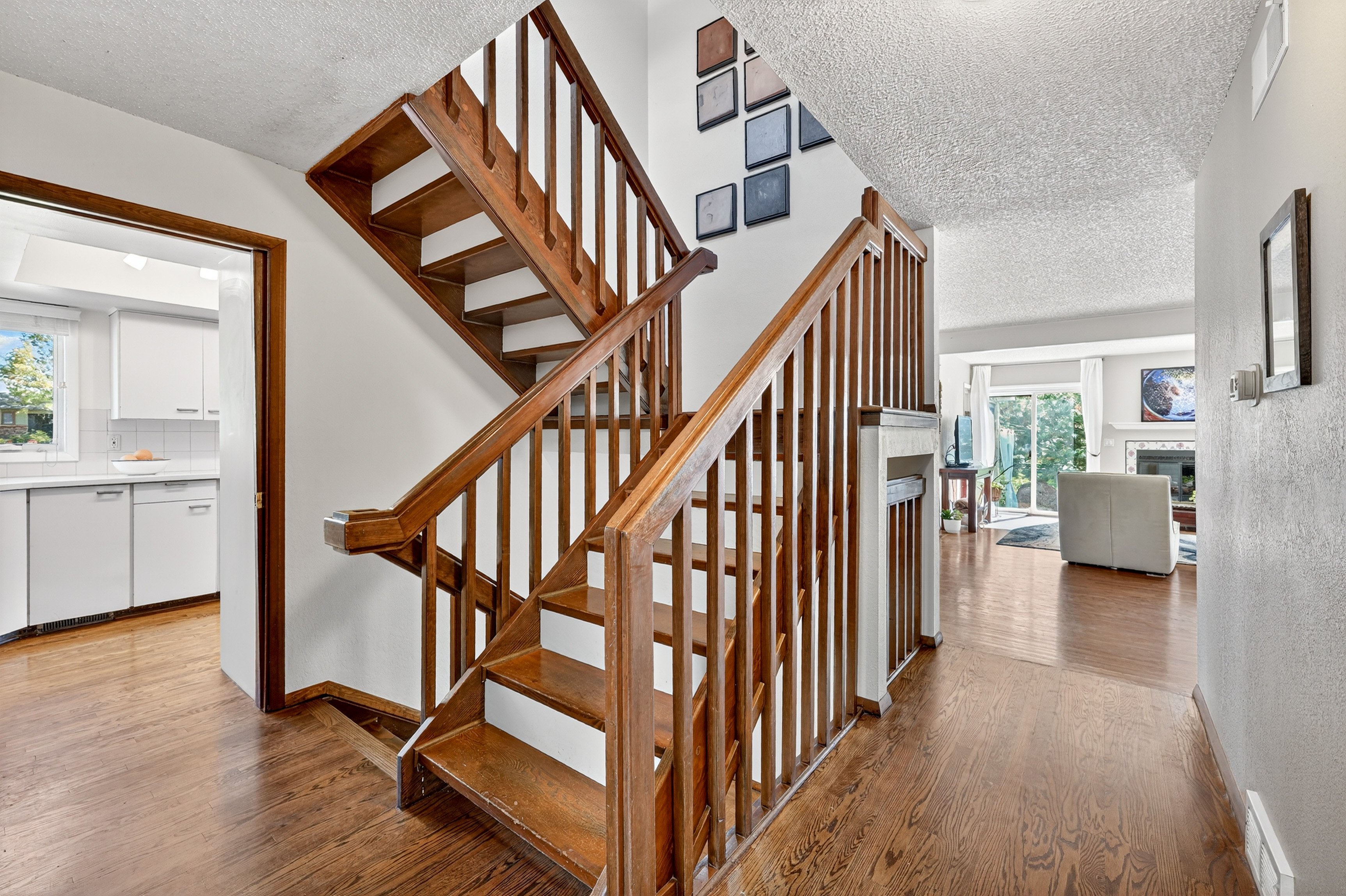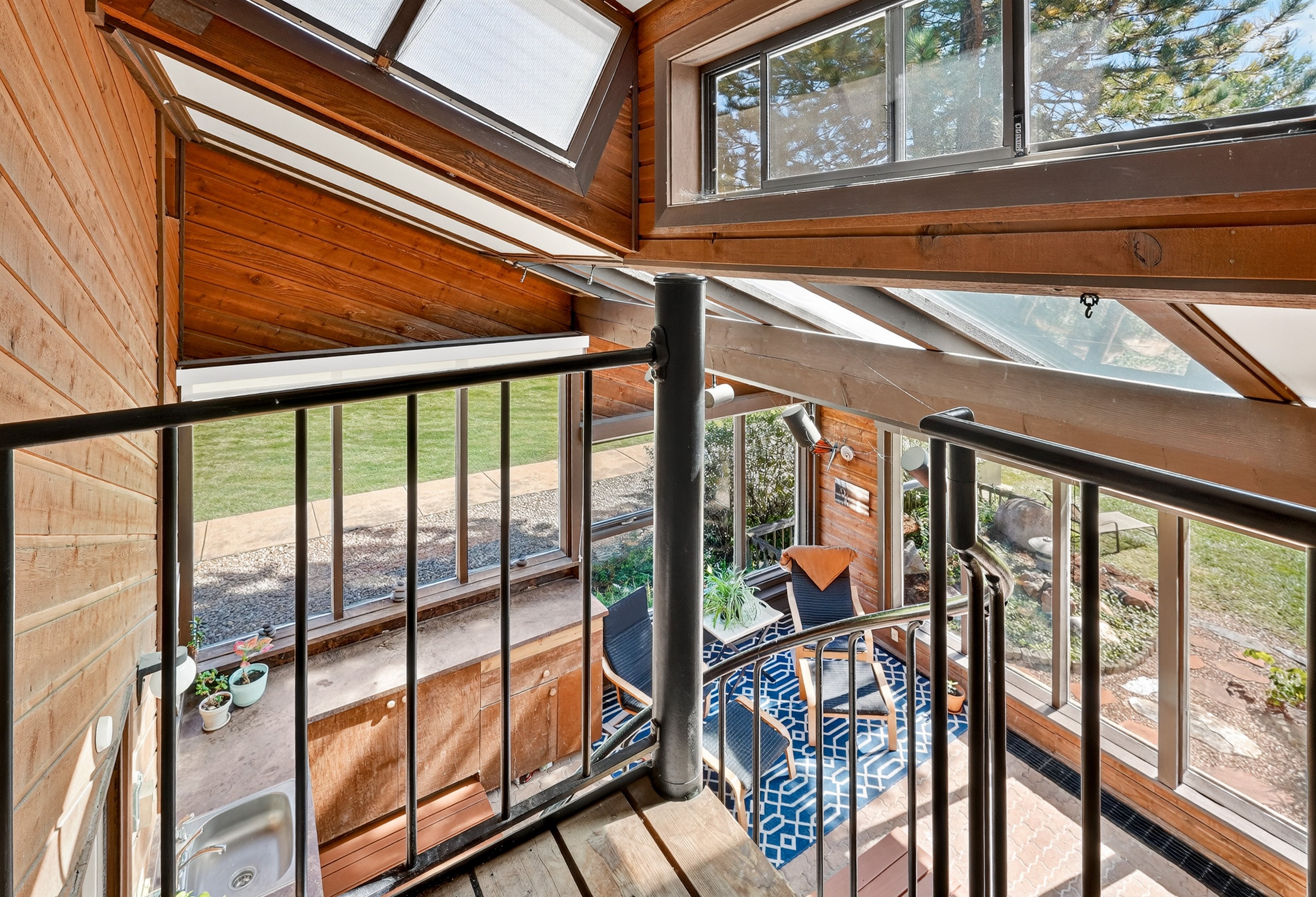 Newly renovated stairs include wood-and-laminate flooring. A glass wall creates a stunning open concept on the top-level landing.