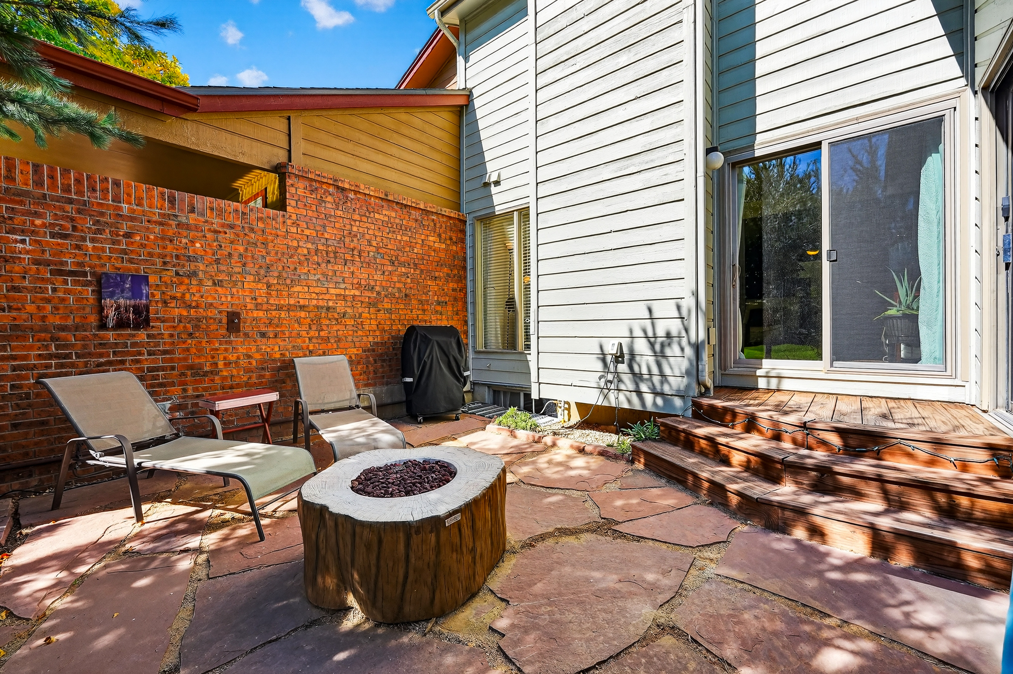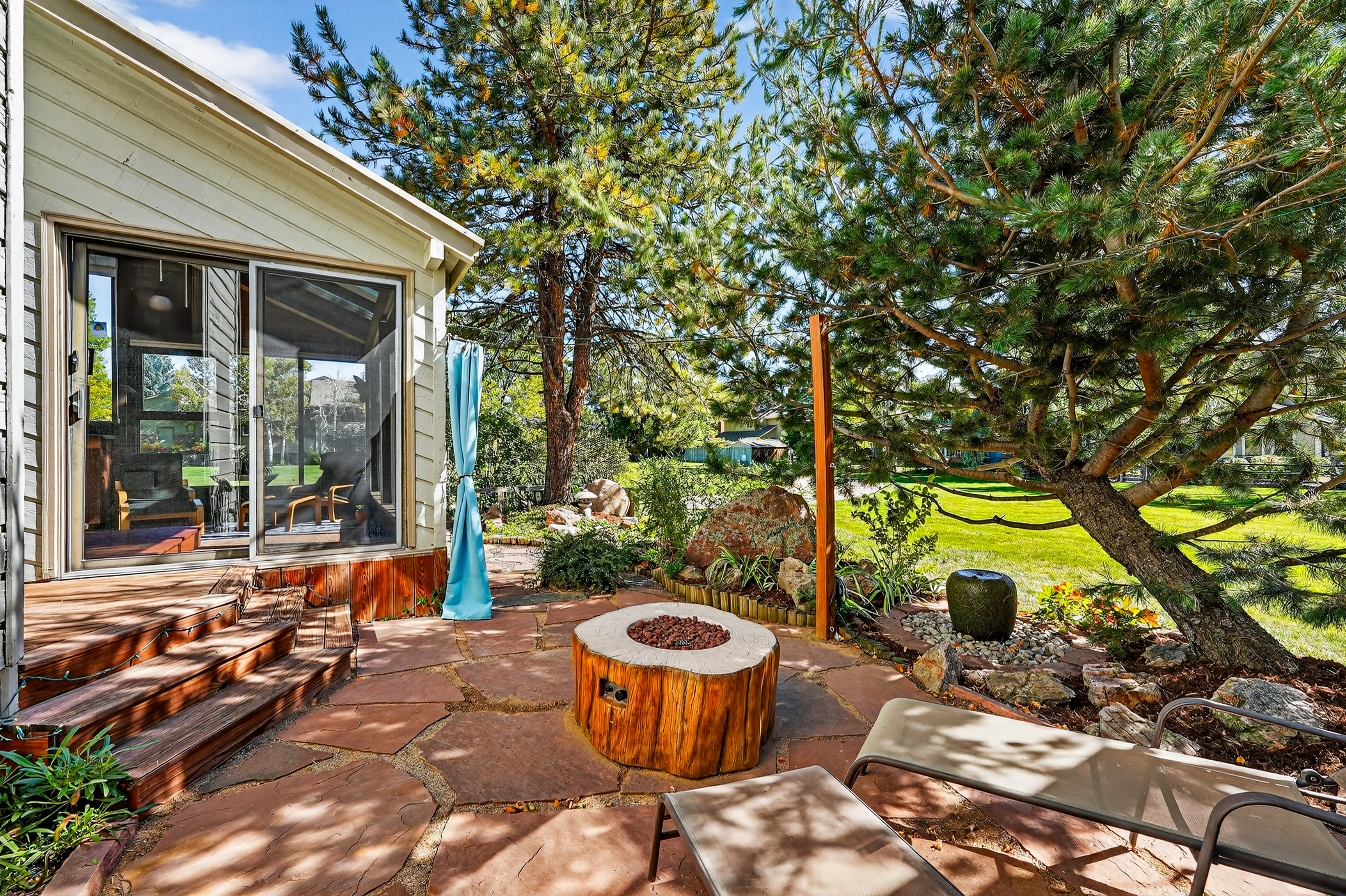 The main level connects seamlessly to the sunroom, dining, and living areas, where a gas fireplace anchors cozy gatherings. A private deck, new flagstone patio with a gas firepit, and low-maintenance gardens with sprinklers and drip irrigation create a serene outdoor retreat.